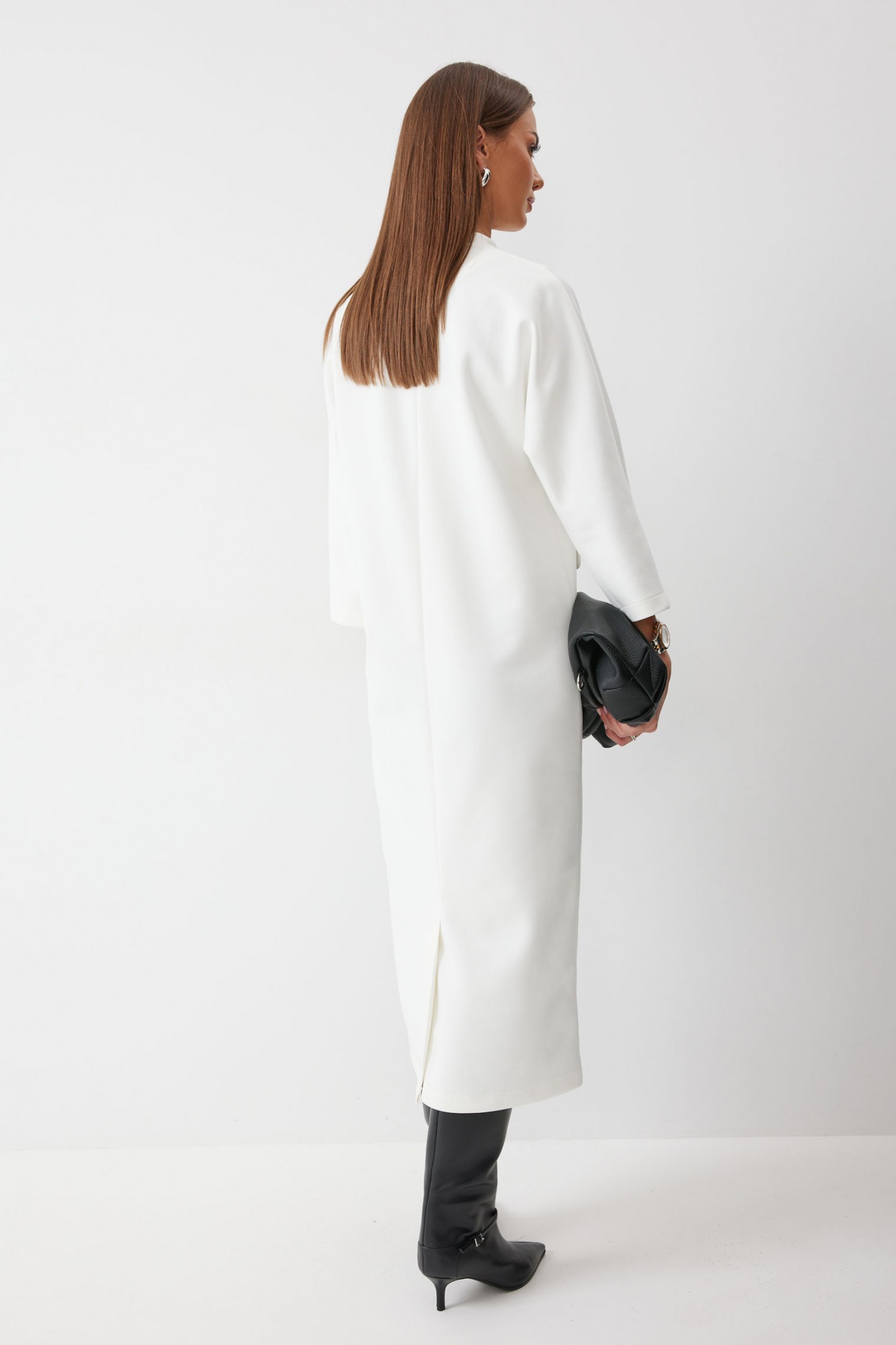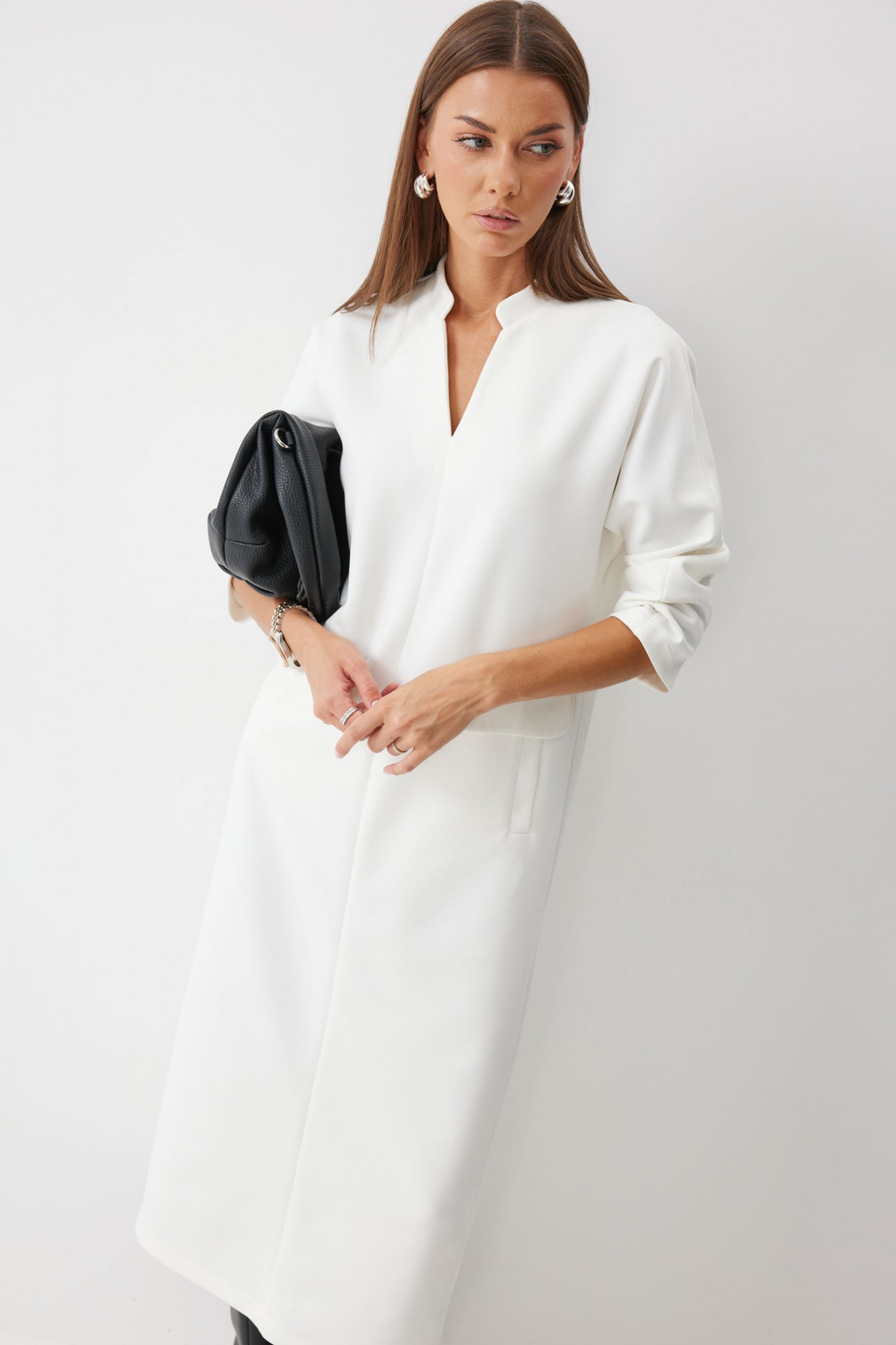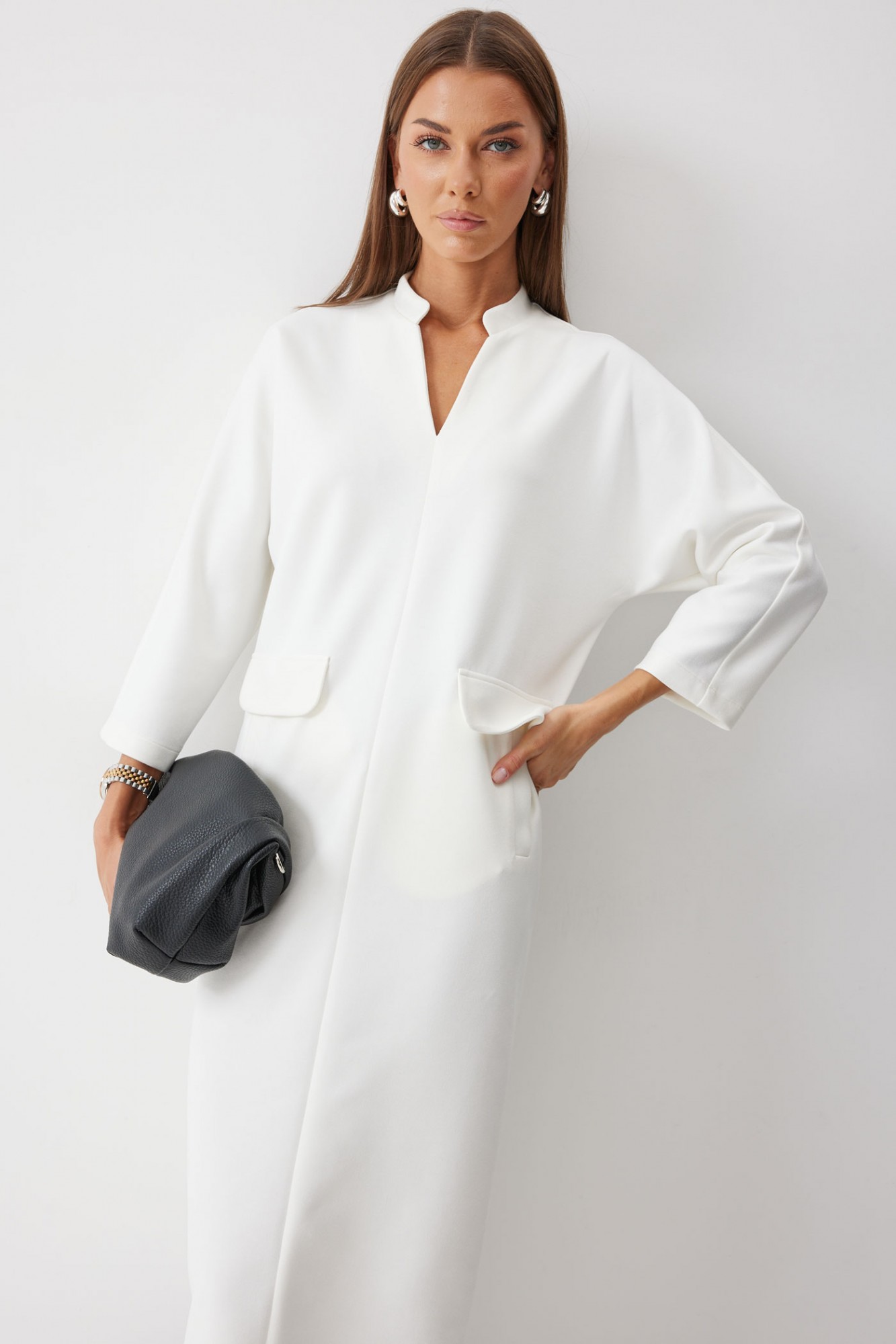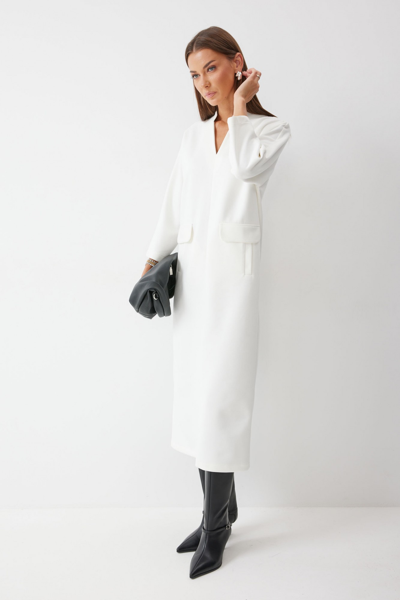 Платье прямого силуэта из трикотажного полотна длины миди. Рукав цельнокроеный, длиной ¾. Воротник-стойка. На передних половинках обработаны прорезные карманы с втачной листочкой и декоративным клапаном. По спинке расположен центральный шов с шпицей по низу.