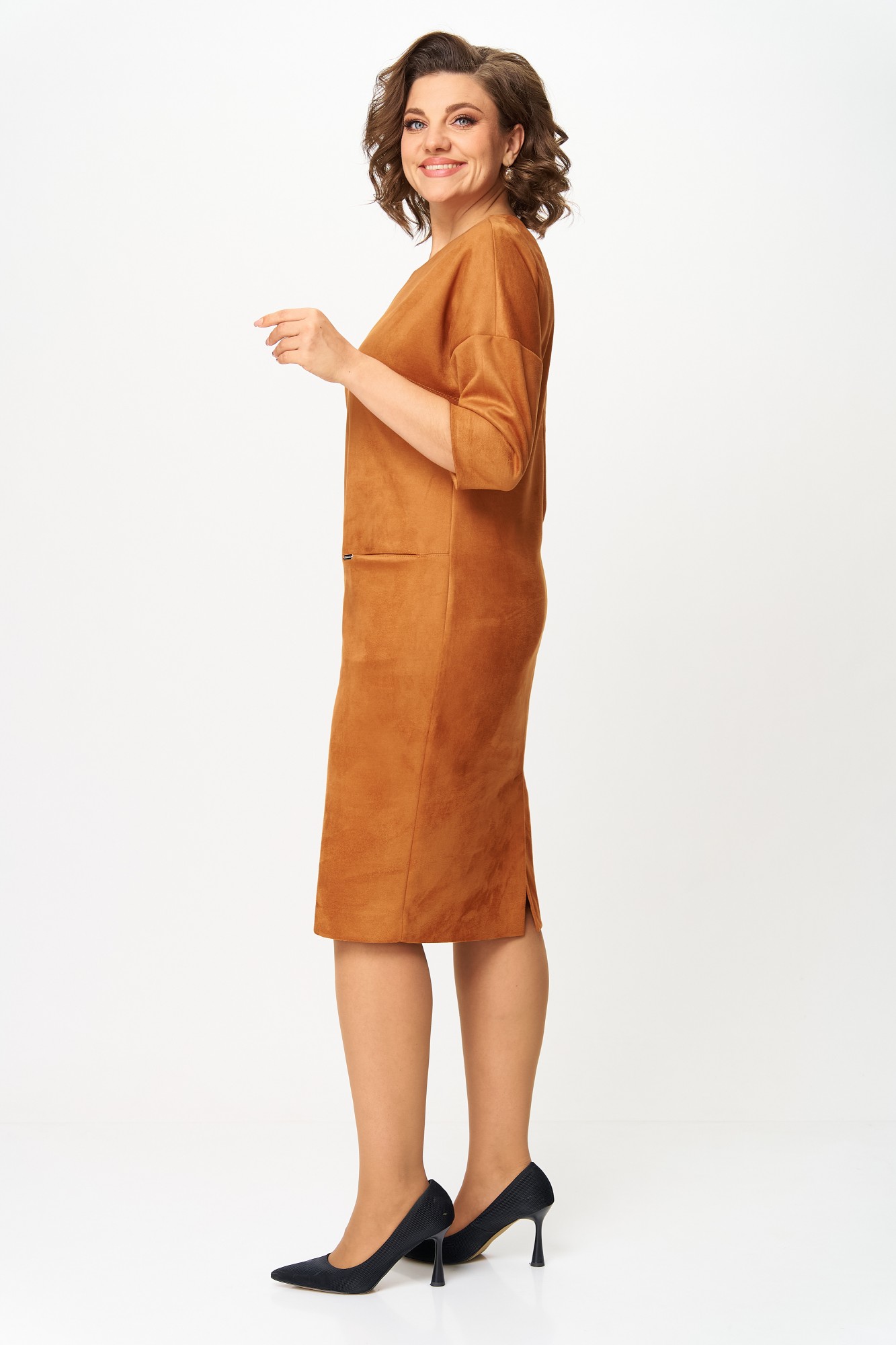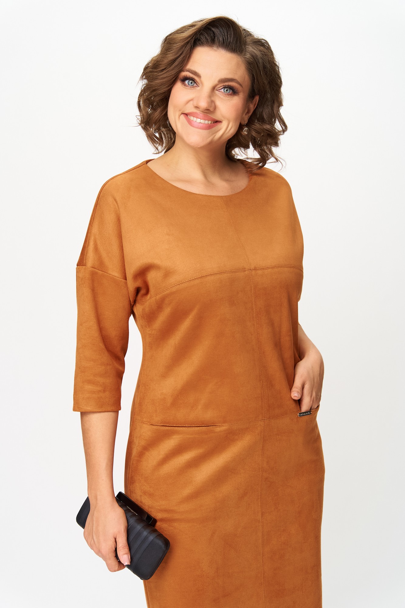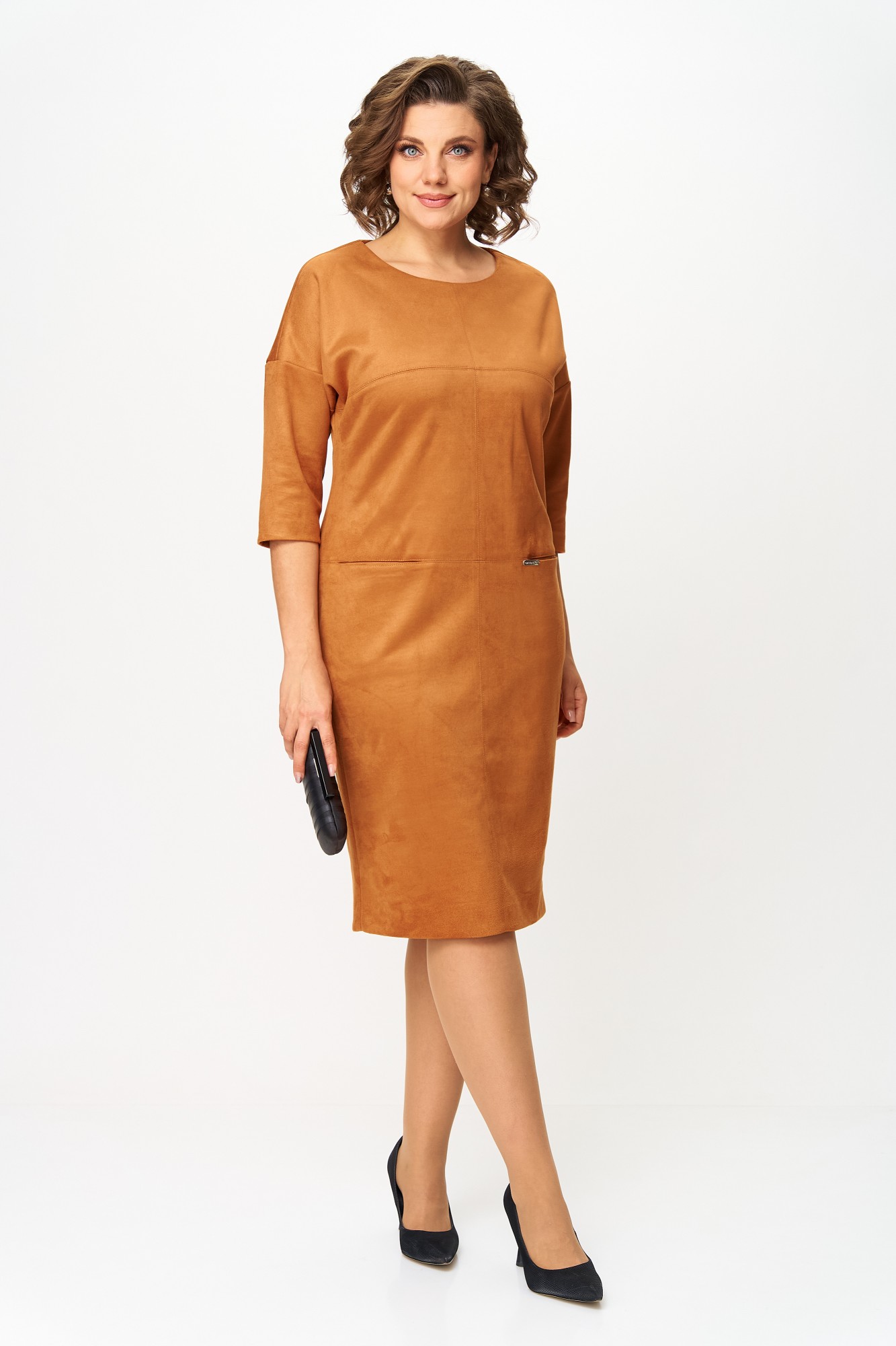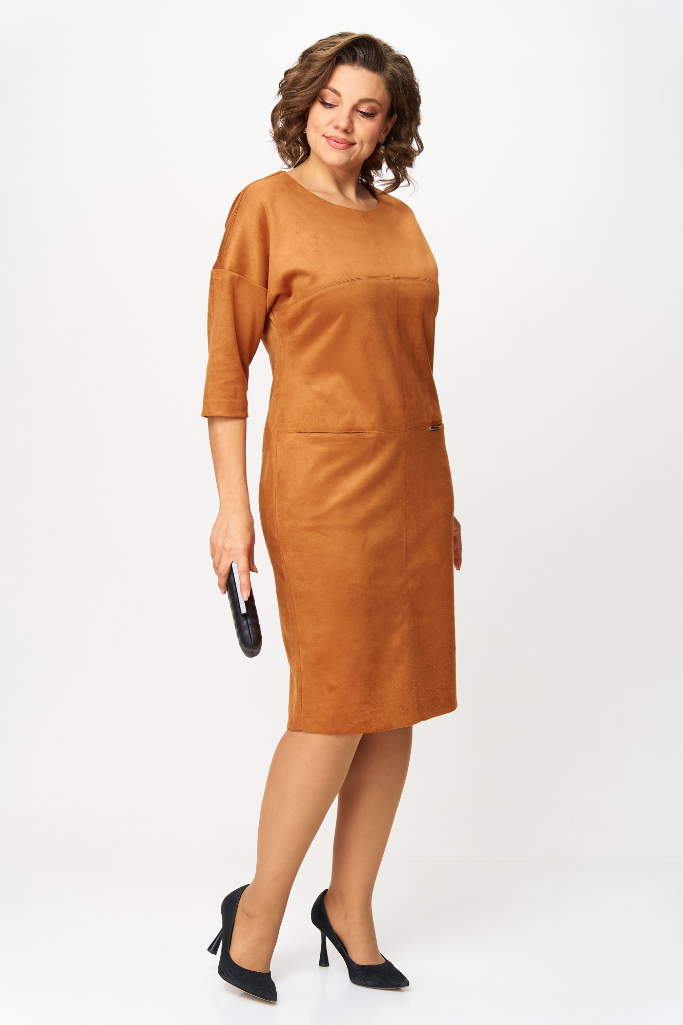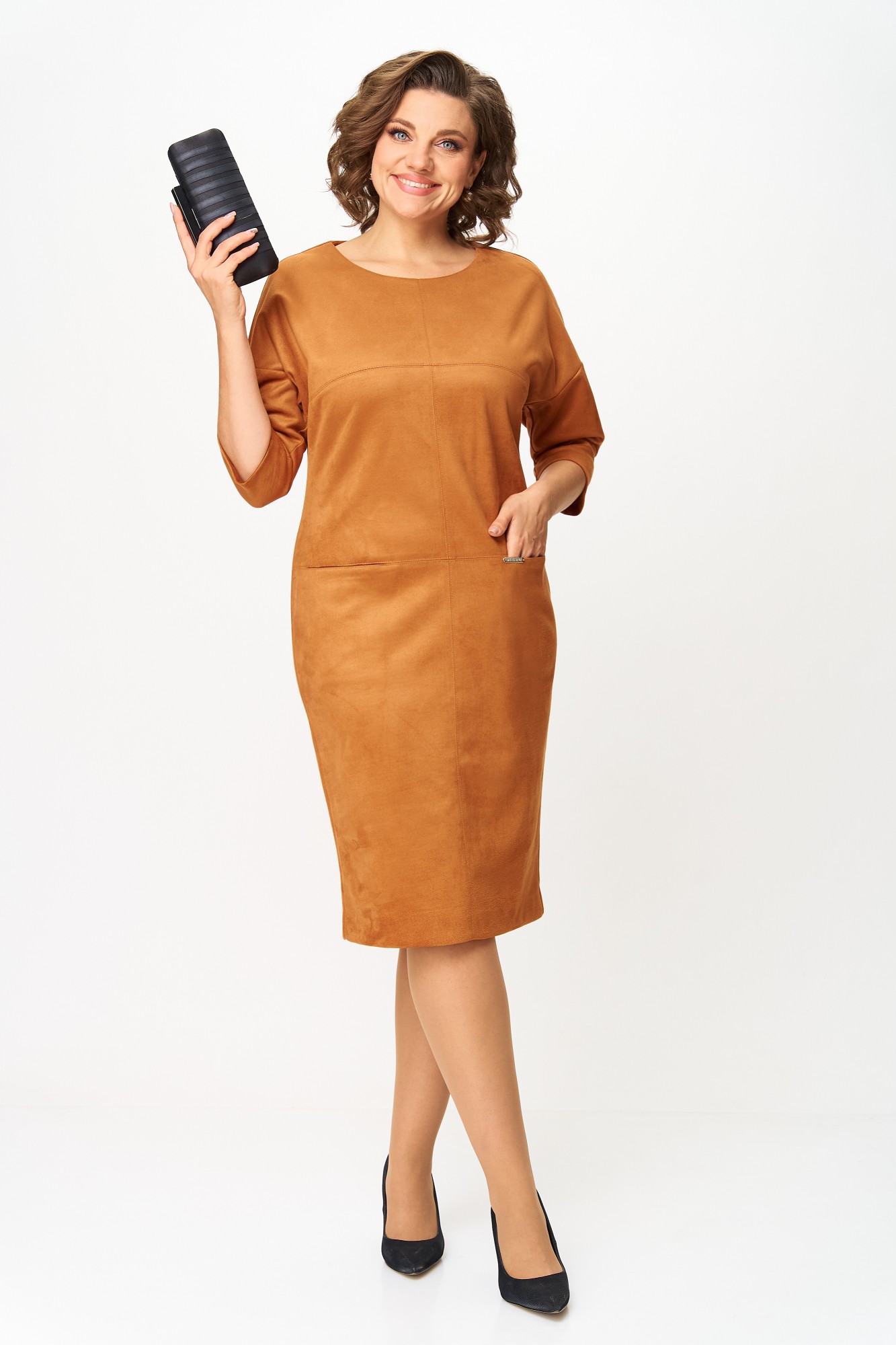 Элегантное платье прямого кроя из мягкого трикотажа с имитацией замши, приятной к телу. Приспущенный рукав 3/4, аккуратные декоративные швы и длина до колена визуально стройнят, а в передних швах спрятаны удобные карманы. Ткань имеет механический стрейч, держит форму, может слегка линять до первой стирки — рекомендуется постирать перед использованием. Универсальный дизайн легко сочетается с жакетами, пальто и аксессуарами.