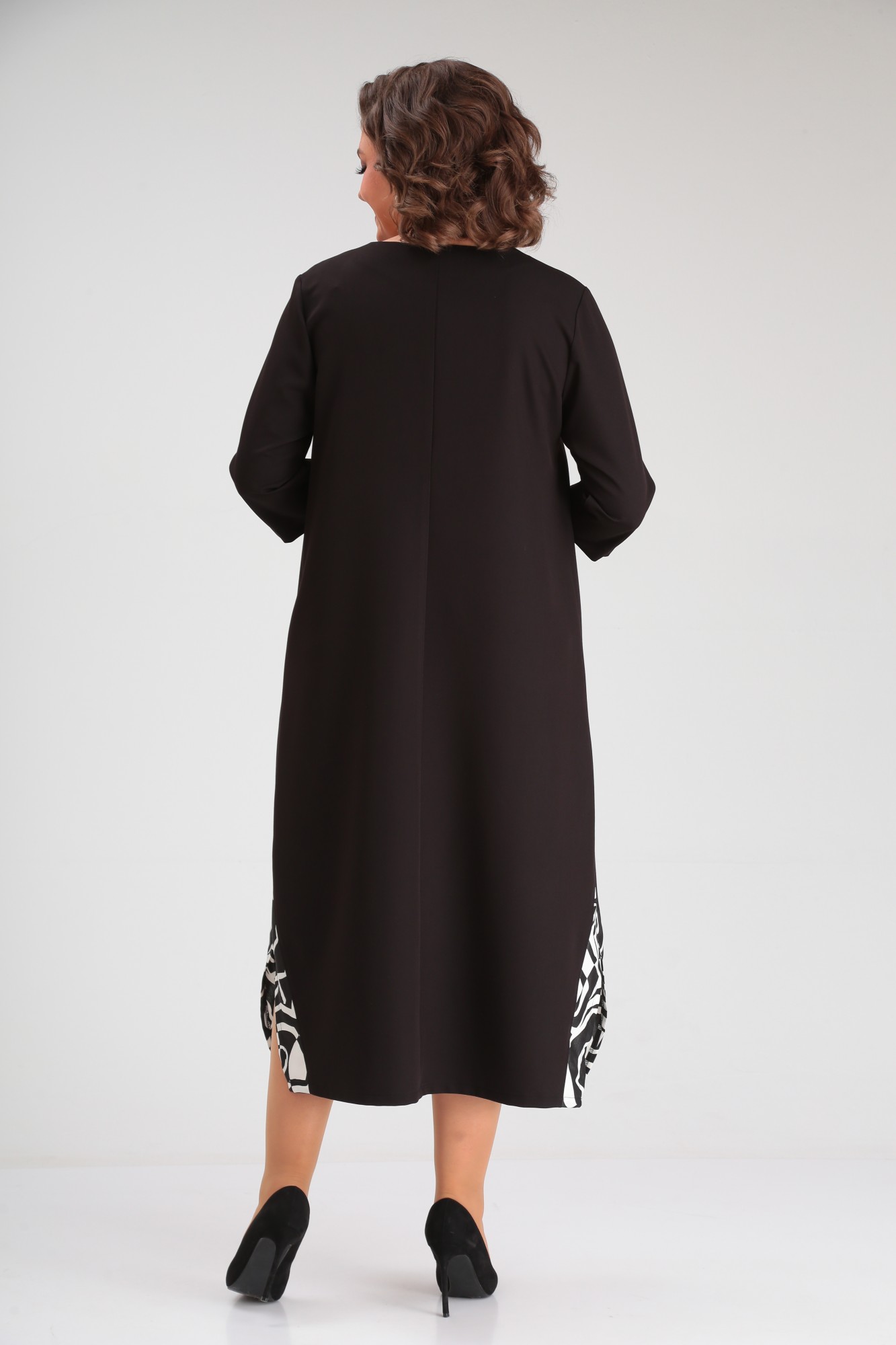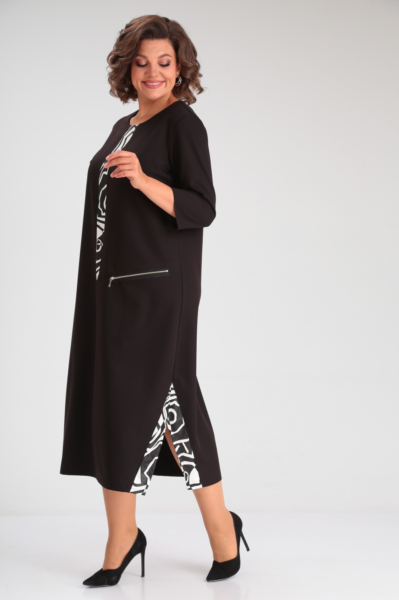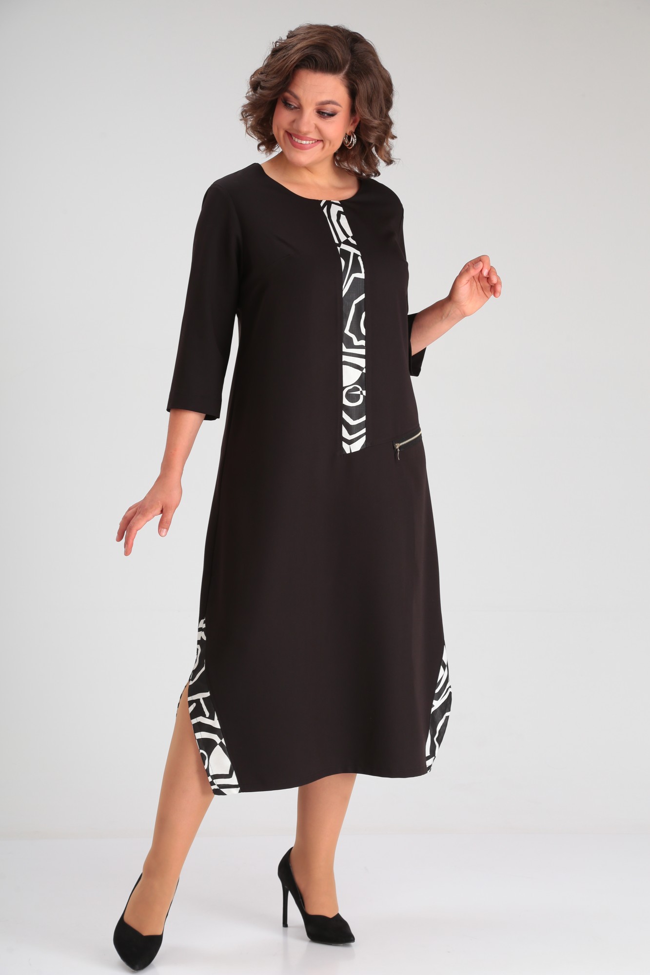 Платье в стиле casual предназначено для повседневной носки, прекрасно сочетается с любой по стилю обувью. Платье свободного кроя, ниже колена, рукав ¾. В качестве декора по переду изделия — вставлена планка из контрастной ткани, также имеется имитация кармана с декоративной молнией. По бокам изделия — разрезы, которые также обработаны контрастной тканью, в цвет декоративной планки.