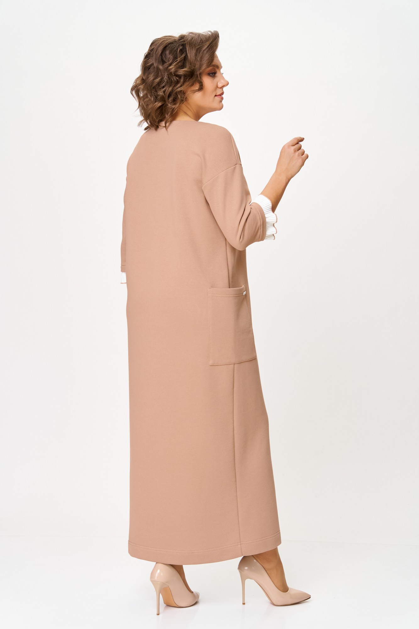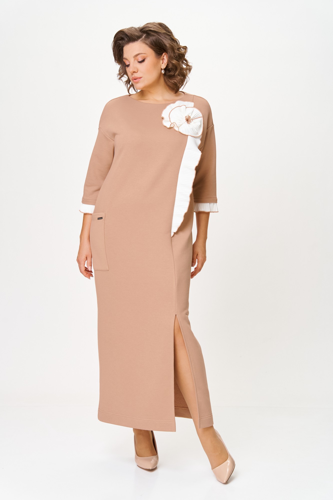 Комфортное и стильное женское трикотажное платье — универсальный наряд, идеально подходящий как для повседневных образов, так и для особых случаев. Выполненное в однотонной гамме, оно легко комбинируется с различными аксессуарами и обувью, создавая стильные и комфортные образы. Модель выполнена в прямом, полуприлегающем силуэте с эффектом спущенного плеча, что придает образу легкую непринужденность и женственность. Рукав втачной, одношовный длиной 3/4 с отделочной манжетой из подгибки — практичный и элегантный элемент. Круглый вырез горловины подчеркивает линию шеи и обеспечивает комфорт при носке. Спинка цельная, а передняя часть украшена нагрудными вытачками и левым рельефом с разрезом внизу. В рельеф вставлен декоративный волан-цветок из отделочной плиссеровки, который служит ярким акцентом и добавляет модели оригинальности. Длина платья — 7/8, что делает его универсальным для различных сезонов и ситуаций. По правой стороне расположен накладной карман — практичный элемент, дополняющий дизайн и удобство. Это платье — отличный выбор для тех, кто ценит комфорт без потери стиля. Создавайте разнообразные образы, сочетая его с разными аксессуарами и обувью!