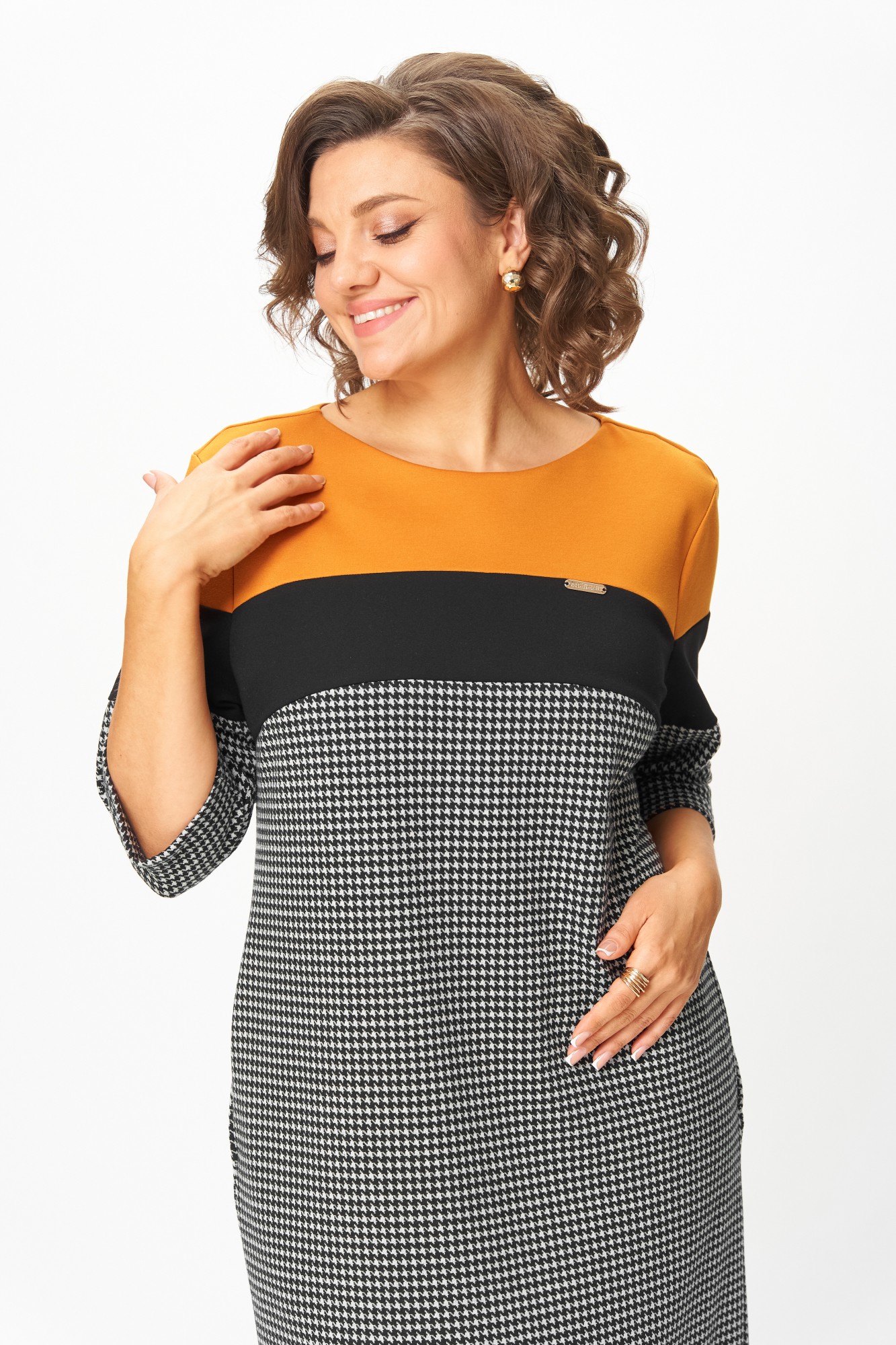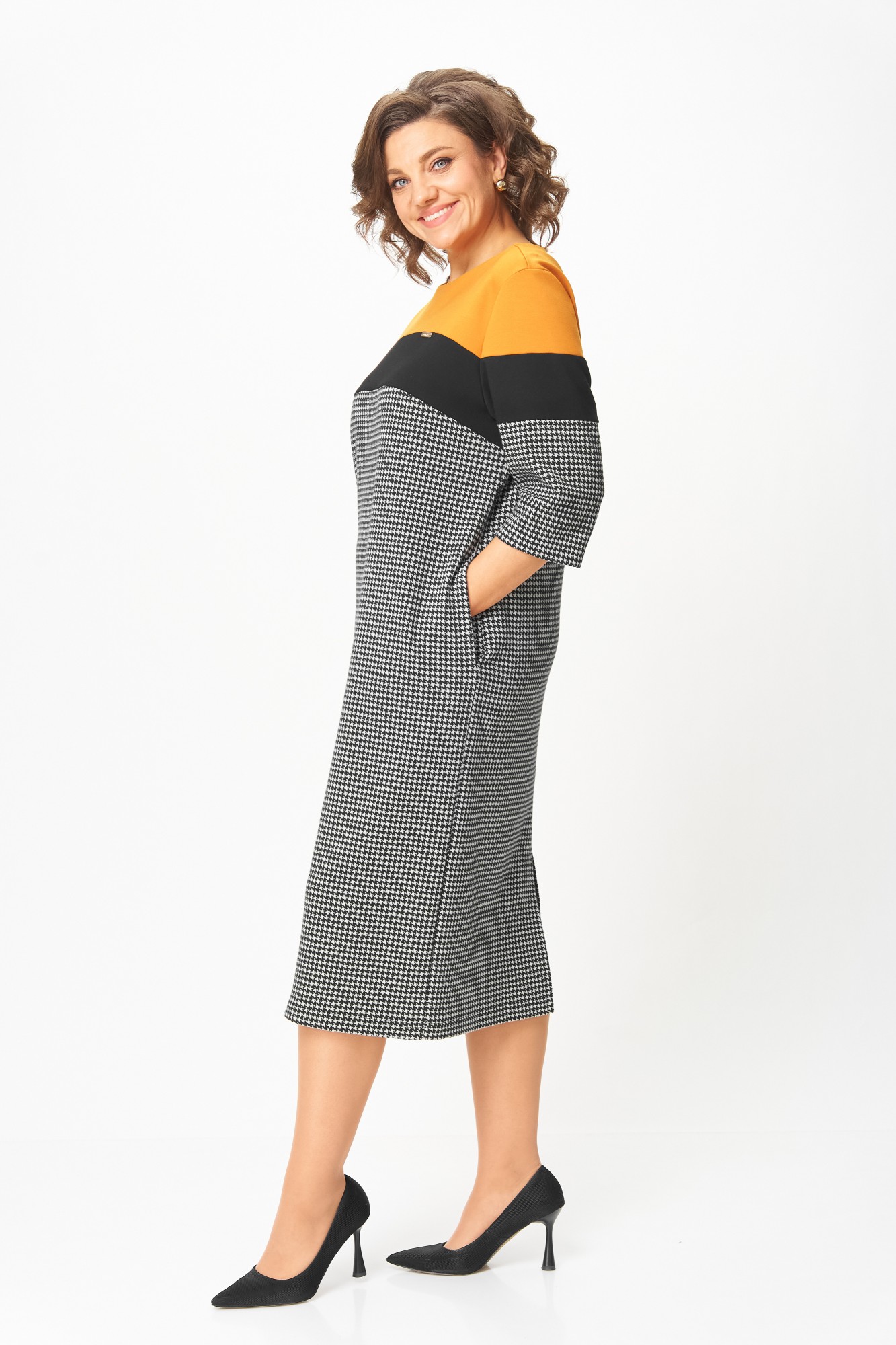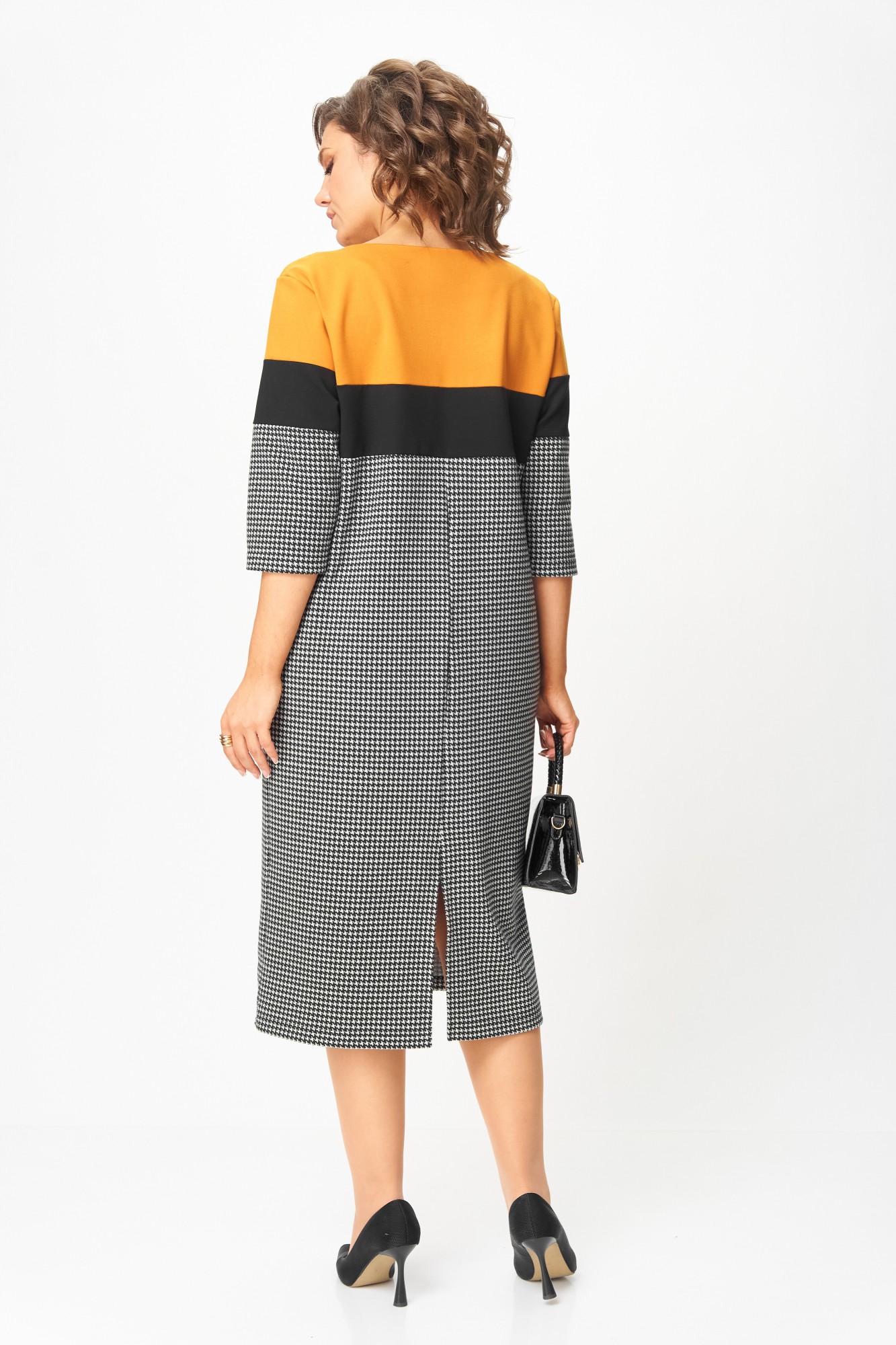 Это платье создано для женщин, которые выбирают комфорт и элегантность каждый день. Плотный трикотаж высокого качества мягко обнимает фигуру, не теряя форму, не вытягивается и не просвечивает. Контрастное сочетание горчичного, чёрного и классического принта “гусиная лапка” визуально стройнит и освежает образ. Рукав ¾ и длина миди делают модель практичной и универсальной — удобно и в офисе, и на прогулке, и на встрече.