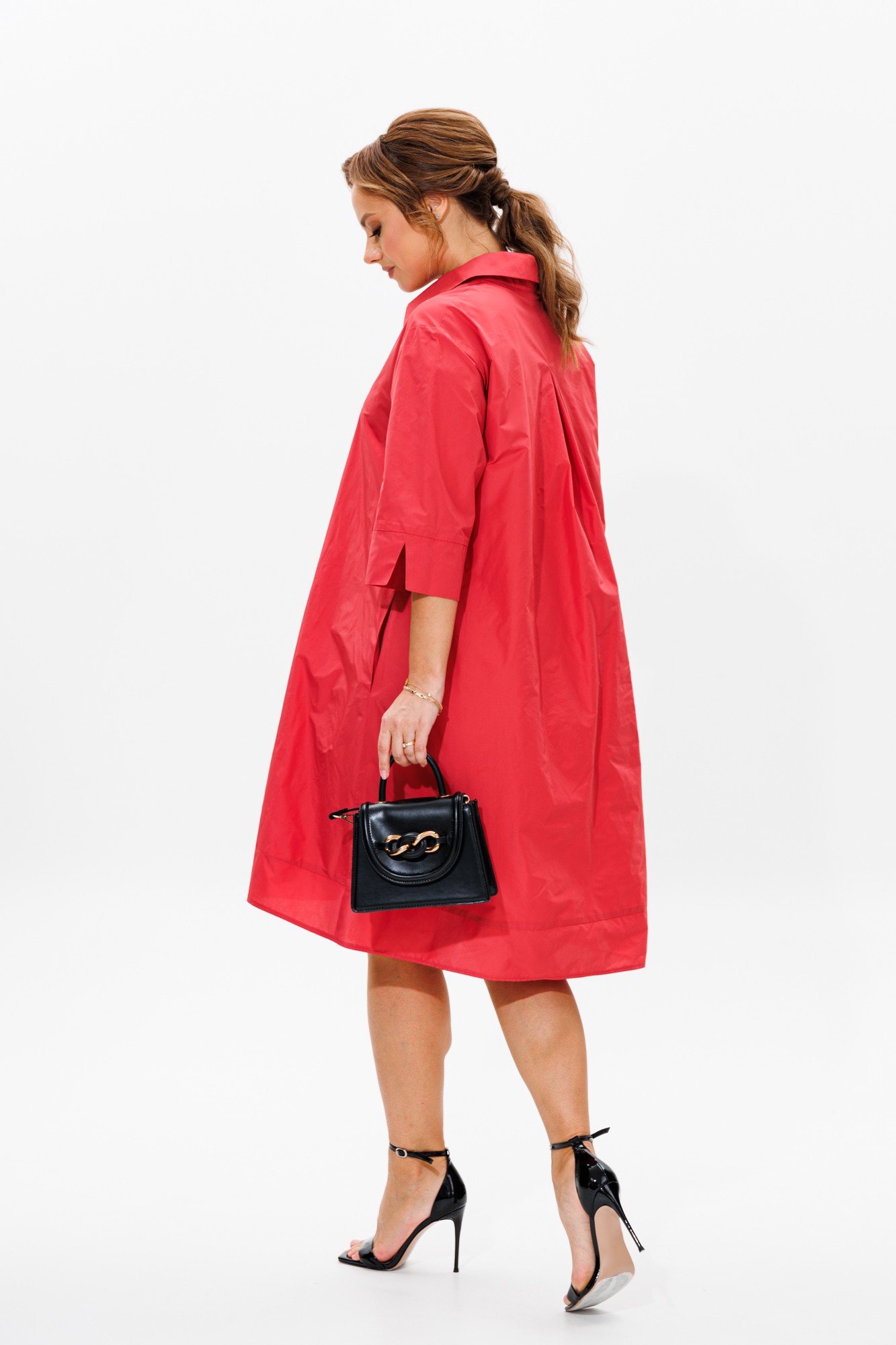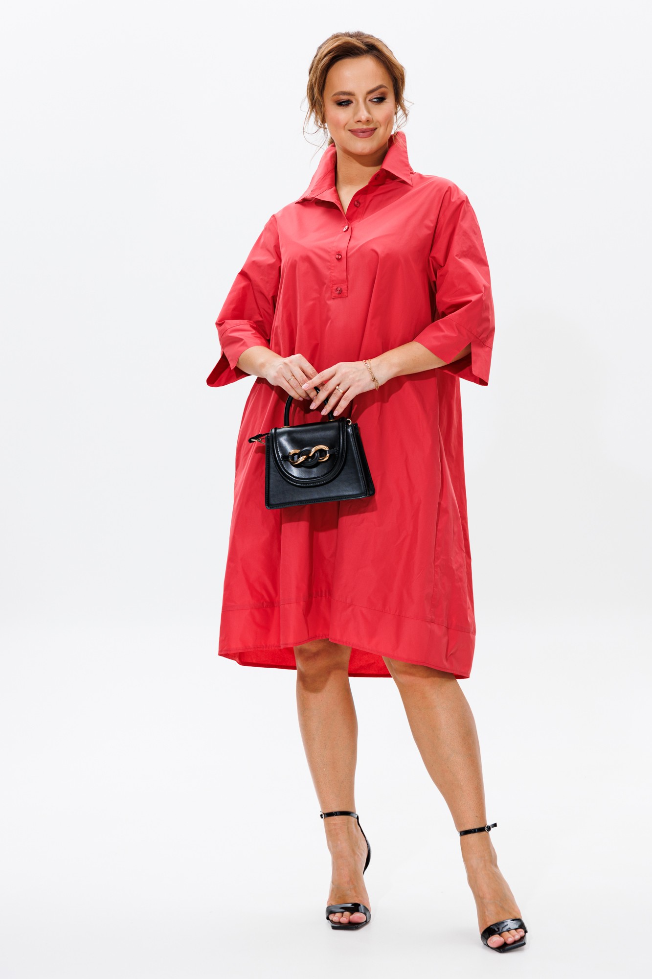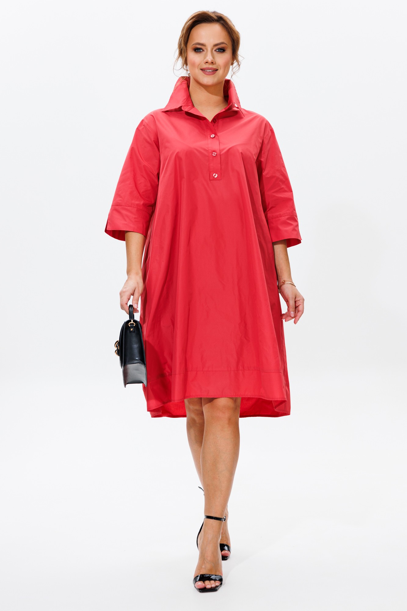 Платье женское А-образного силуэта, выполненное из тафты (не тянется). По переду отрезная планка на петли-пуговицы. Горловина оформлена рубашечным воротником со стойкой. Спинка со встречной складкой для свободы движения. Рукава втачные, одношовные с притачной манжетой и разрезом по середине. По низу платья притачная планка. Низ разноуровневый.