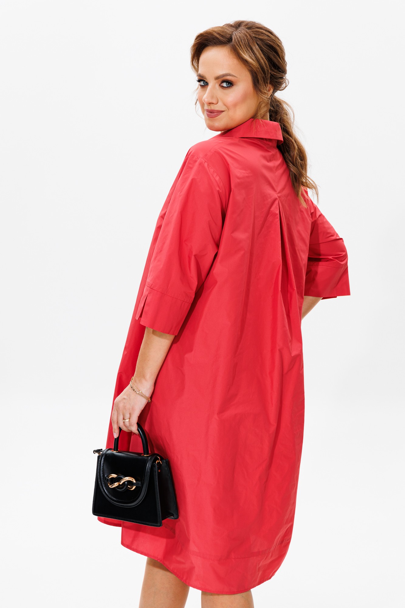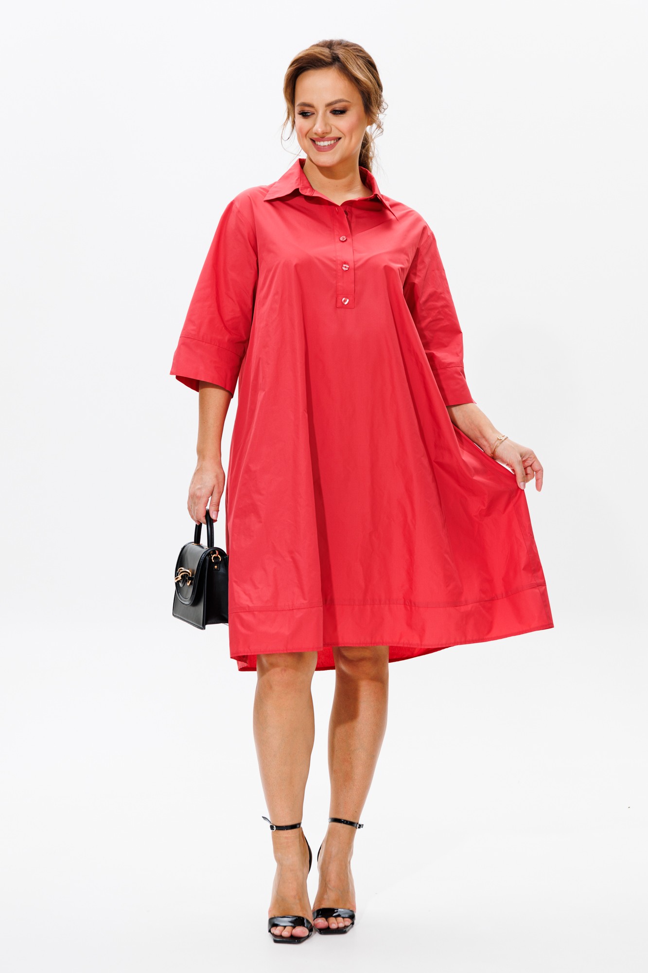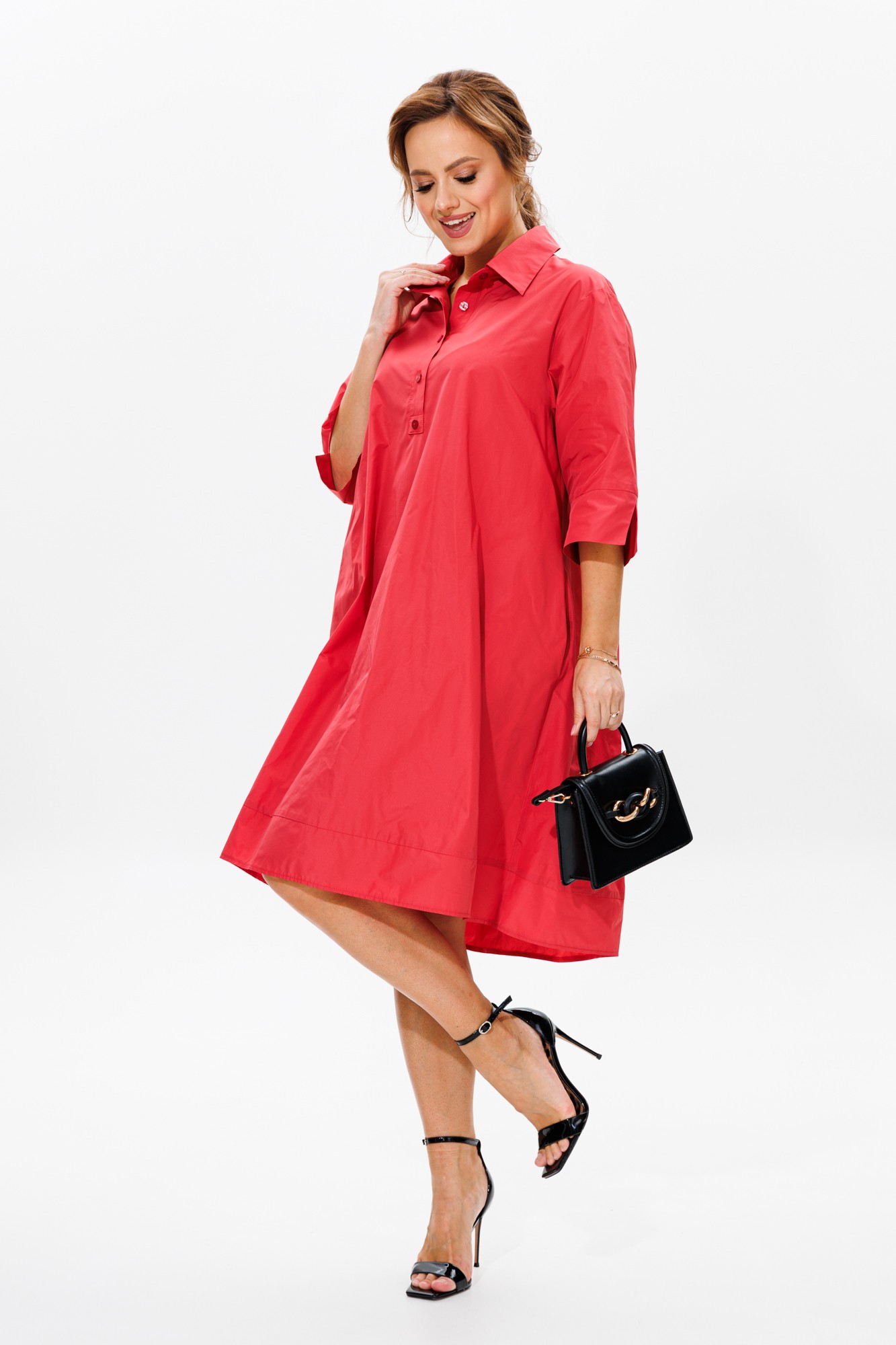 Платье женское А-образного силуэта, выполненное из тафты (не тянется). По переду отрезная планка на петли-пуговицы. Горловина оформлена рубашечным воротником со стойкой. Спинка со встречной складкой для свободы движения. Рукава втачные, одношовные с притачной манжетой и разрезом по середине. По низу платья притачная планка. Низ разноуровневый.