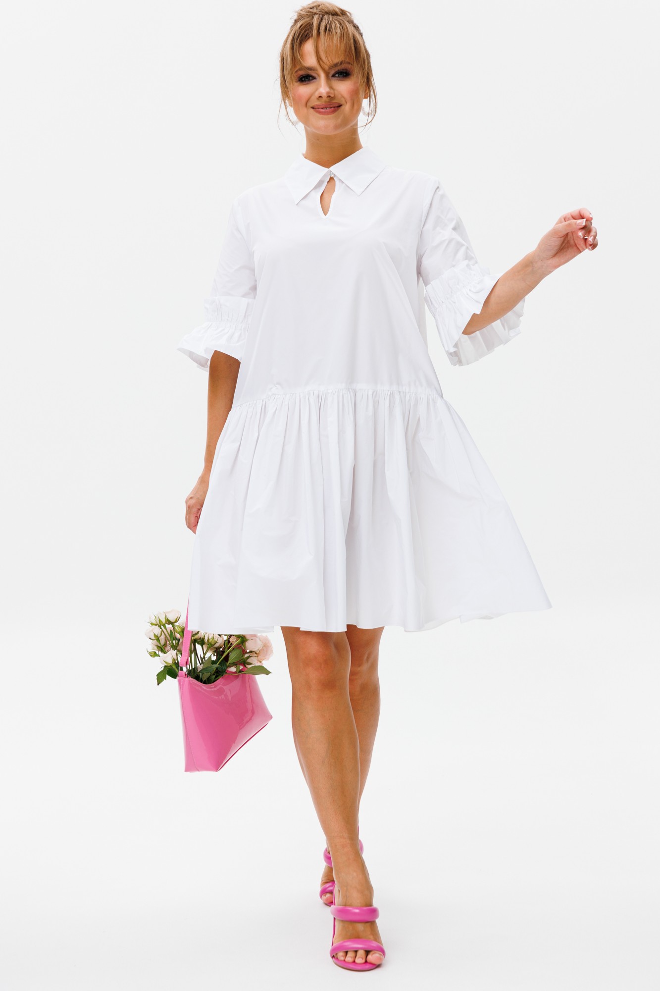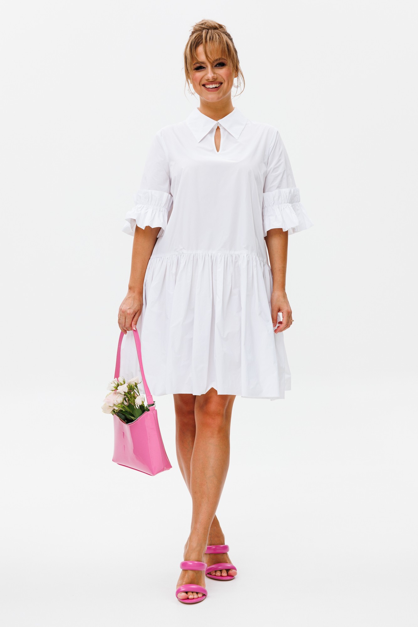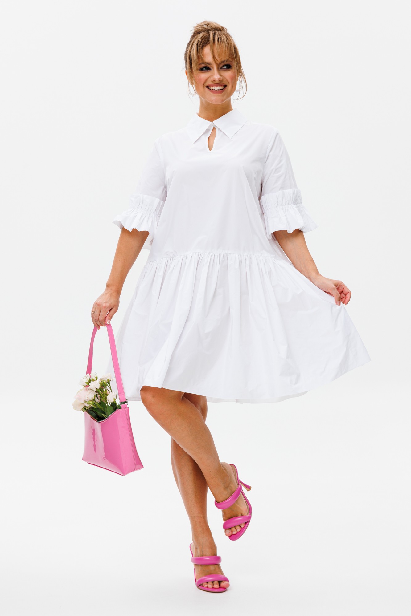 Нарядное платье свободного силуэта, выполненное из тафты (не тянется). Платье отрезное чуть ниже линии талии. Верхняя часть переда и спинки цельные, в нижней части отрезной присборенный волан. Горловина оформлена каплей и рубашечным воротником со стойкой, застегивающимся на навесную петлю и отделочную пуговицу. Рукава втачные, одношовные, декорированы объемными рюшами.