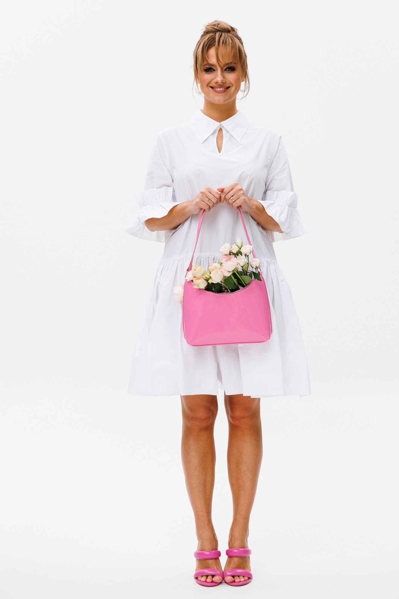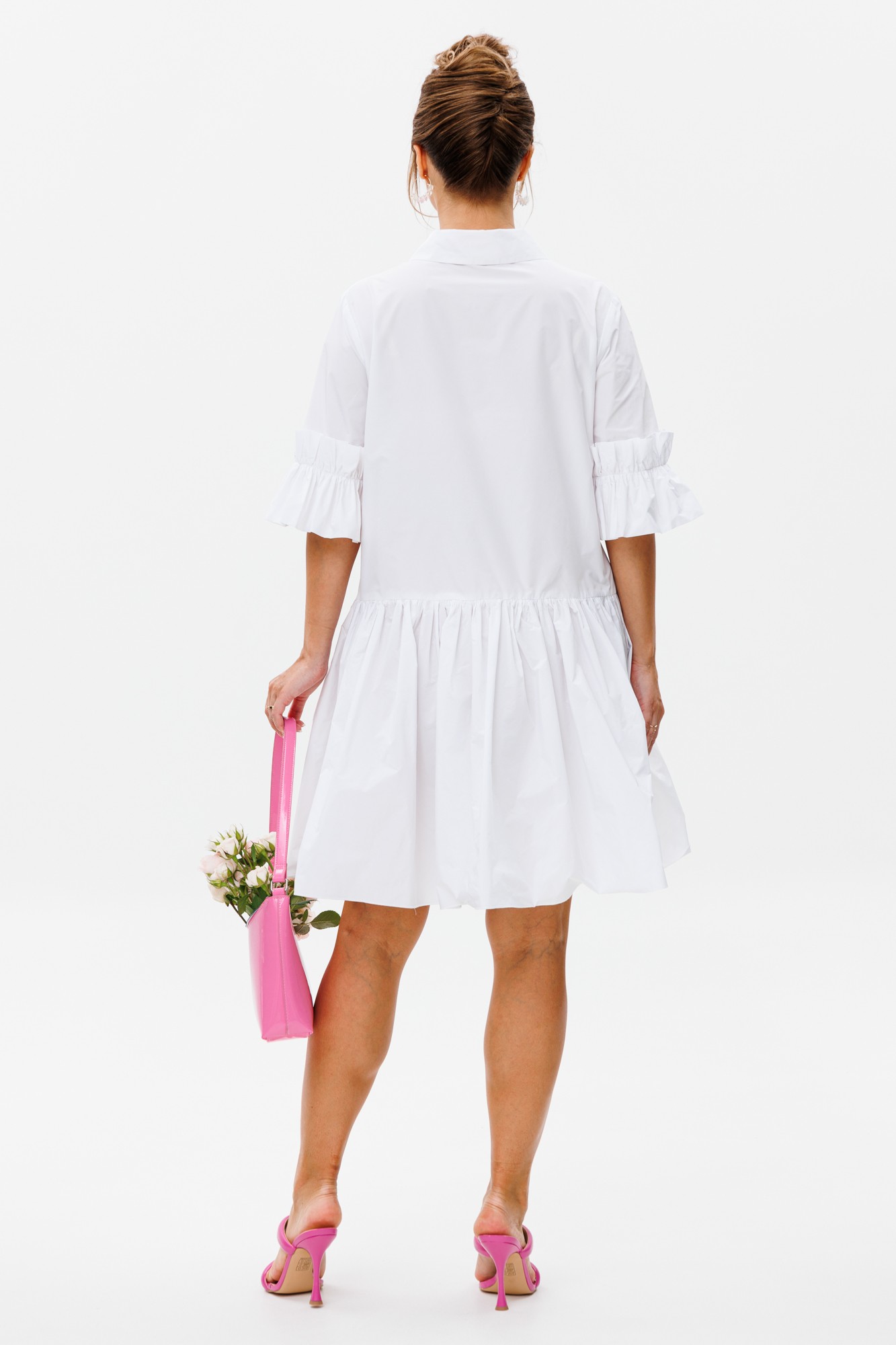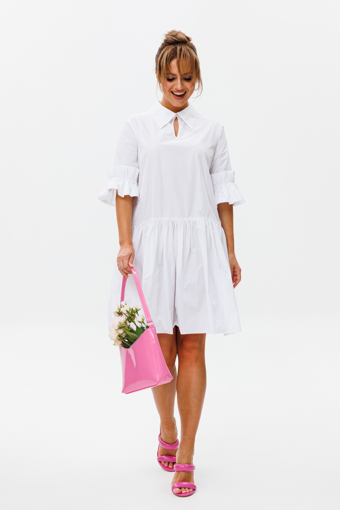 Нарядное платье свободного силуэта, выполненное из тафты (не тянется). Платье отрезное чуть ниже линии талии. Верхняя часть переда и спинки цельные, в нижней части отрезной присборенный волан. Горловина оформлена каплей и рубашечным воротником со стойкой, застегивающимся на навесную петлю и отделочную пуговицу. Рукава втачные, одношовные, декорированы объемными рюшами.
