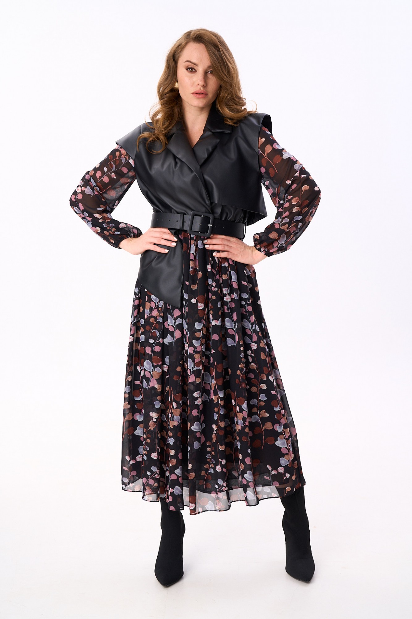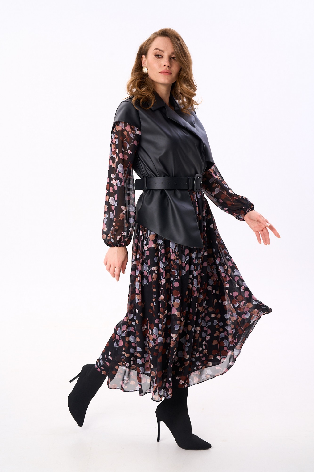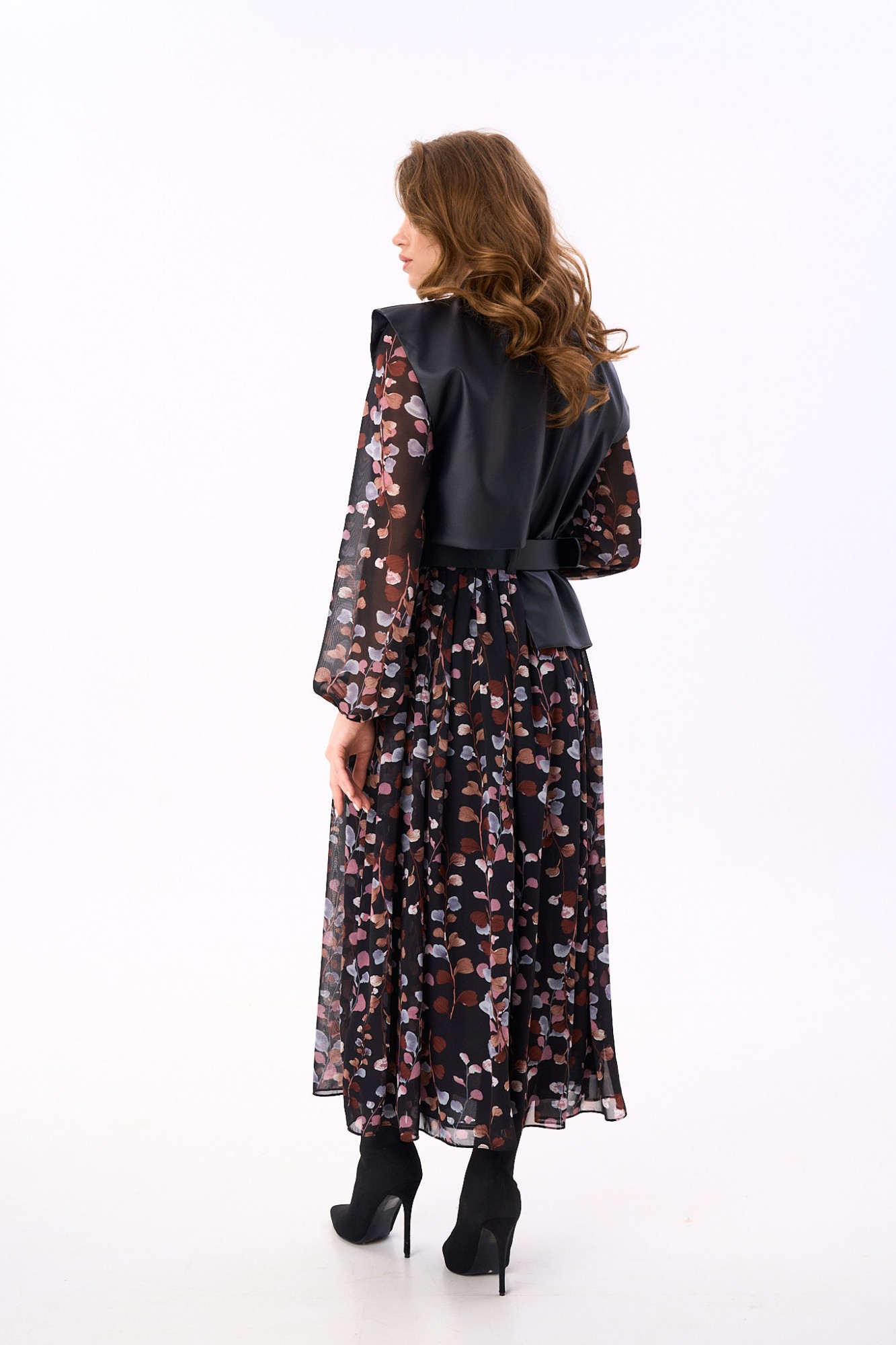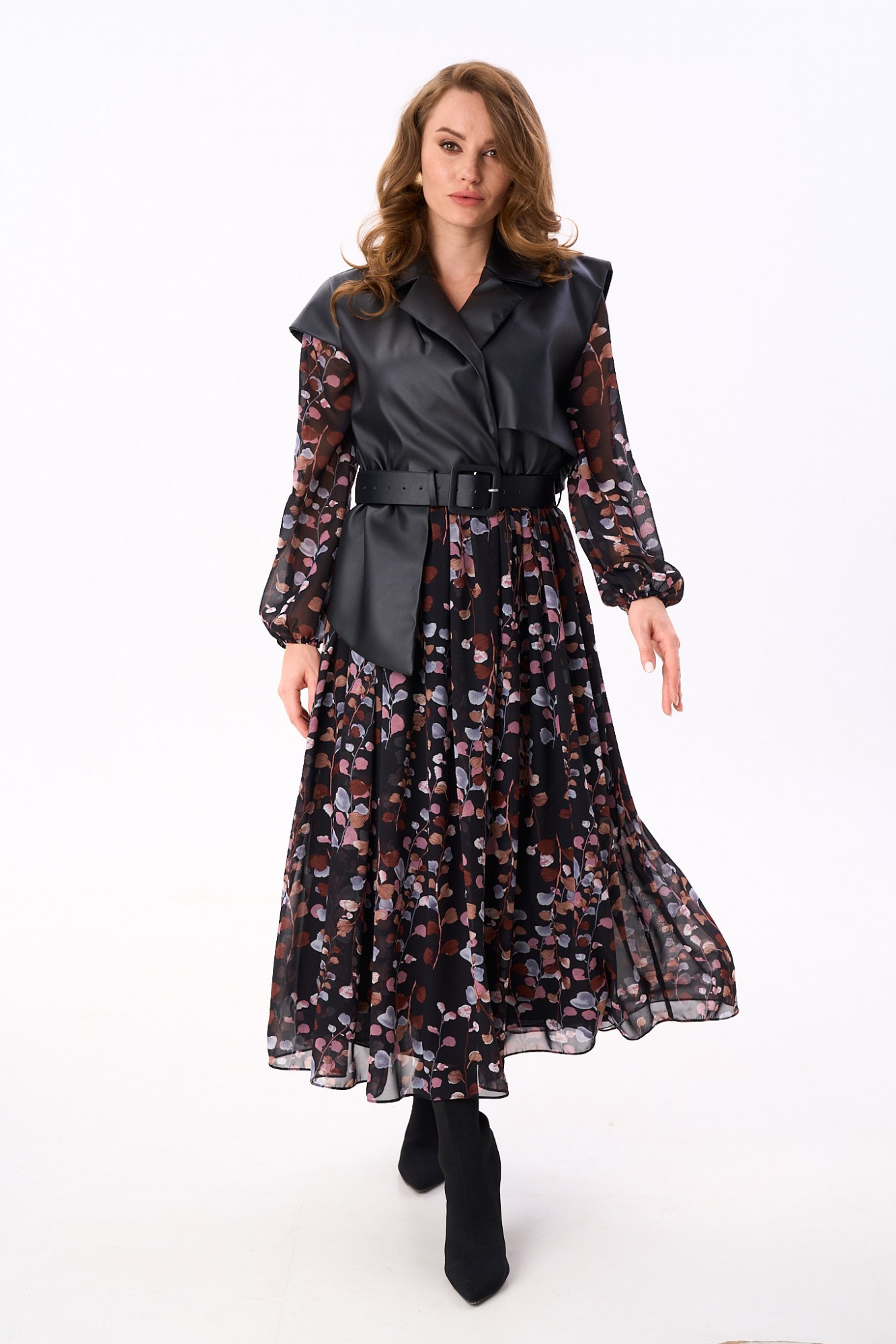 Платье комбинированное, состоящее из основной ткани и отделочной. Имитация верхнего жилета из экокожи прямого силуэта с воротником пиджачного типа. По правой пройме переда расположена фигурная деталь крылышко. Спинка со средним швом. По низу правого переда и низу правой спинки фигурная деталь. По левой части переда и левой части спинки отлетная кокетка. Рукава одношовные, втачные, длинные со сборкой по линии низа на резинку из отделочной ткани. Юбка прямого силуэта длинная, со сборкой по талии из отделочной ткани. По линии талии платья резинка и шлевки по боковым швам и центральному шву спинки из основной ткани. В комплект к платью идёт ремень с пряжкой.