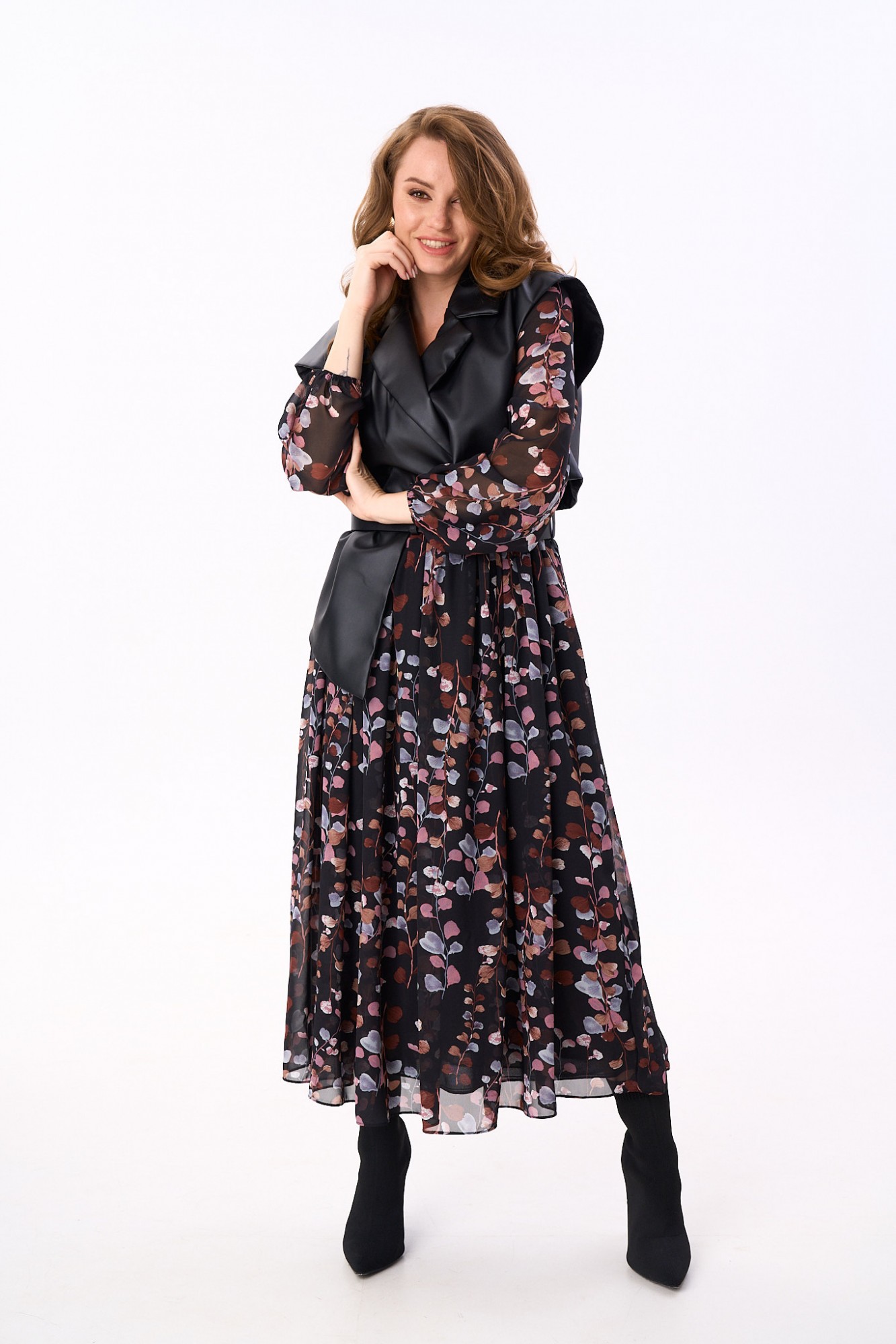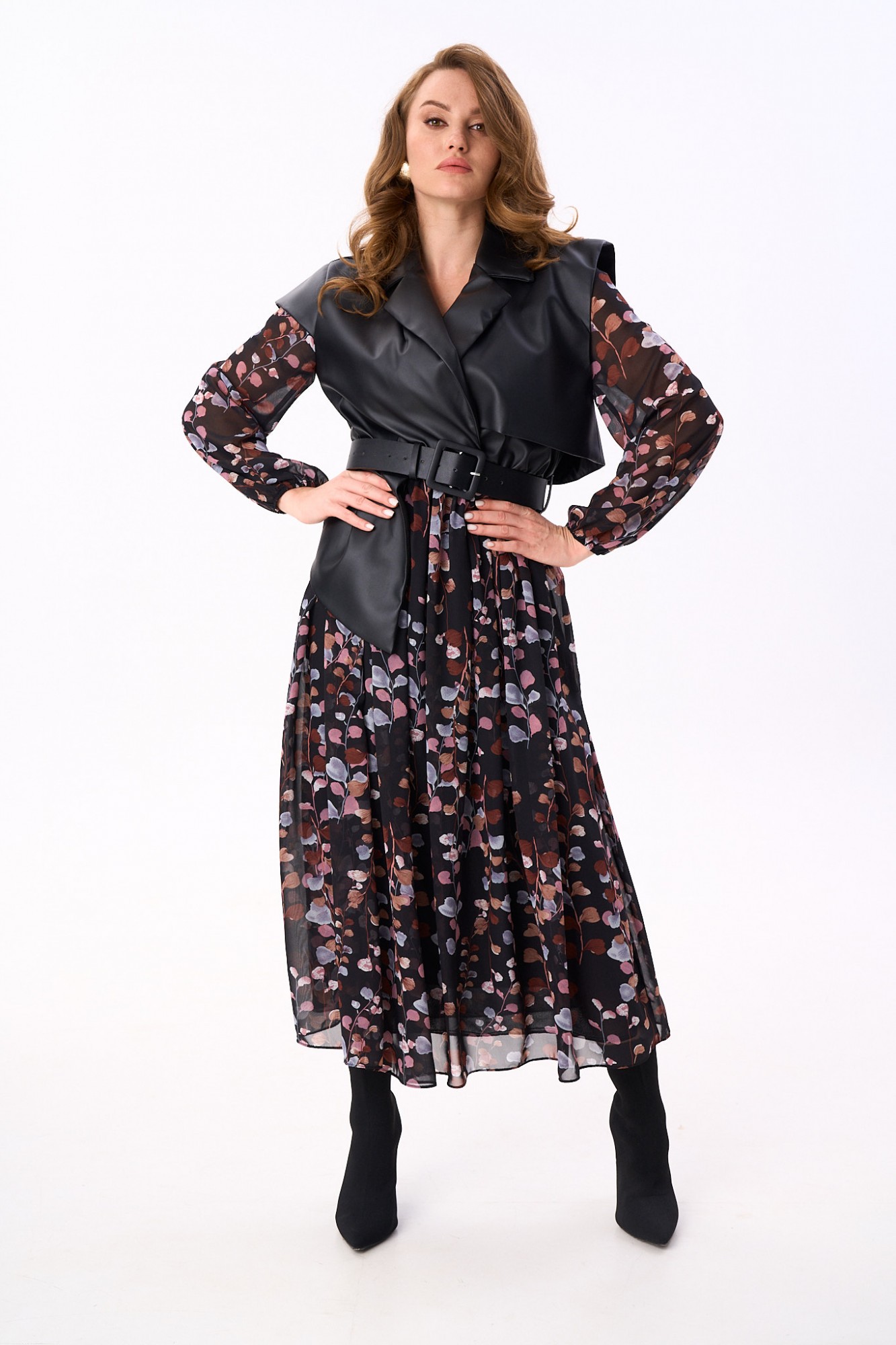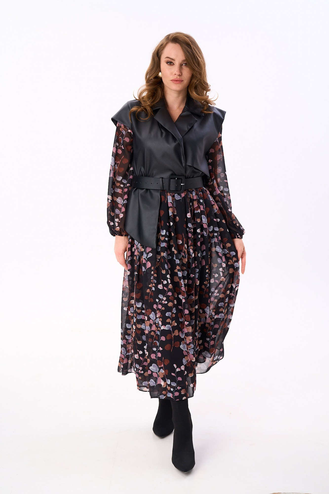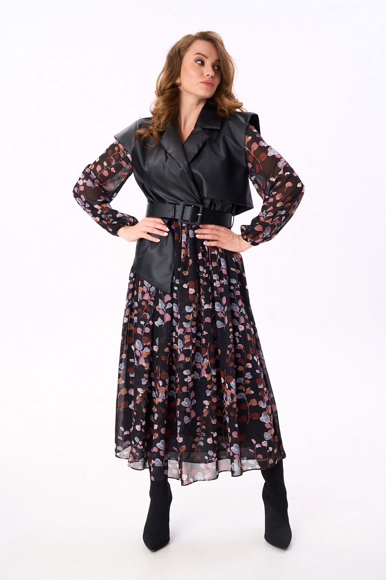 Платье комбинированное, состоящее из основной ткани и отделочной. Имитация верхнего жилета из экокожи прямого силуэта с воротником пиджачного типа. По правой пройме переда расположена фигурная деталь крылышко. Спинка со средним швом. По низу правого переда и низу правой спинки фигурная деталь. По левой части переда и левой части спинки отлетная кокетка. Рукава одношовные, втачные, длинные со сборкой по линии низа на резинку из отделочной ткани. Юбка прямого силуэта длинная, со сборкой по талии из отделочной ткани. По линии талии платья резинка и шлевки по боковым швам и центральному шву спинки из основной ткани. В комплект к платью идёт ремень с пряжкой.
