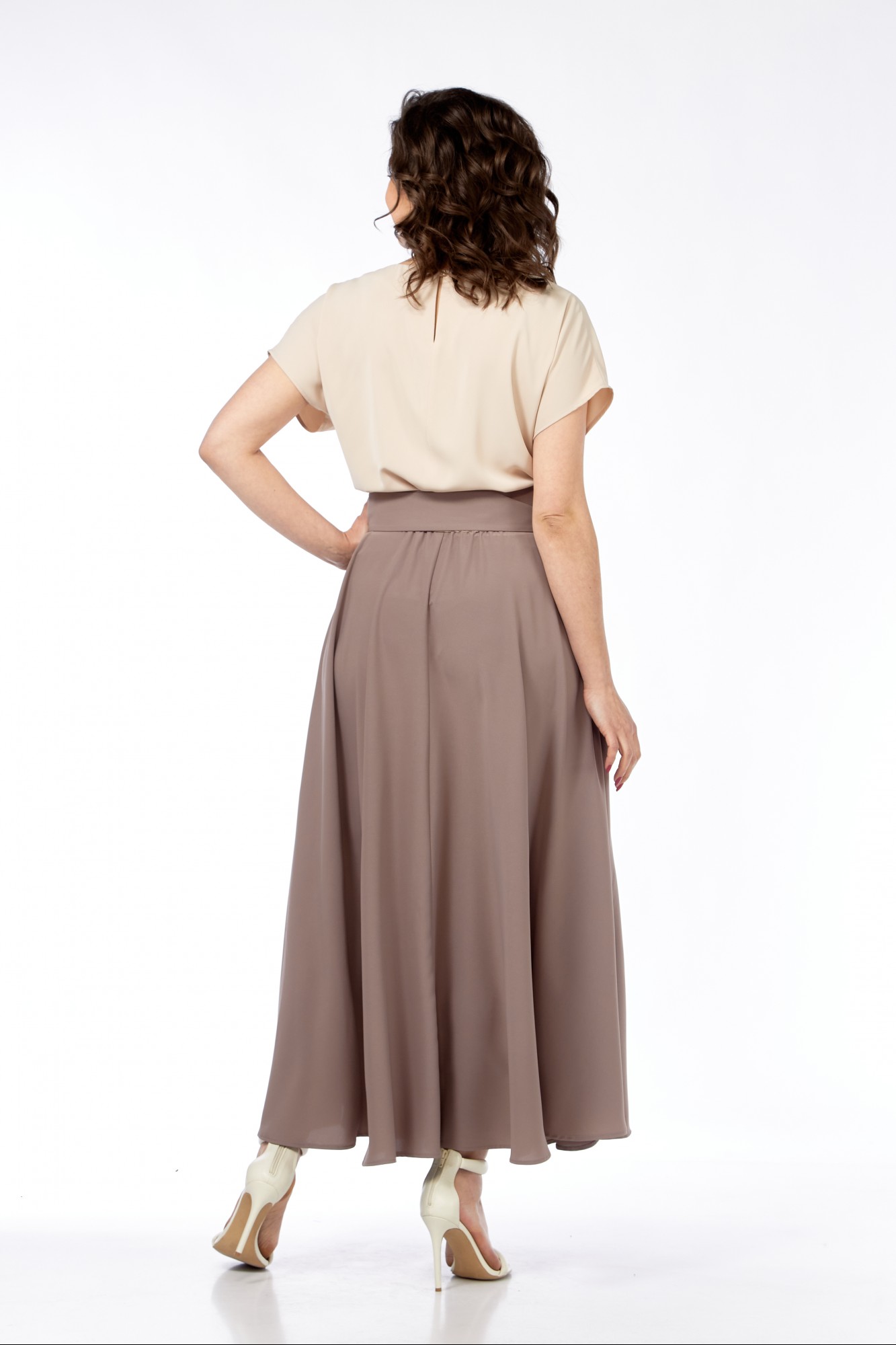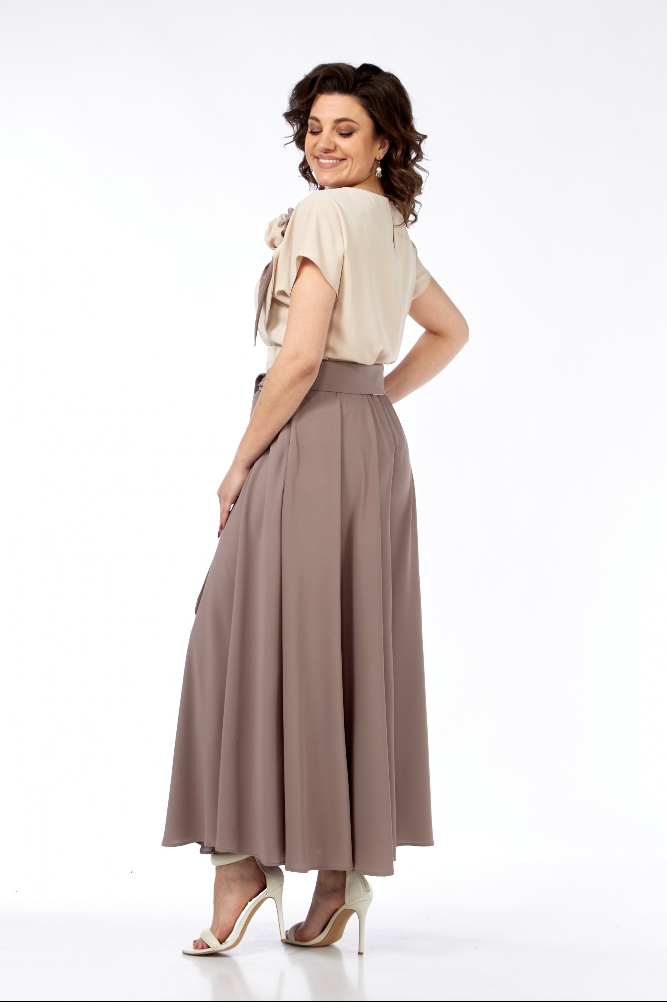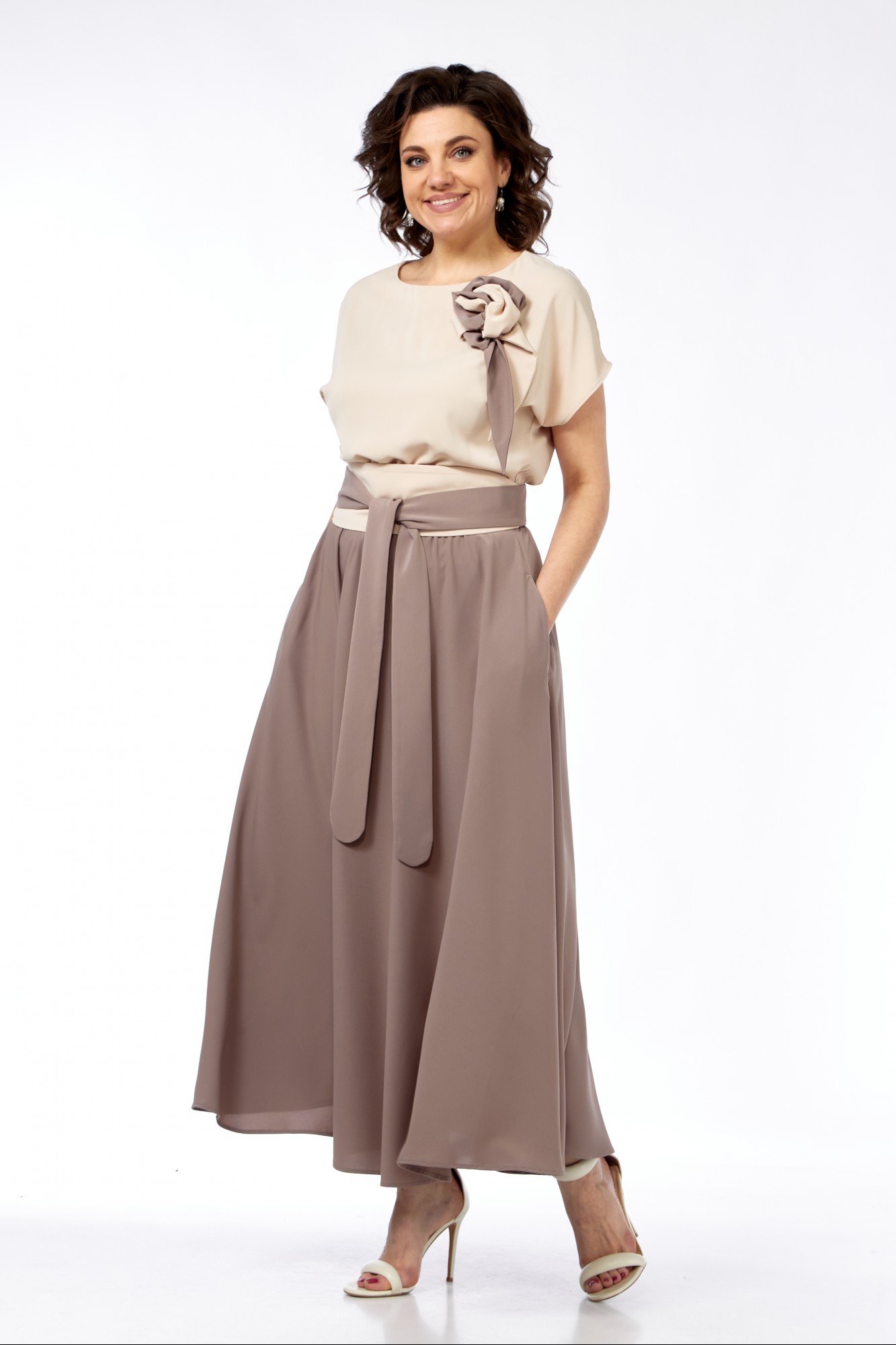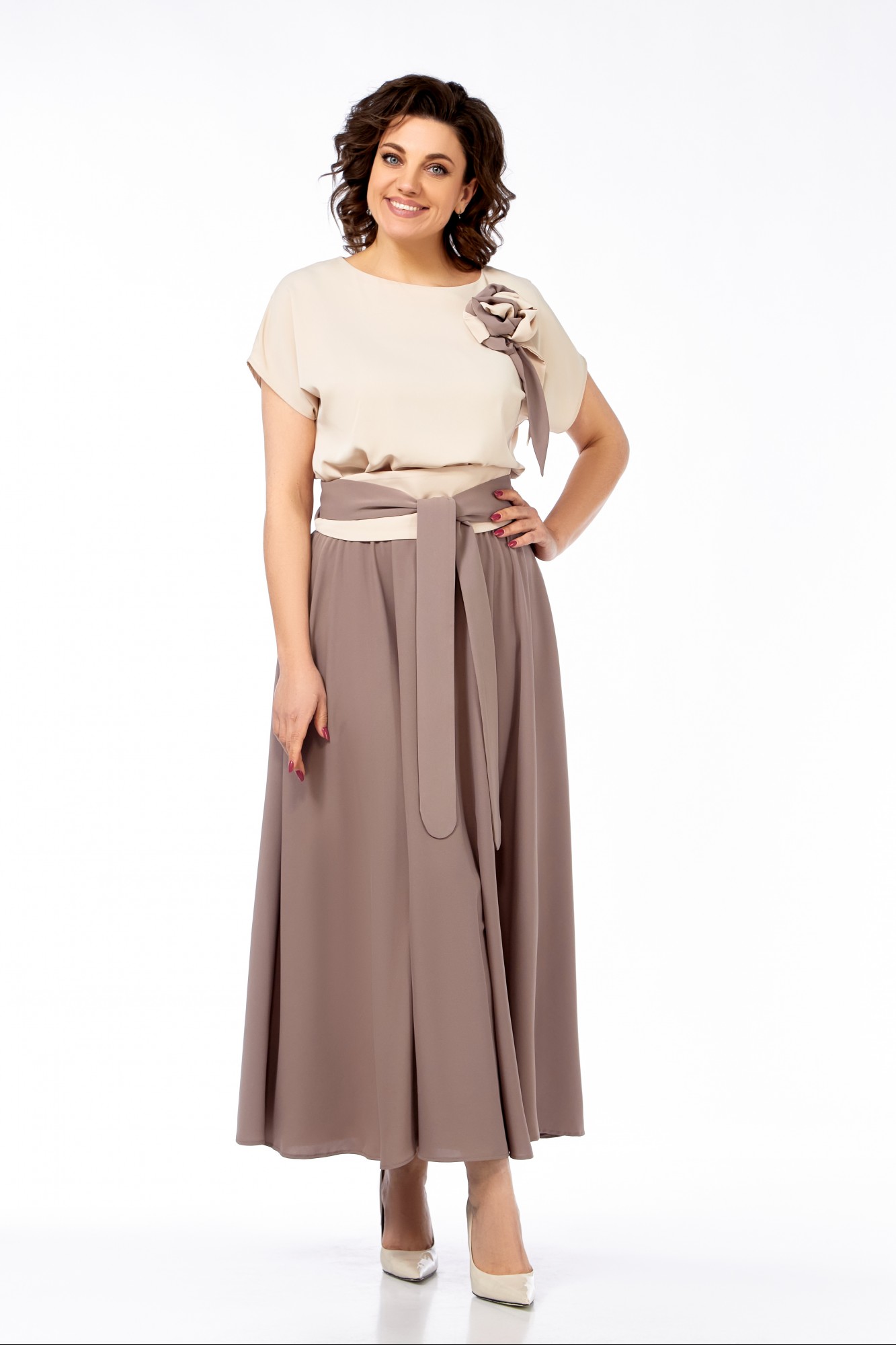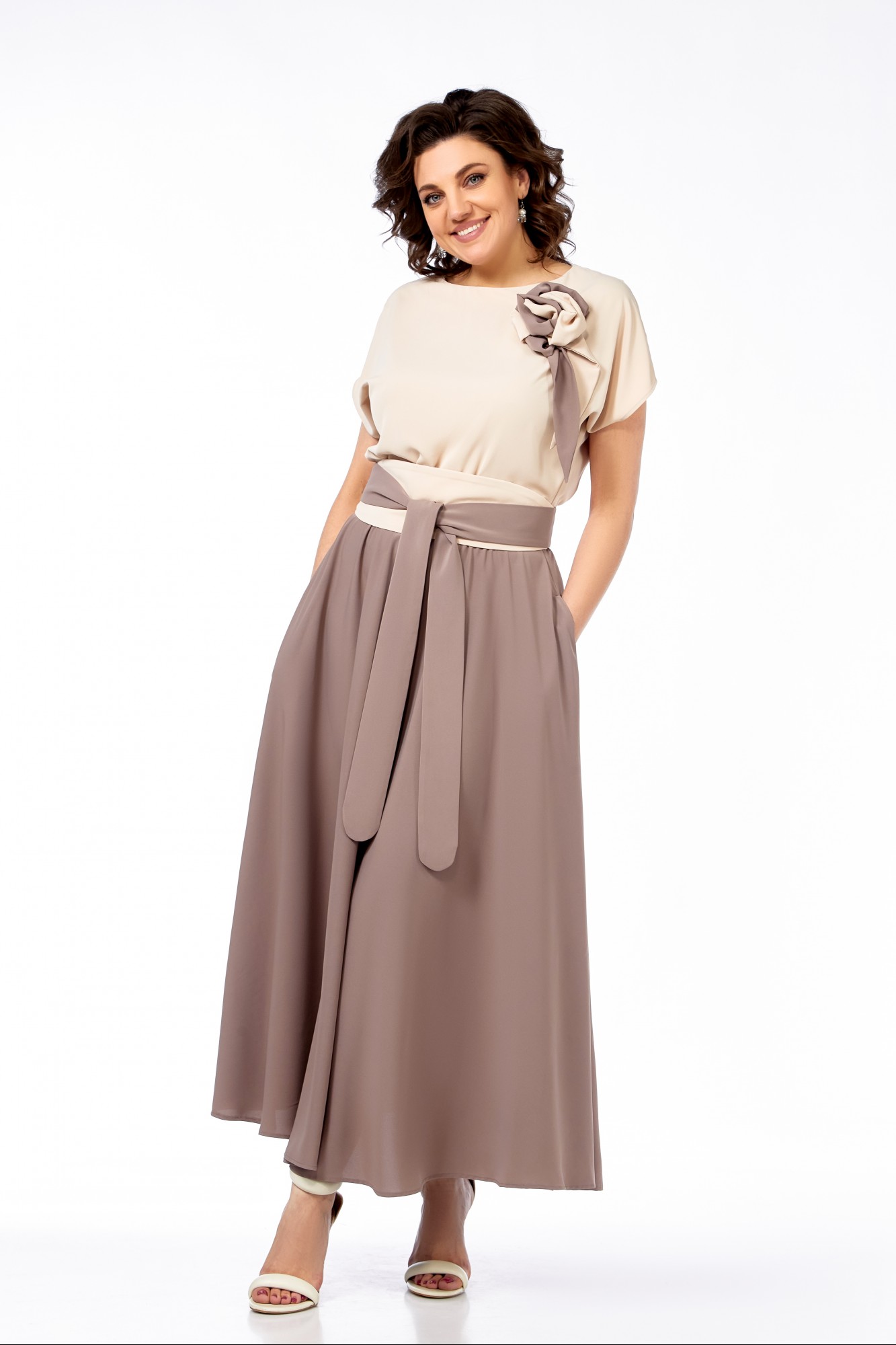Нарядное платье длиной макси свободного силуэта, выполнено из двух оттенков. Отрезное по линии талии, резинка по спинке. Горловина овальной формы, спущенная линия плеча. Нижняя часть платья клеш-полусолнце, карманы в боковых швах. Пояс из основной ткани из двух цветов. Декоративный цветок-брошь ручной работы.
