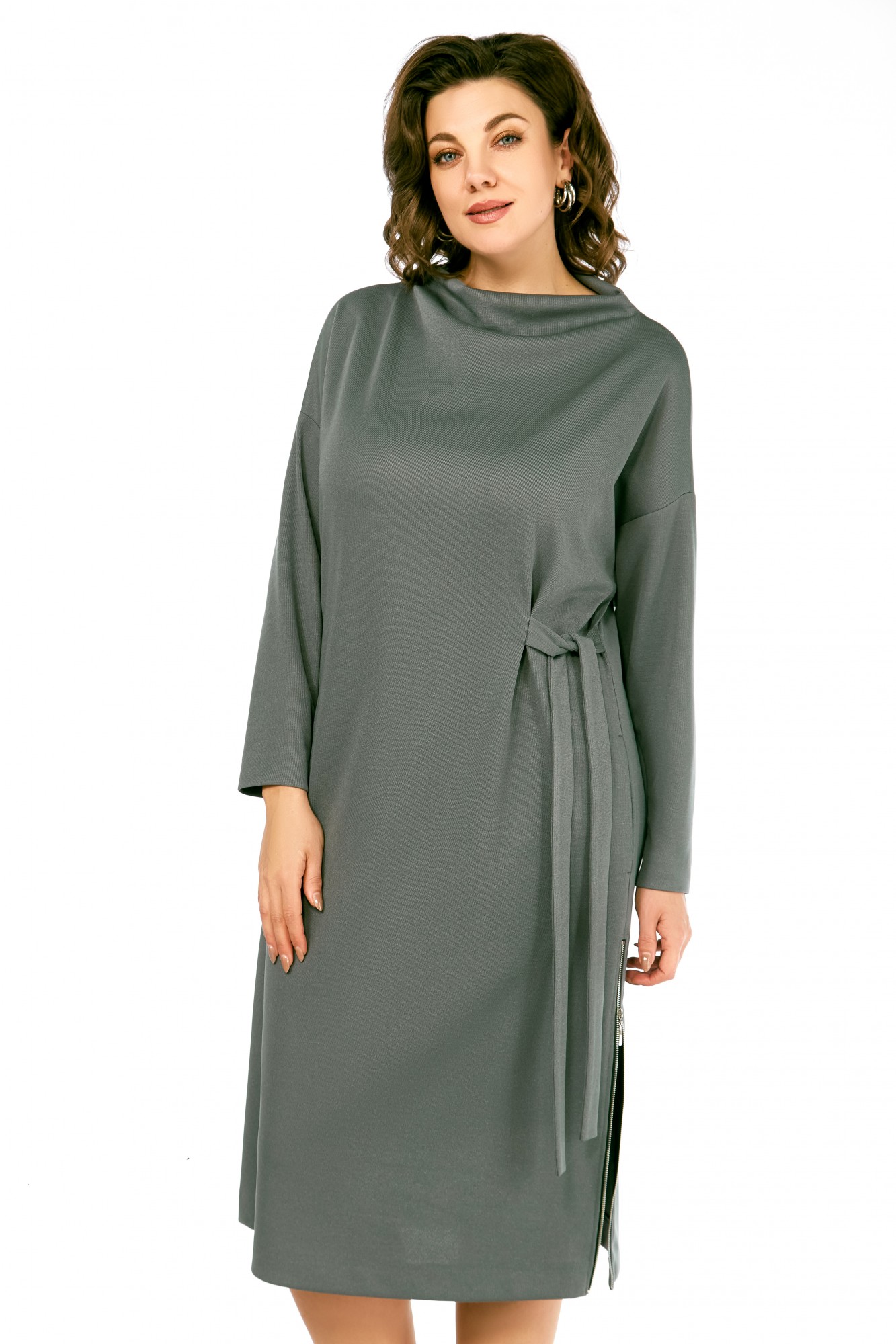 Платье женское, прямого силуэта со спущенным длинным рукавом. Цельнокроеный воротник-стойка. С левой стороны в области талии слева декор, в виде ниспадающего пояса. Карманы в боковых швах. Молния в левом боковом шве внизу функциональная молния, которая при растегивании превращается в разрез.