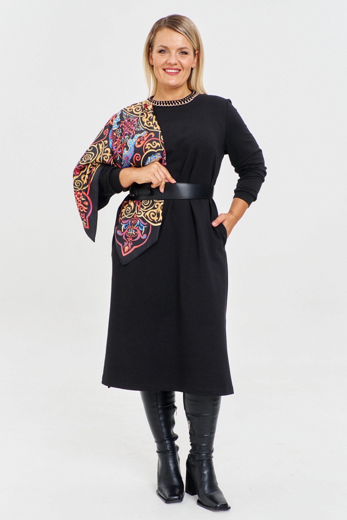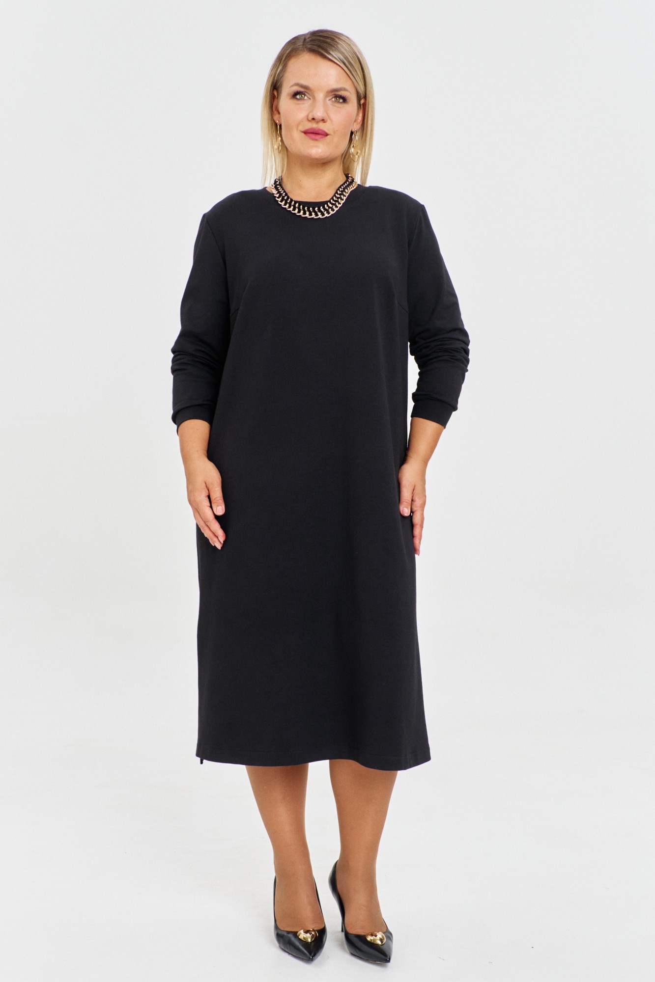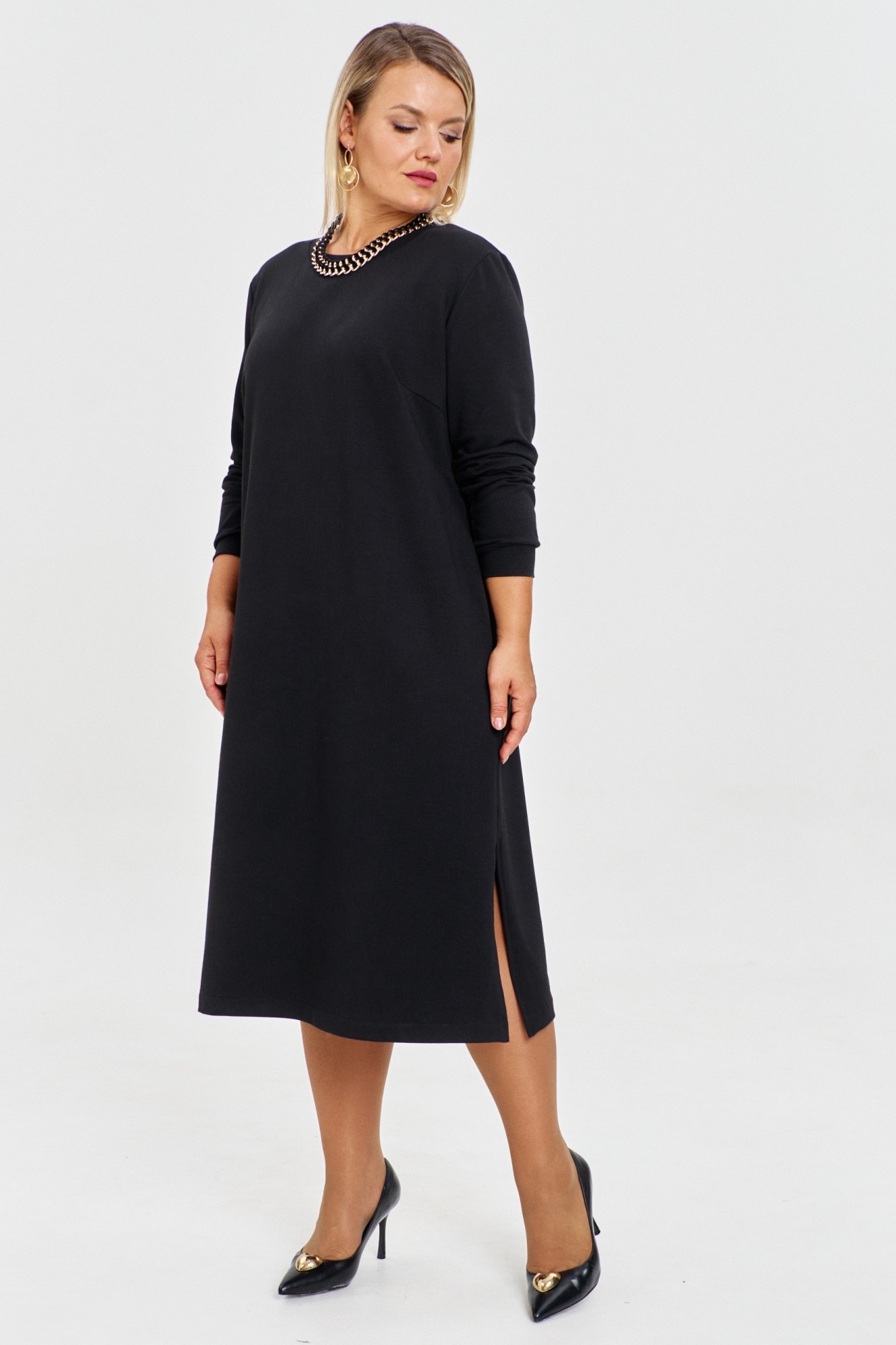 Платье прямое свободного кроя из премиум трикотажа. Платье с длинным полноразмерным рукавом с манжетам, с округлой горловиной, в боковых швах карманы и разрезы. В комплекте к платью идет дизайнерское украшение на шею из золотой цепи и черной бархатной ленты. Такое базовое платье - воплощение свободы движения, естественности уникальности каждой женщины. Оно отлично сидит на любом типе фигуры. Свободное современное трикотажное платье больших размеров можно легко стилизовать при помощи аксессуаров для разных событий, на работу и для прогулок. Модное платье без надписи и рисунка - это отличная базовая вещь в вашем гардеробе.