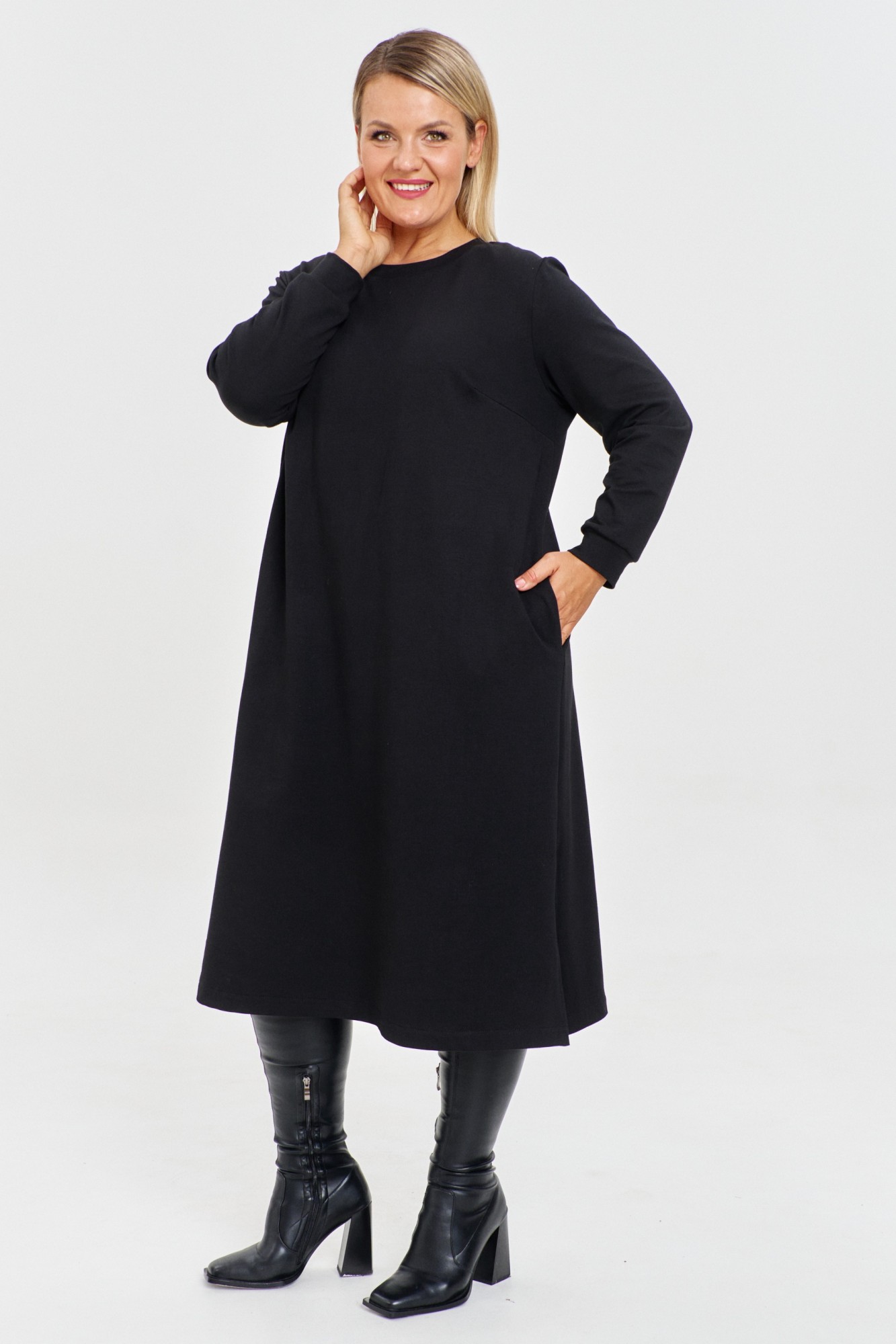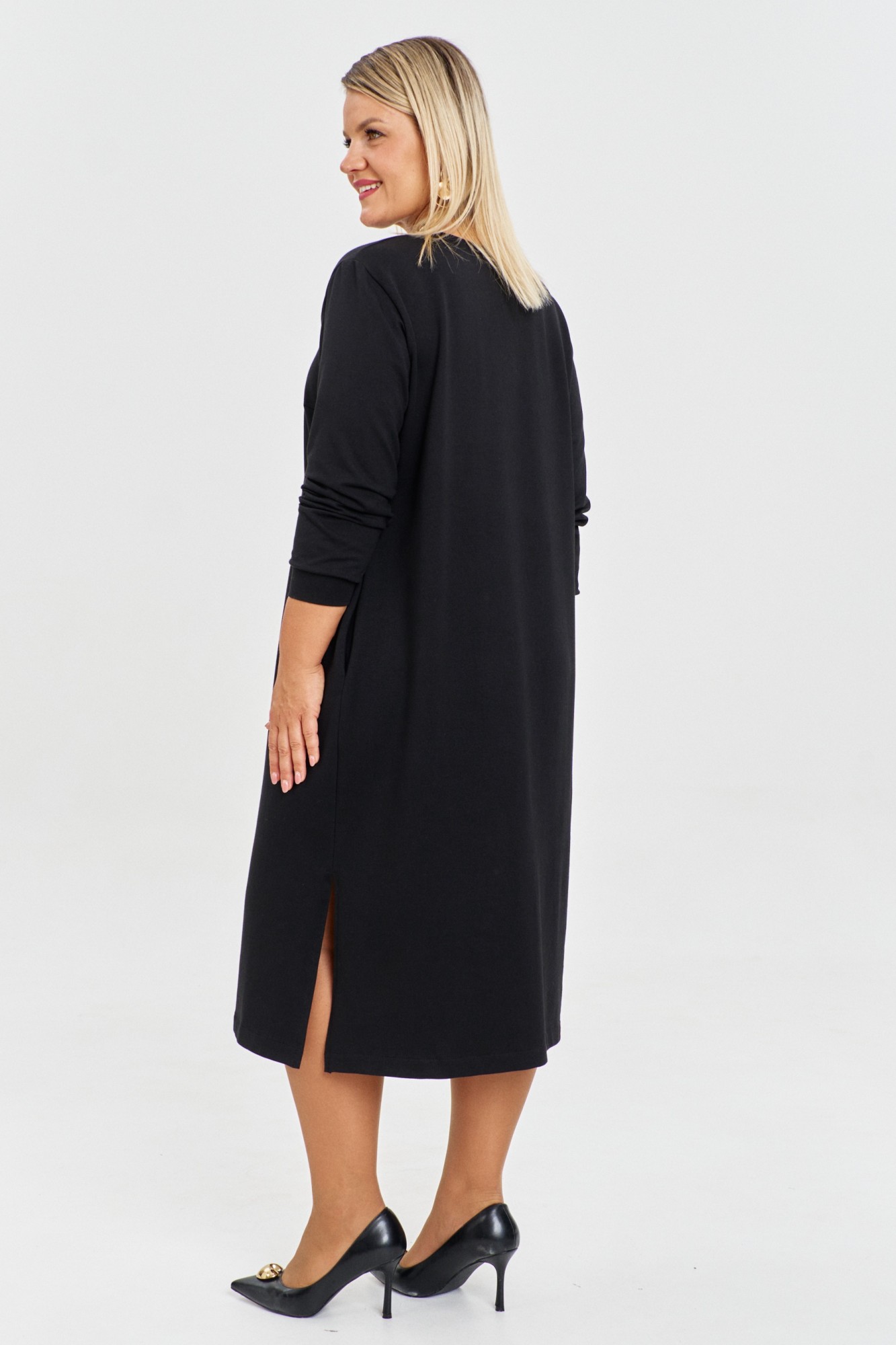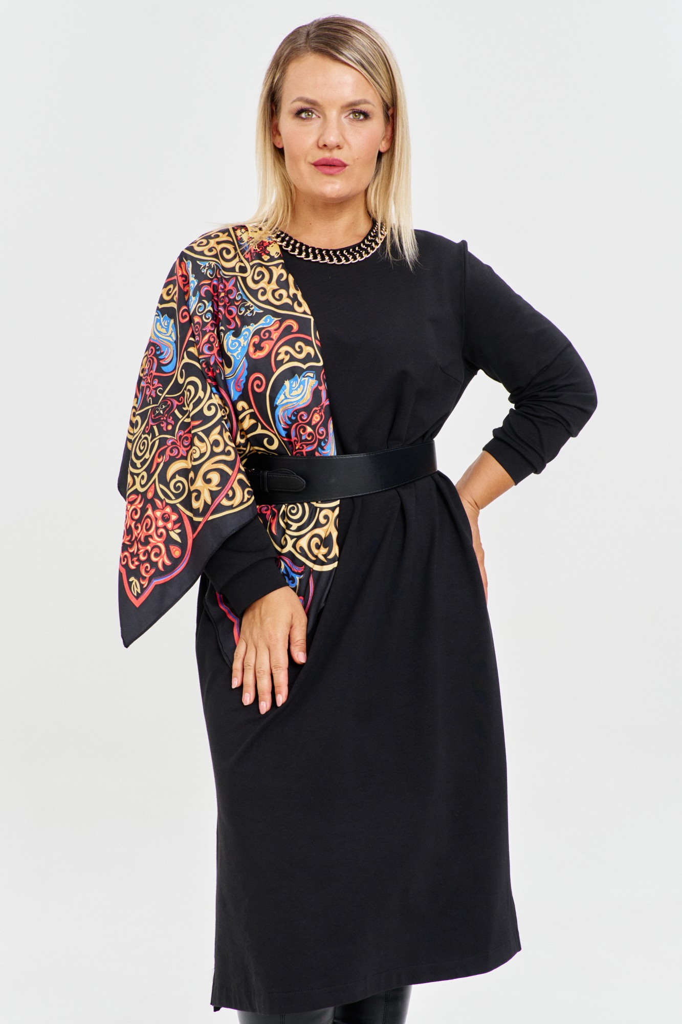 Платье прямое свободного кроя из премиум трикотажа. Платье с длинным полноразмерным рукавом с манжетам, с округлой горловиной, в боковых швах карманы и разрезы. В комплекте к платью идет дизайнерское украшение на шею из золотой цепи и черной бархатной ленты. Такое базовое платье - воплощение свободы движения, естественности уникальности каждой женщины. Оно отлично сидит на любом типе фигуры. Свободное современное трикотажное платье больших размеров можно легко стилизовать при помощи аксессуаров для разных событий, на работу и для прогулок. Модное платье без надписи и рисунка - это отличная базовая вещь в вашем гардеробе.