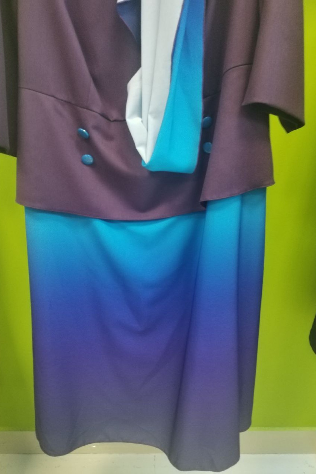 Женское платье полуприлегающего в области талии силуэта и расширенное к низу. Платье выполнено на сочетании материалов: однотонной ткани костюмно-плательного ассортимента и шифона. Из однотона выполнены рукава, лиф платья и баска, таким образом создается имитация жакета и юбки. Вырез горловины округлый, декорирован съемным шарфом. Шарф выполнен из шифона и продевается сквозь широкую пату возле горловины. Юбка также выполнена из шифона, есть нижняя юбка из подкладочной ткани. Рукав втачной с разрезом по низу. Спинка со средним швом, в котором расположена застежка на потайную тесьму-молнию. Дополнительным декором служат пришитые на баске в два ряда пуговицы и съемная брошь. Длина рукава 44 см. Длина платья по спинке 113 см.