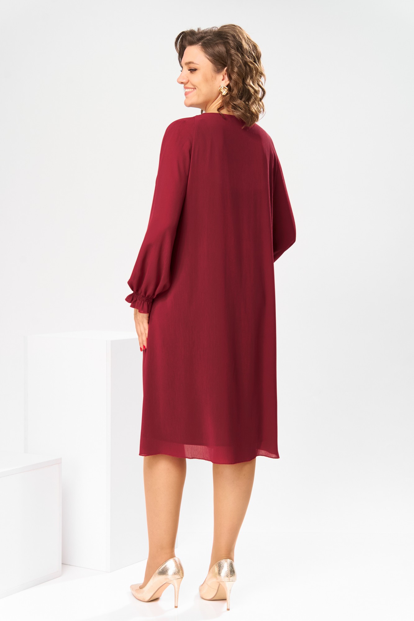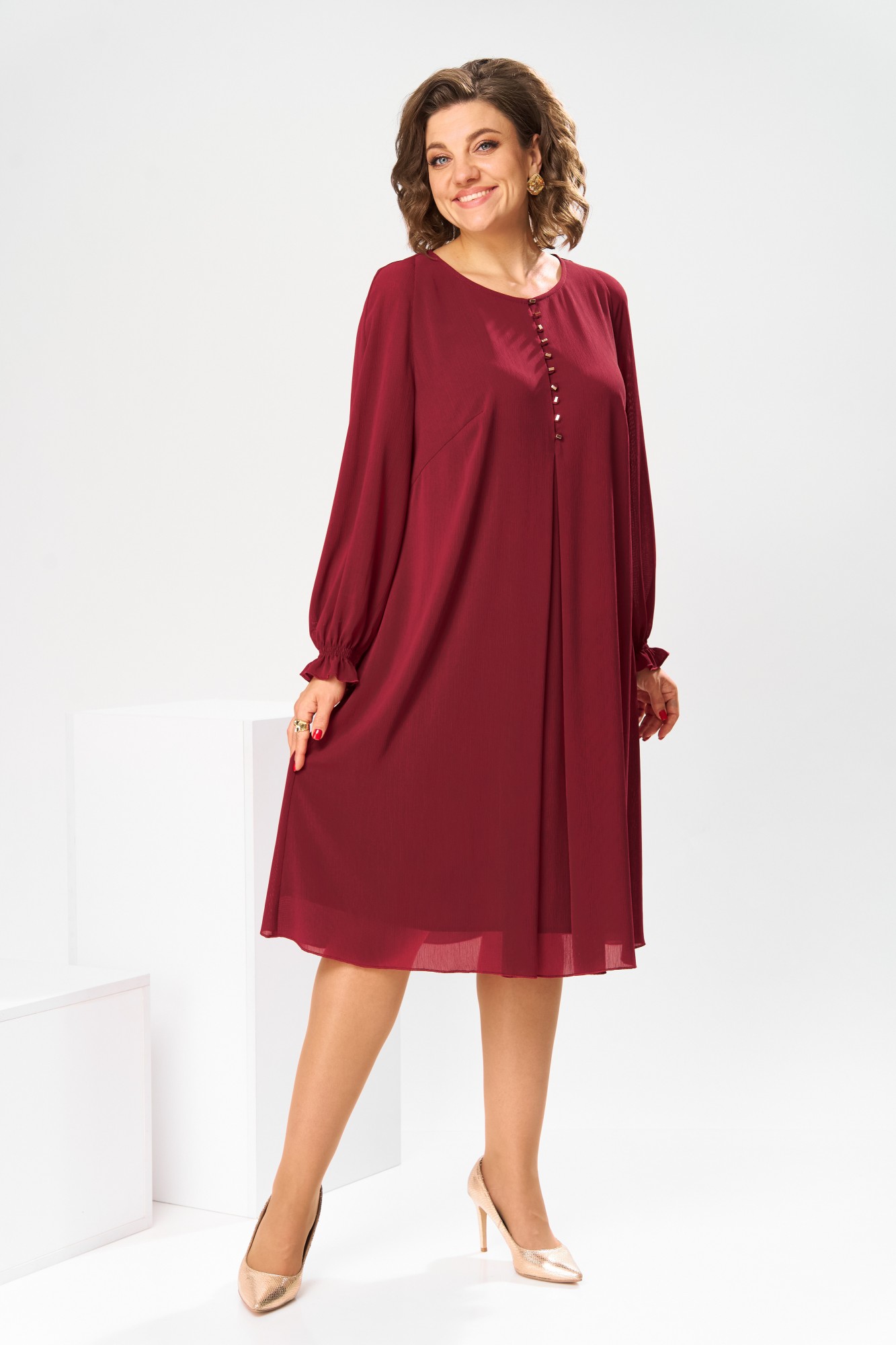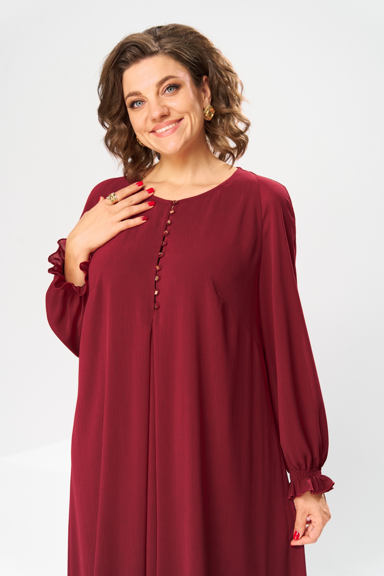 Платье женское расширенное к низу, длиной за колено. Перед с двумя нагрудными вытачками, с разрезом по центру, фиксирующимся на 10 навесных петель и 10 пришивных пуговиц с одной бантовой складкой, выходящей из-под разреза. Спинка цельнокроеная. Горловина круглая, обтачная, без воротника. Рукав полуреглан, втачной, длинный, одношовный, низ рукава собран на эластичную тесьму. Платье на подкладке.