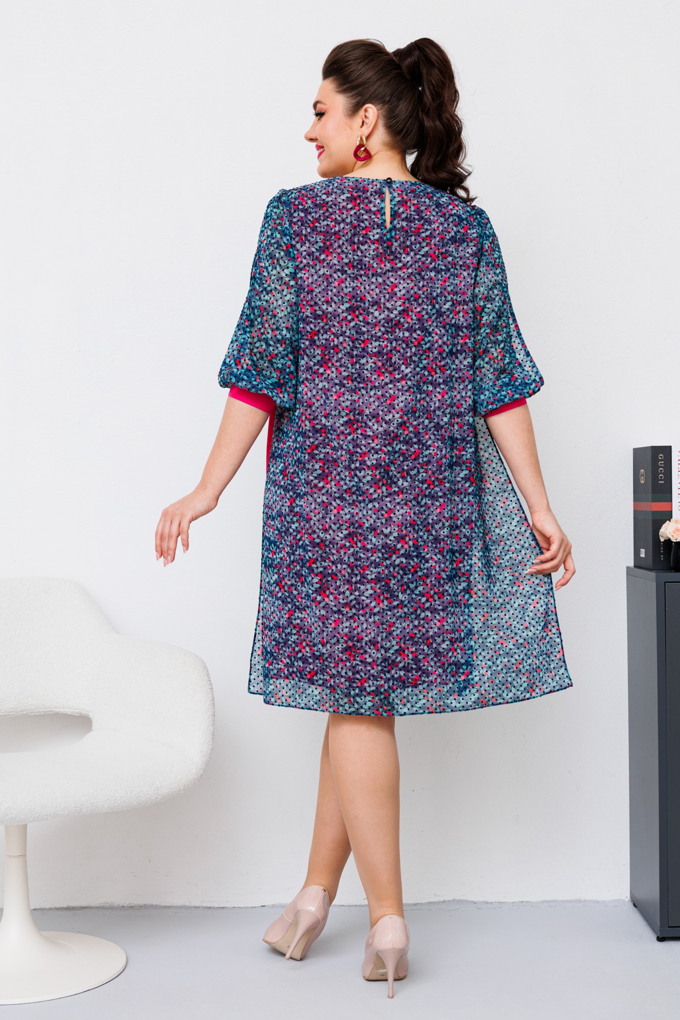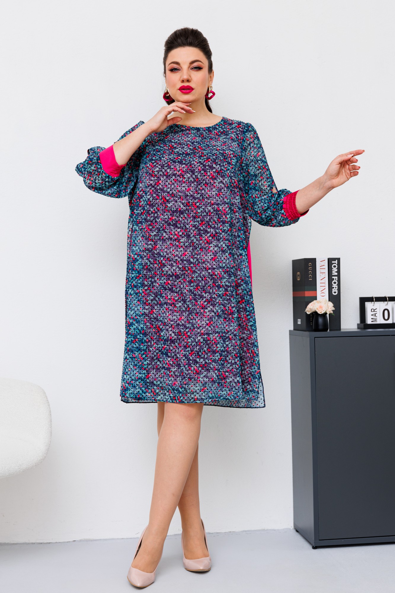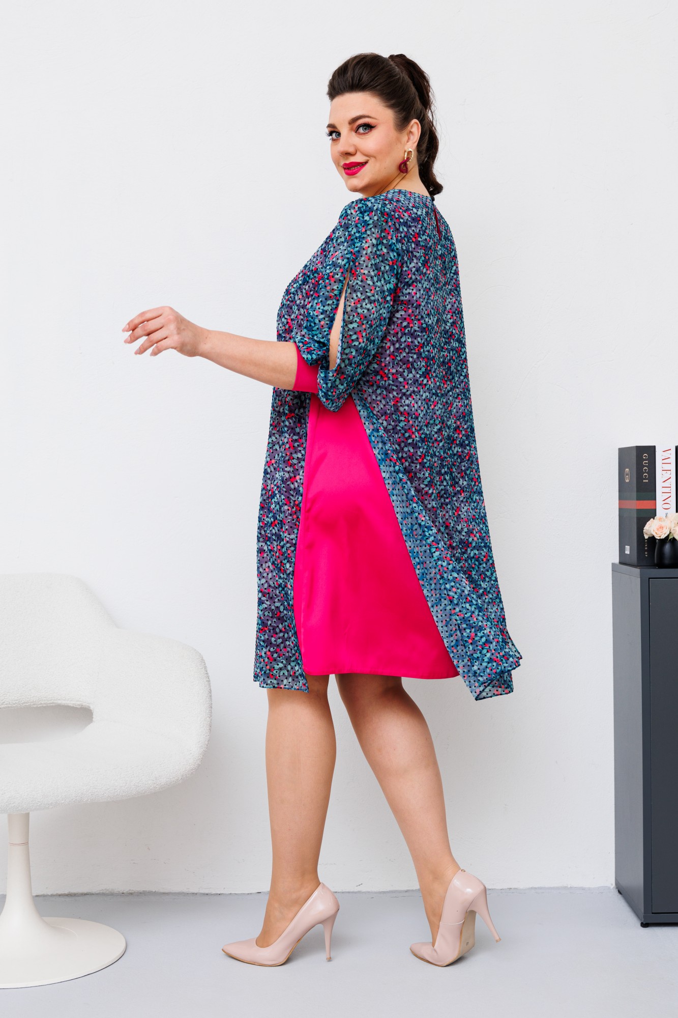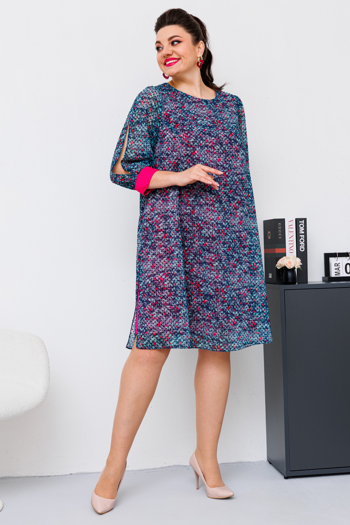 Платье женское, относится к коктейльным платьям. Платье женское, А-силуэта, длиной за колено. Перед с 2-мя нагрудными вытачками, выходящими из проймы. Спинка вверху по горловине с обтачным разрезом, фиксирующимся на 1-ну навесную петлю и 1-ну пришивную пуговицу. Горловина круглая, обтачная, без воротника. Боковые швы с очень высокими разрезами. Рукав втачной, двух шовный, длиной 7/8, с притачной манжетой из отделочной ткани, частично собранной на эластичную тесьму; верхний шов с высоким разрезом. По окату рукава и низу рукава лёгкая сборка. Платье на подкладке из текстильной отделочной ткани. Платье без плечевых накладок.