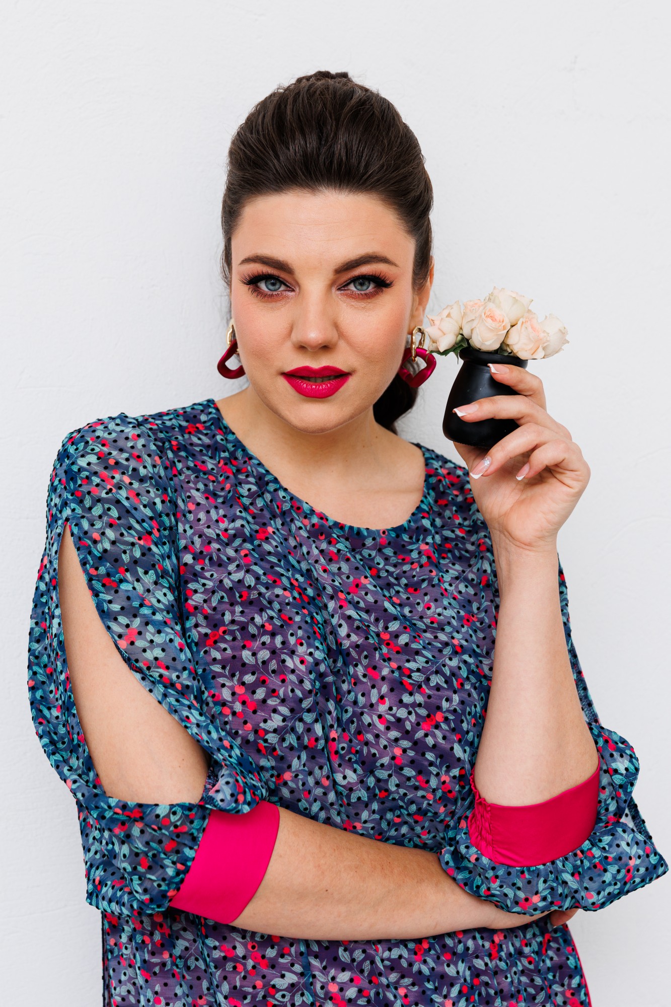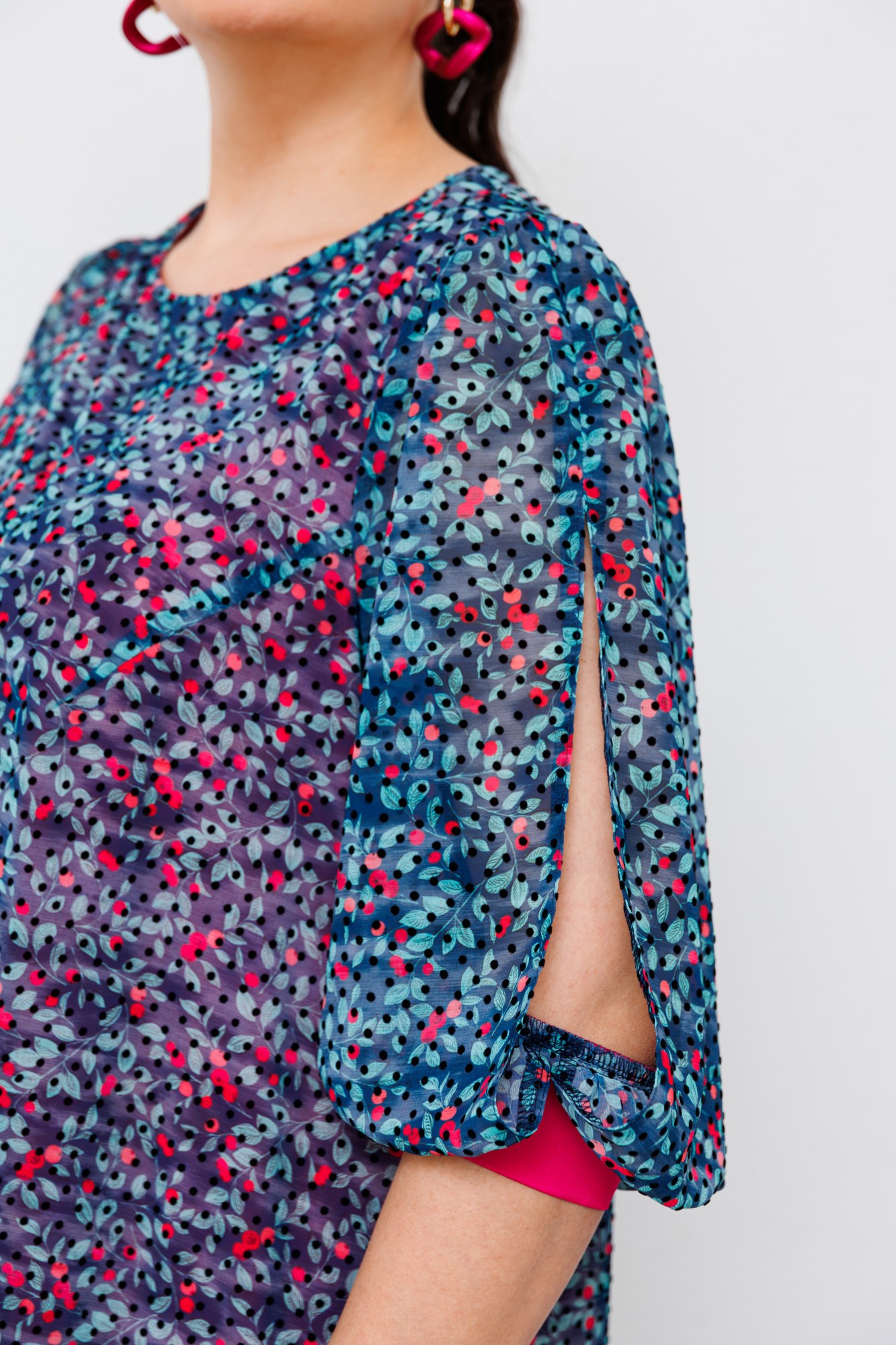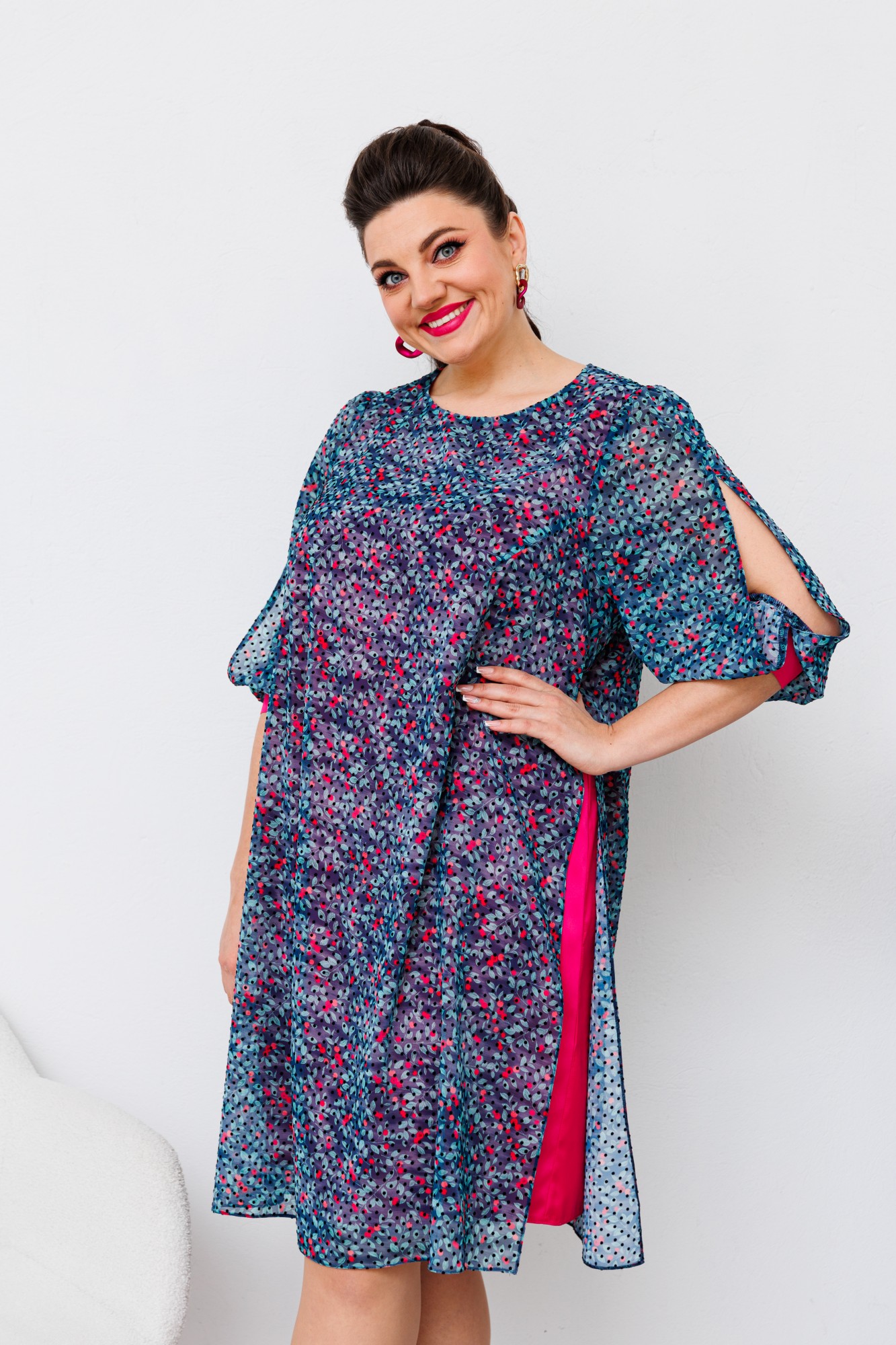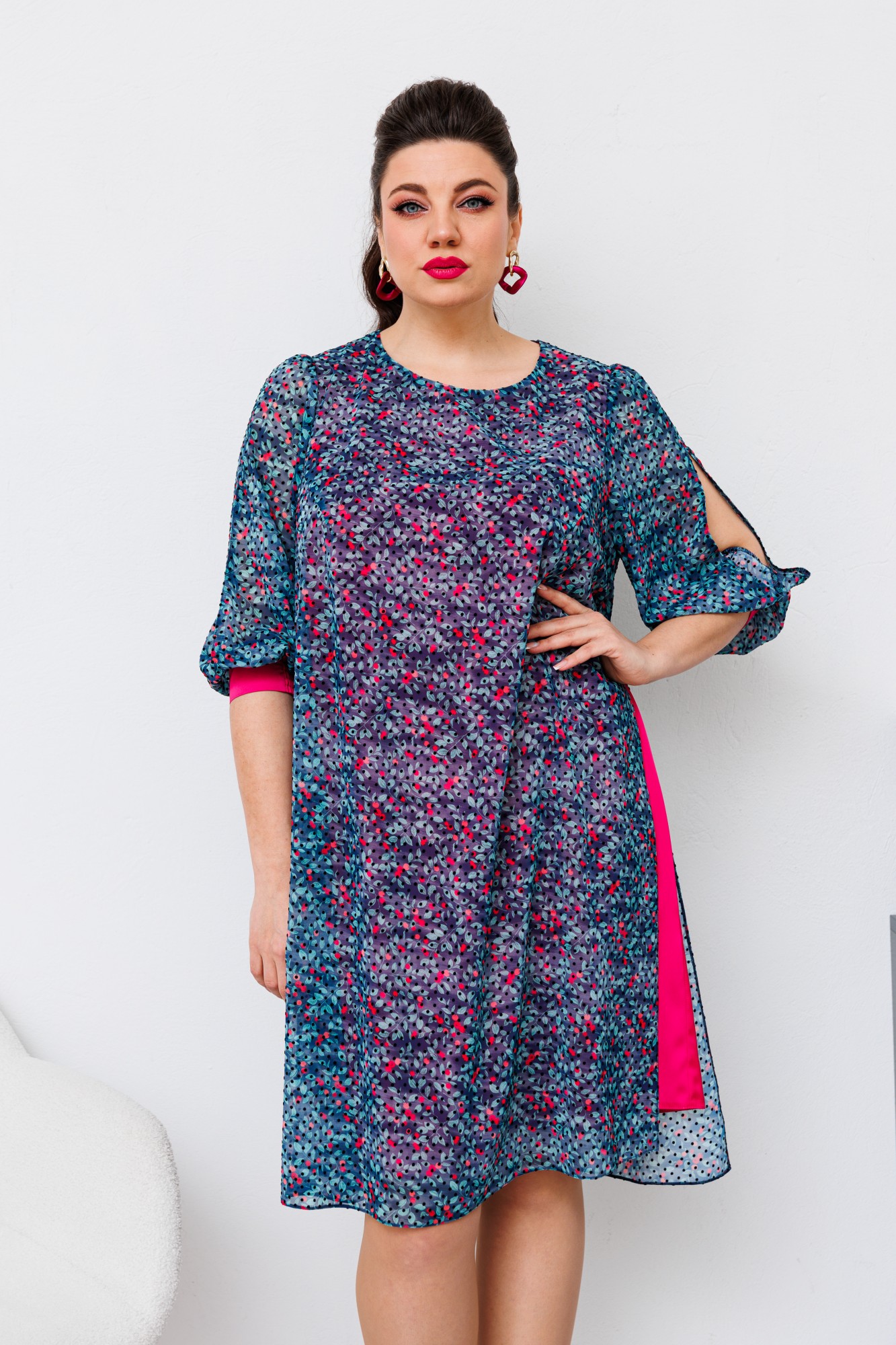 Платье женское, относится к коктейльным платьям. Платье женское, А-силуэта, длиной за колено. Перед с 2-мя нагрудными вытачками, выходящими из проймы. Спинка вверху по горловине с обтачным разрезом, фиксирующимся на 1-ну навесную петлю и 1-ну пришивную пуговицу. Горловина круглая, обтачная, без воротника. Боковые швы с очень высокими разрезами. Рукав втачной, двух шовный, длиной 7/8, с притачной манжетой из отделочной ткани, частично собранной на эластичную тесьму; верхний шов с высоким разрезом. По окату рукава и низу рукава лёгкая сборка. Платье на подкладке из текстильной отделочной ткани. Платье без плечевых накладок.