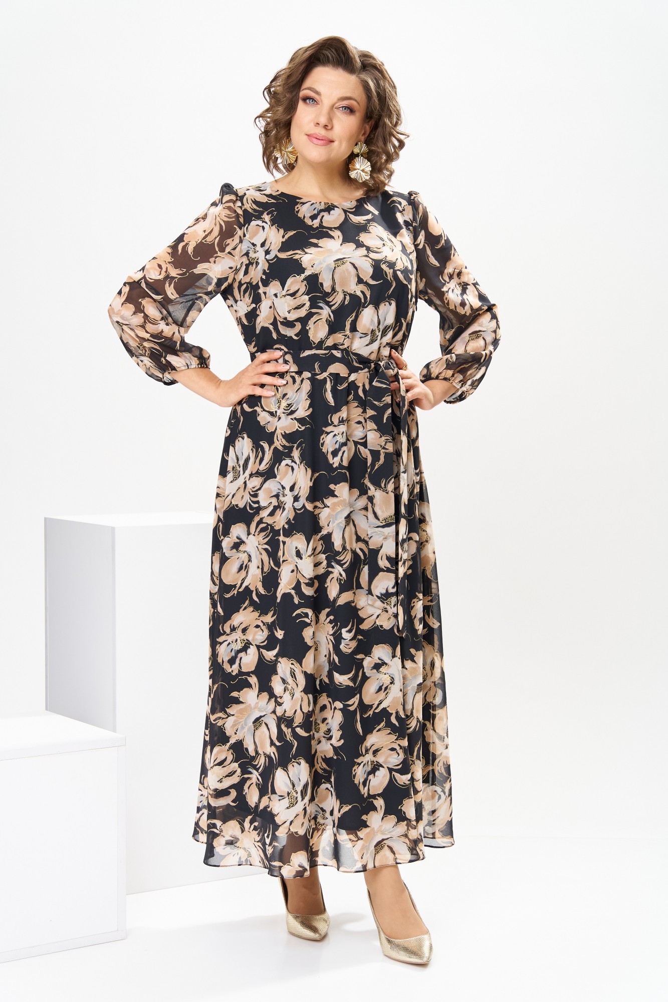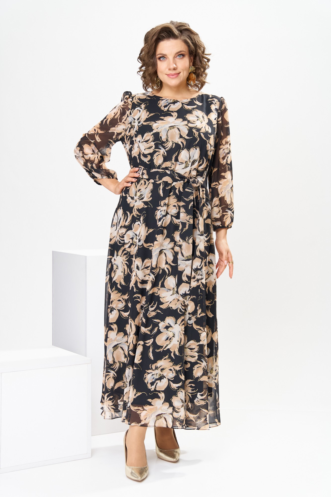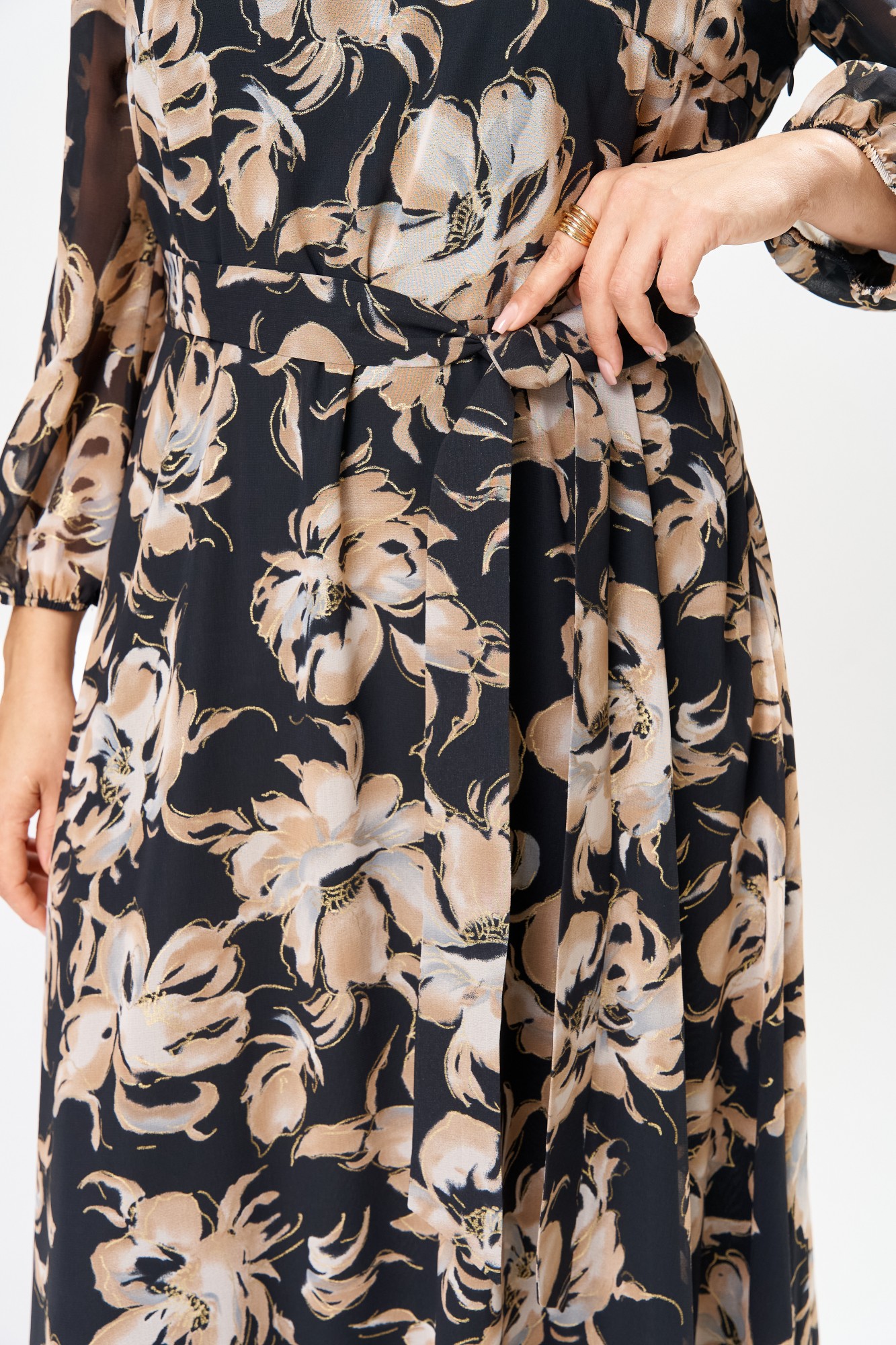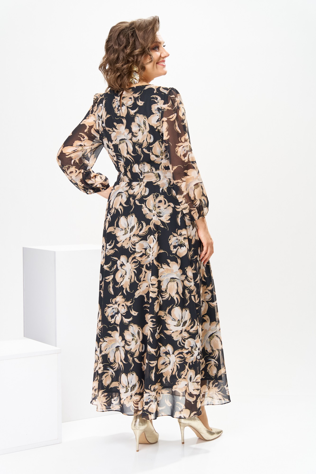 Платье женское относится к нарядной торжественной одежде. Платье женское отрезное по линии талии, расширенное к низу, длинное. Верхняя часть переда с 2-мя нагрудными вытачками, нижняя часть цельнокроеная. Верхняя часть спинки с 2-мя таллиевыми вытачками, с обработанным разрезом по головине, фиксирующимся на 1-ну навесную петлю и 1-ну пришивную пуговицу; нижняя часть спинки цельнокроеная. Горловина круглая, обточная, без воротника. Рукав втачной одно шовный, длинный. Рукав со сборкой по окату. Низ рукава собран на эластичную тесьму. Платье на подкладке. Платье без плечевых накладок. К платью прилагается съёмный пояс.