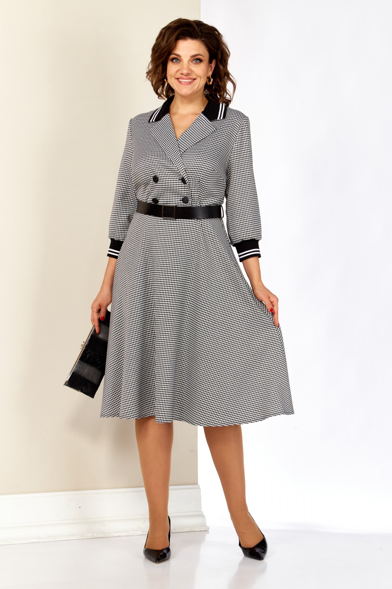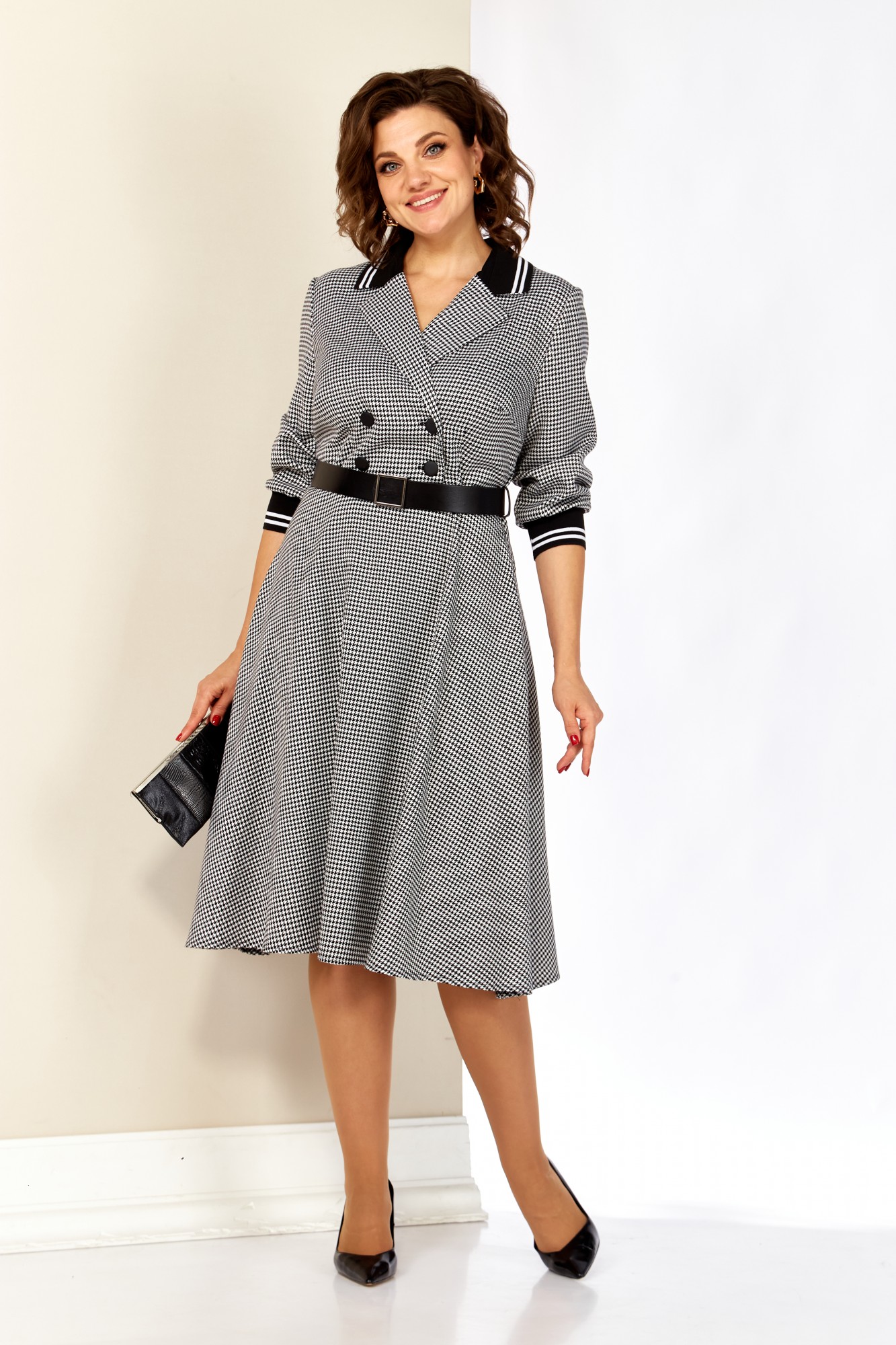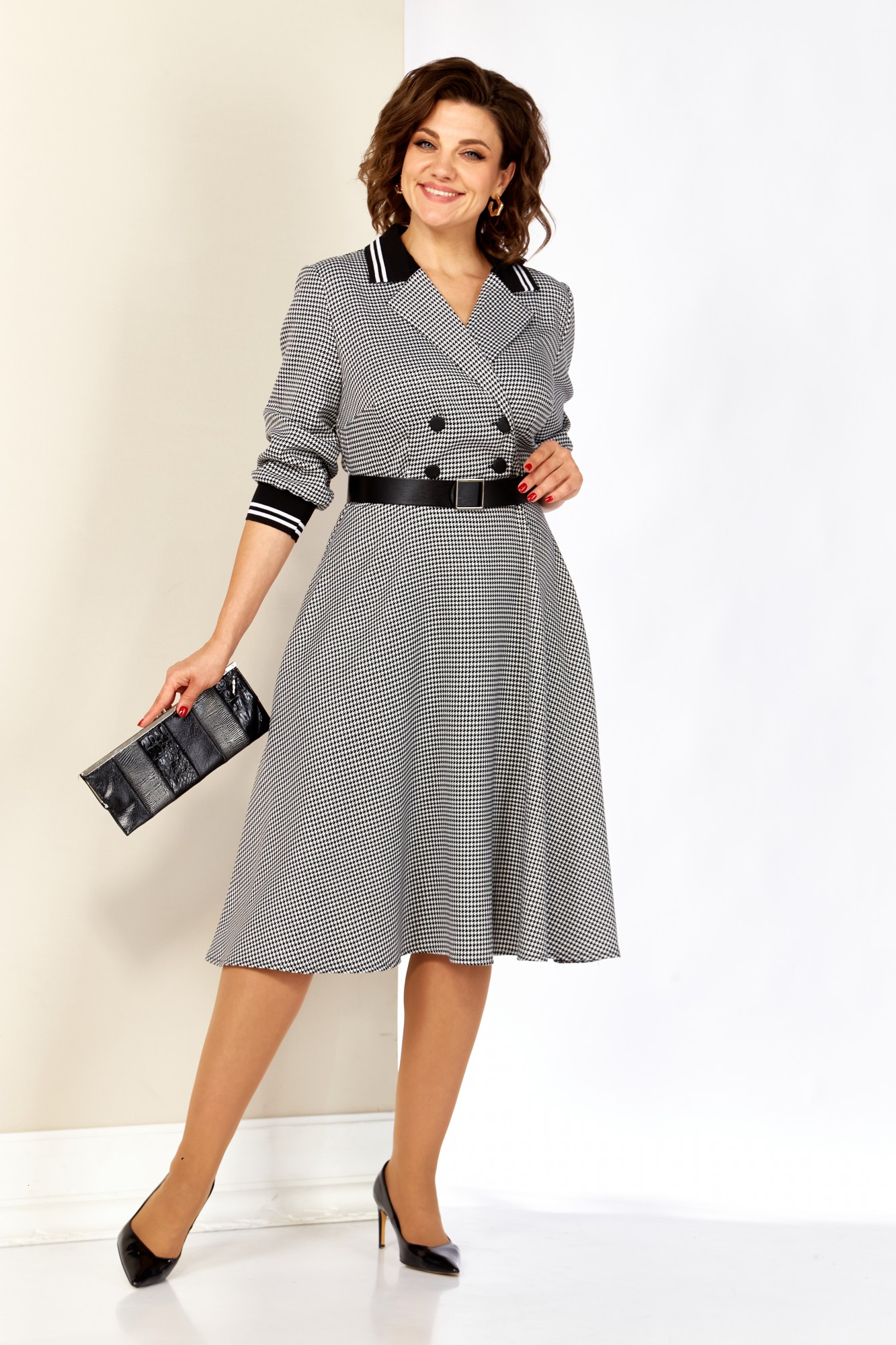 Женское элегантное классическое платье из костюмно-плательной ткани с рисунком «Гусиная лапка». Платье полу прилегающего силуэта, отрезное по линии талии, расклешенное к низу. Лиф переда с двубортной застежкой и нагрудными вытачками, выходящими из боковых швов. Спинка с таллиевыми вытачками по лифу. В боковых швах платья расположены только карманы, застежки на потайной молнии не будет! Воротник отложной. Современная модель с рукавам ¾ на манжетах, выполненных с эластичного материала (резинка-довяз). Платье с идеальной посадкой. Впишется в дресс-код и подойдет для офиса и школы. Поможет создать строгий и стильный образ. Сочетается с жакетами, куртками и пиджаками. Модель прекрасно дополнит современный гардероб и станет основной базовой вещью, которую можно обыграть любыми аксессуарами и различной обувью. Платье в комплекте с декоративным ремнем из эко-кожи. Прилагается таблица для правильно определения своего размера.