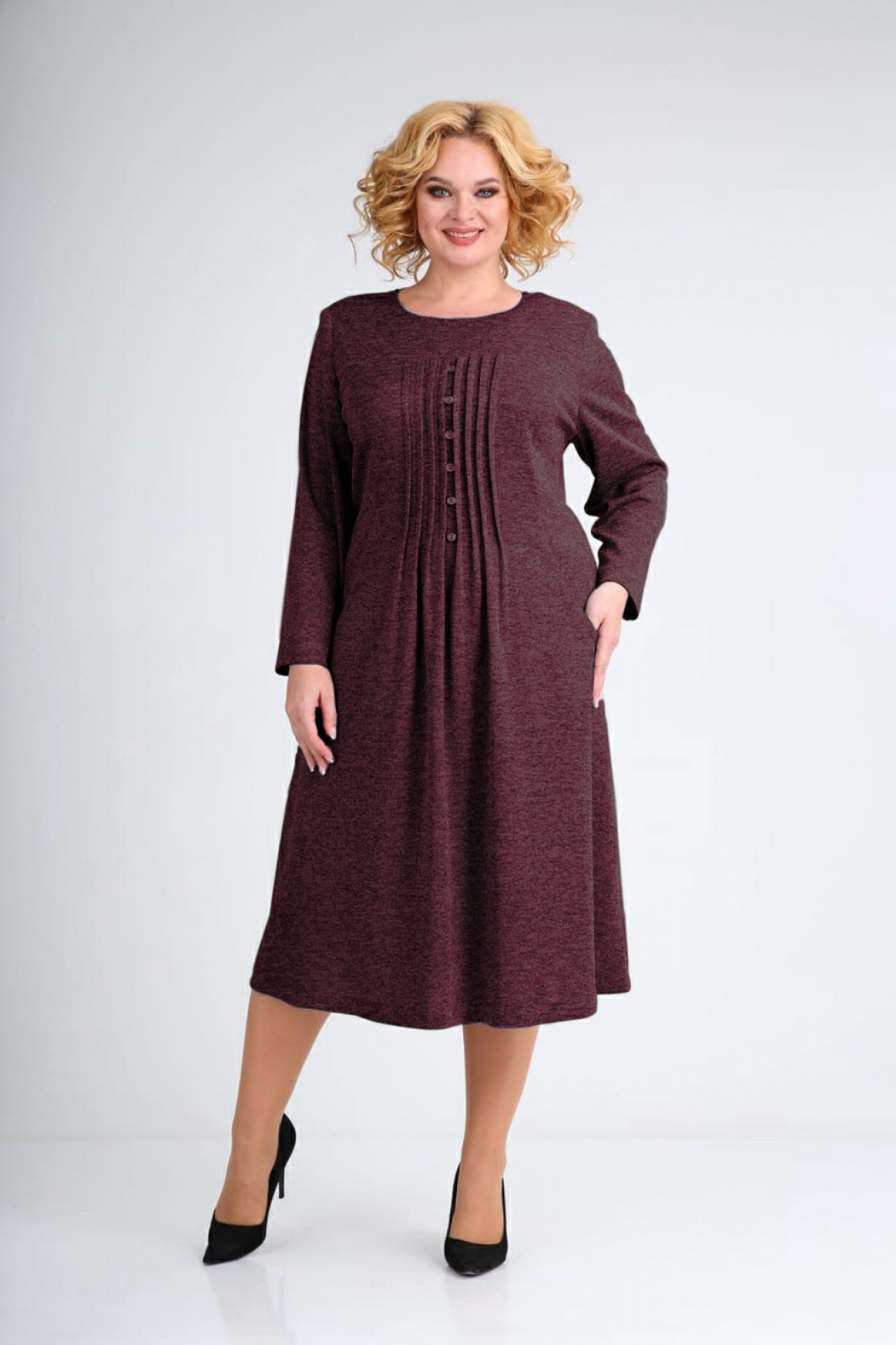 Силуэт полуприлегающий, расширенный к низу. Рукав втачной, одношовный. Низ рукава драпируется патой с застёжкой на пуговицу. Горловина платья закруглённой формы, оформлена отрезной бейкой. Перед платья с отрезной кокеткой и с нагрудными рельефами от кокетки, уходящими в боковой шов. По центру переда застрочены 8 вертикальных складок, между двумя центральными пришиты 6 пуговиц. Внизу рельефов выполнены потайные карманы. Спинка со средним швом.