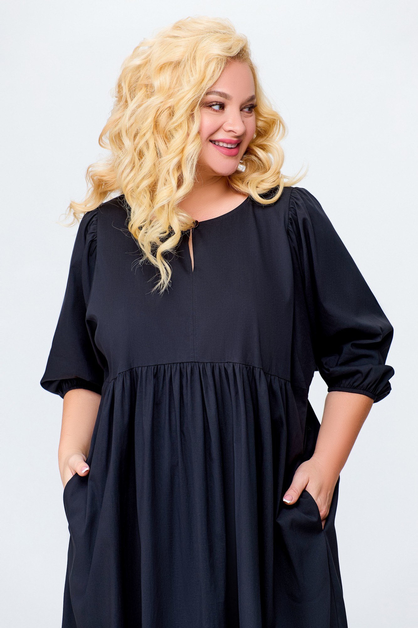 Платье отрезное по линии талии. Перед лифа со средним швом и разрезом с застёжкой по горловине на навесную петлю и декоративную пуговицу. Юбка со сборкой по линии талии и карманами в боковых швах. По низу юбки пришита фирменная эмблема «SWАLLOW». Рукав цельнокроеный, отрезной по линии проймы, со сборкой по окату. Низ рукава собран на эластичную тесьму.