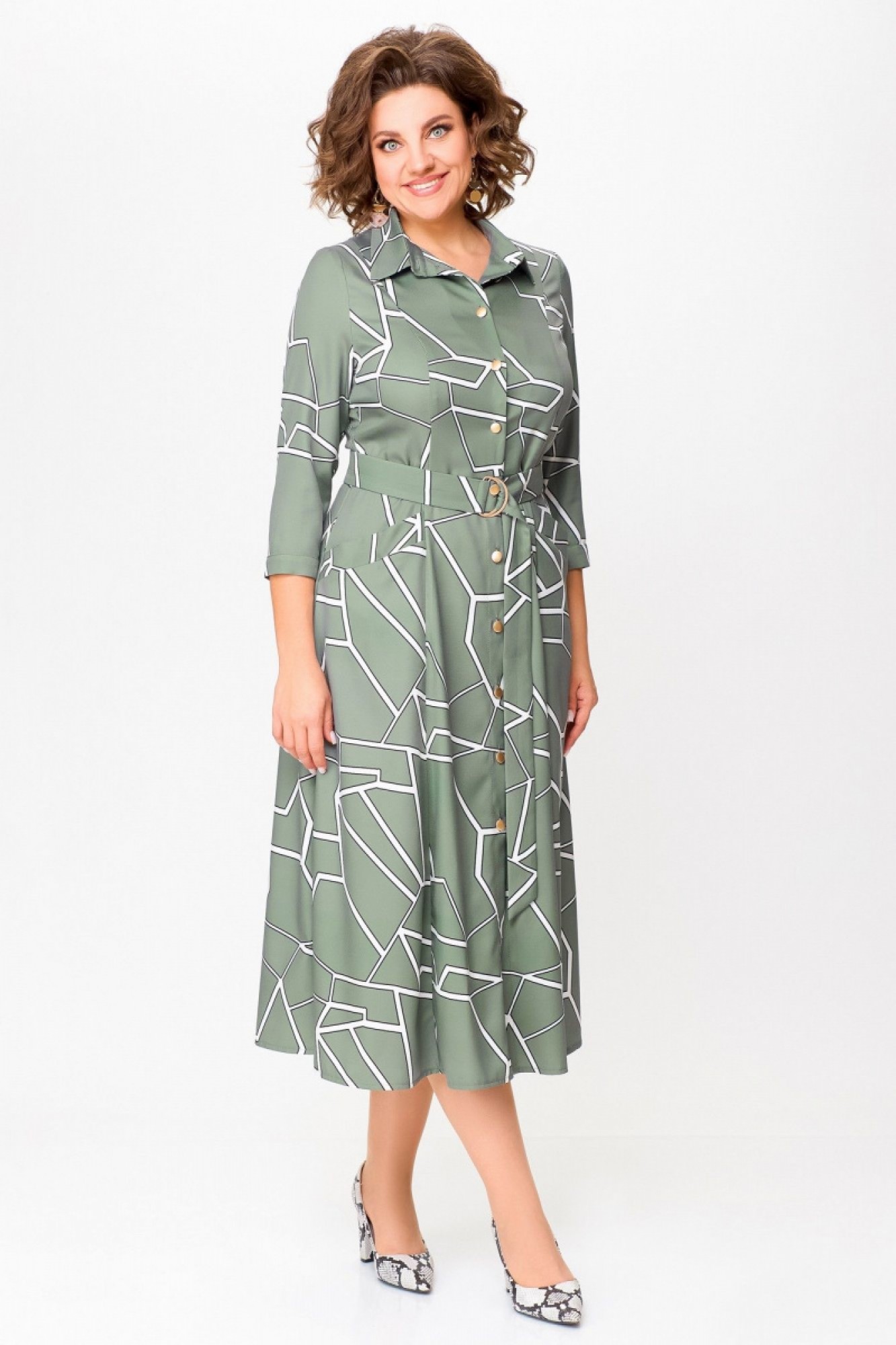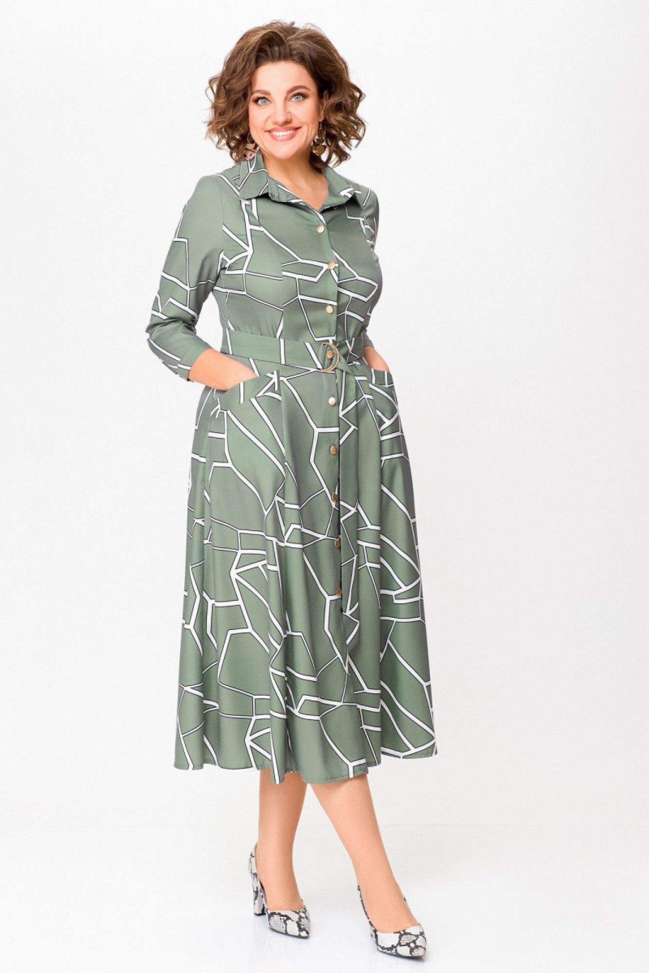 Платье из мягкой вискозной ткани отрезное по линии талии с полуприлегающим лифом и юбкой А-силуэта, с центральной застёжкой на петли и декоративные пуговицы. Полочка с вертикальными рельефами, спинка с кокеткой и отрезными бочками. Юбка состоит из семи клиньев. По переду между швами обработан карман с планкой на косую. Воротник отложной рубашечного типа, с отрезной стойкой. Рукав втачной, одношовный длиной ¾, внизу с манжетой, которая застёгивается на петлю и пуговицу. Платье комплектуется поясом из основной ткани, с декоративными полукольцами.