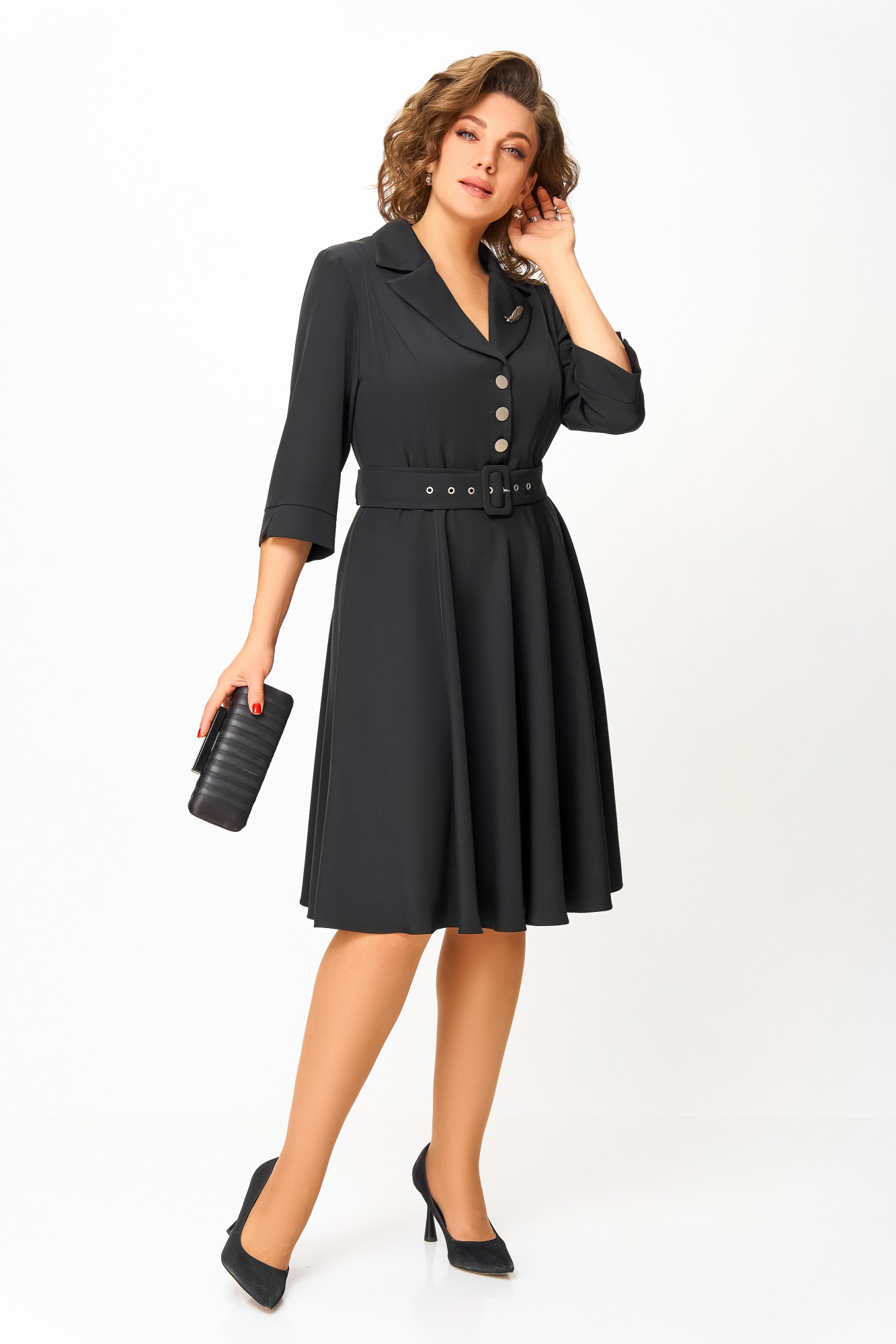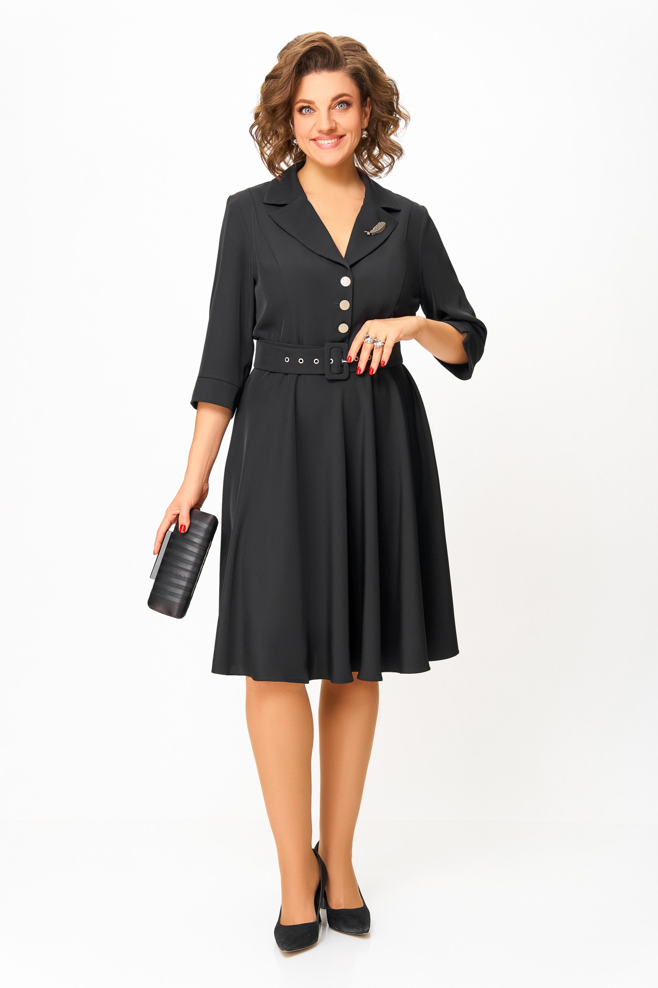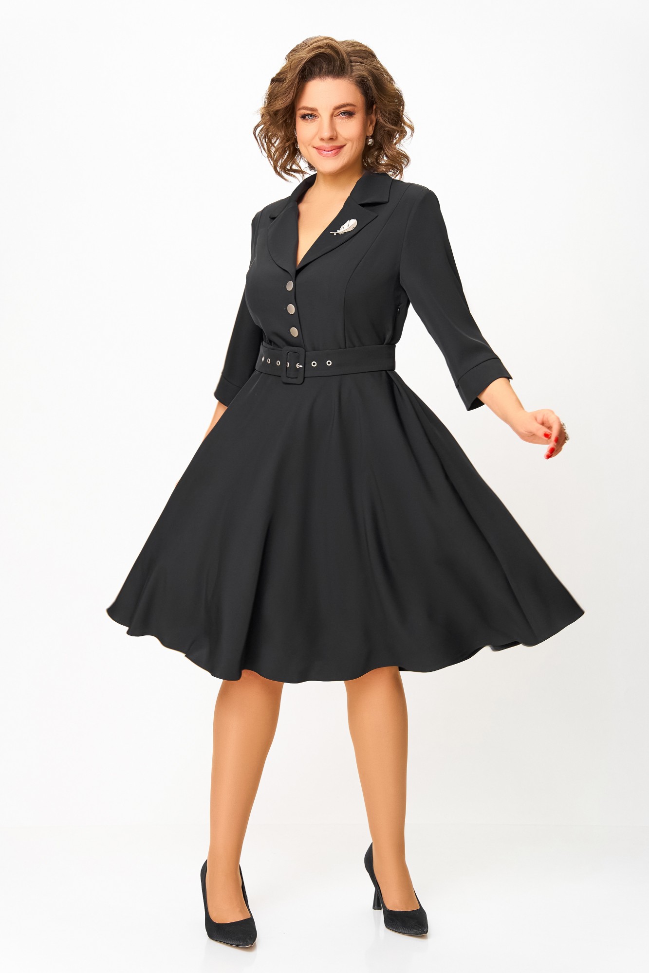 Платье из мягкой поливискозной ткани, Х-образного силуэта с полуприлегающим лифом. Платье отрезное по линии талии. Перед лифа с вертикальными рельефами и застёжкой на петли и 4 декоративные пуговицы. Горловина V-образной формы, с отложными лацканами и воротником пиджачного типа. Спинка лифа с таллиевыми выточками. Рукав втачной, длиной ¾, по низу манжет с разрезом. Застёжка в боковом шве на потайную тесьму-молнию. В комплекте пояс из основной ткани с пряжкой и блочками. В подарок декоративное украшение – брошь.