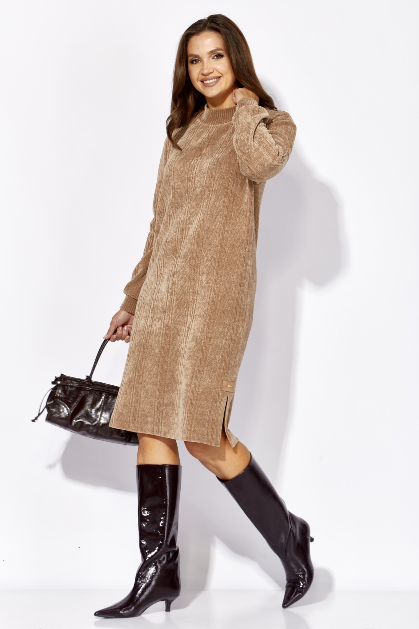 Платье женское, прямого силуэта с длинным рукавом. Рукав со спущенной линией плеча, по низу на манжете. Горловина оформлена высокой, мягкой стойкой. По боку разрез, акцентирован декоративной стойкой. Спинка без особенностей.