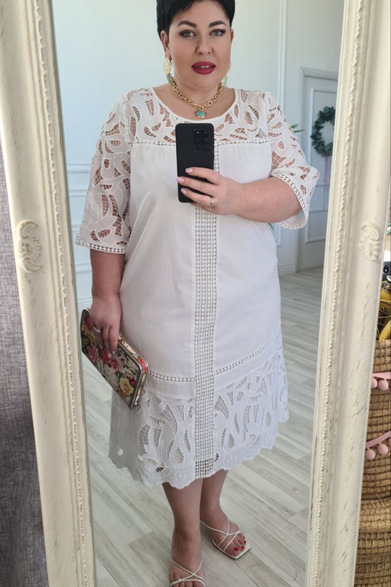 Шикарное платье из хлопка с кокеткой из ришелье - идеально для всех, украсит любую фигуру и сделает Ваш образ неотразимым! В нем вы всегда будете ловить на себе восхищённые взгляды. Платье, расклешенное к низу с кокеткой из ришелье на просвет по переду и спинке, которая роскошно подчеркивает данную модель. Горловина в платье округлой формы, в подрез над грудью вставлено кружево и идёт лёгкая сборка. По центру переда платья вставка из широкого кружева до низа. Низ в платье оформлен вставкой из ришелье с кружевом в подрезе. По спинке кокетка из ришелье, шов притачивания кокетки к спинке дополнен кружевом. Рукав втачной, одношовный, из ажурной ткани в ришелье на просвет, по низу обработан кружевом. Платье на хлопковой подкладке.