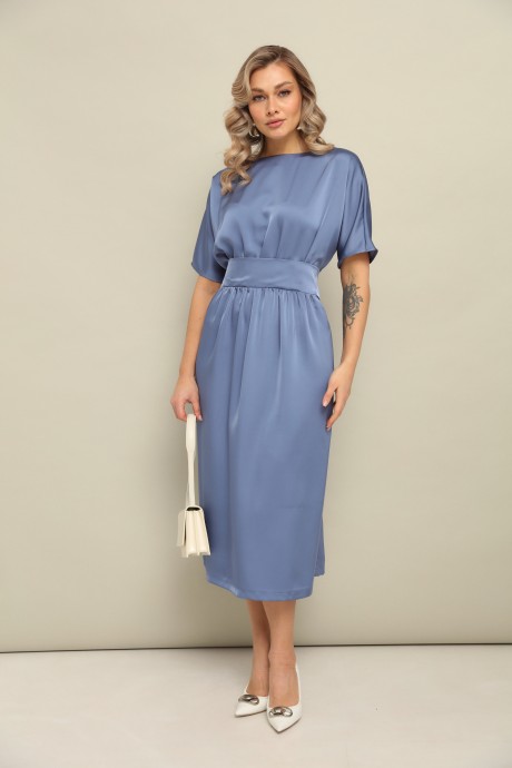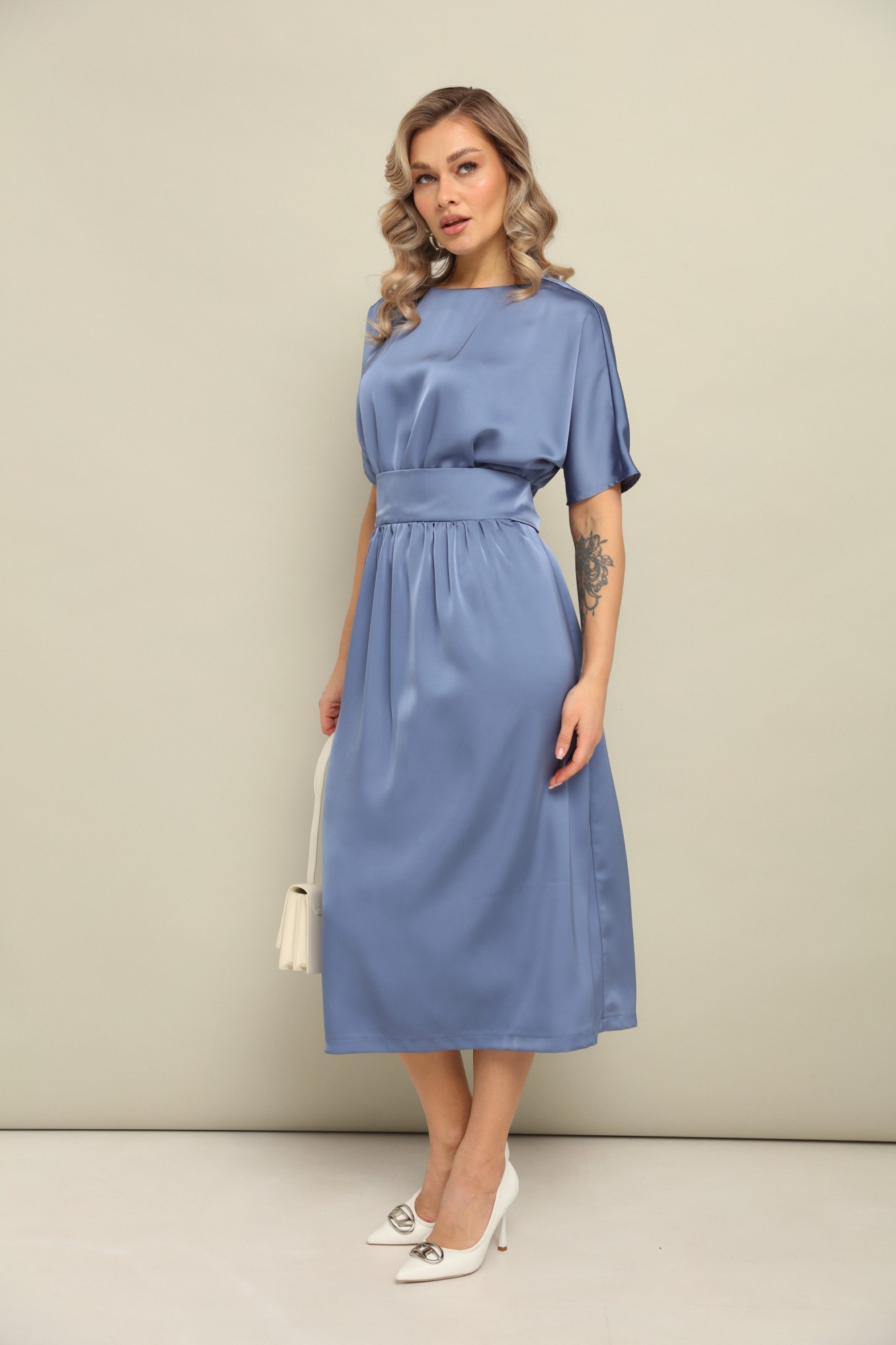 Платье длины миди со свободной юбкой и пришивным по переду поясом. Рукав цельнокроеный. По спинке встречные складки и застёжка по линии горловины на пуговицу.