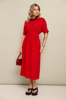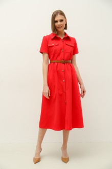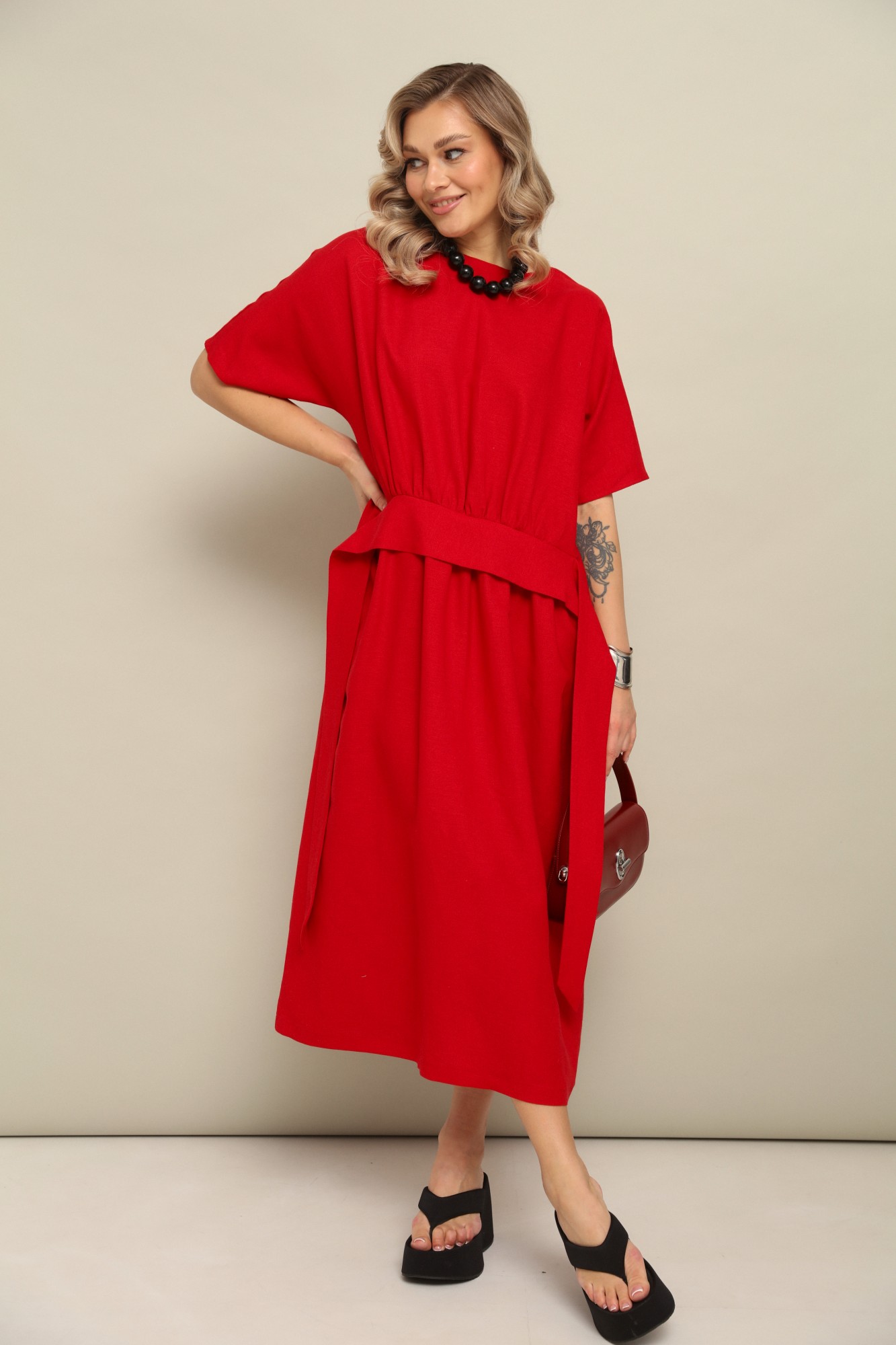 Платье длины миди со свободной юбкой и пришивным по переду поясом. Рукав цельнокроеный. По спинке встречные складки и застёжка по линии горловины на пуговицу.