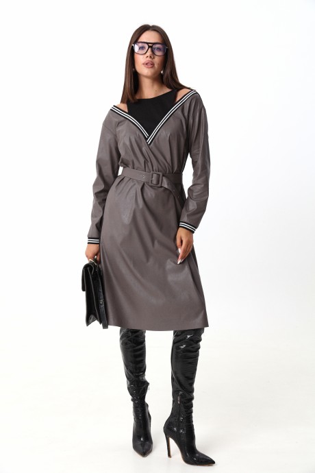 Платье свободного силуэта длины ниже колена с длинными втачными рукавами, выполнено из двух видов ткани. По переду платья имитация топа и открытыми плечами. Отделка горловины платья и манжеты выполнены из довязов в контрастном цвете. Платье дополнено поясом.