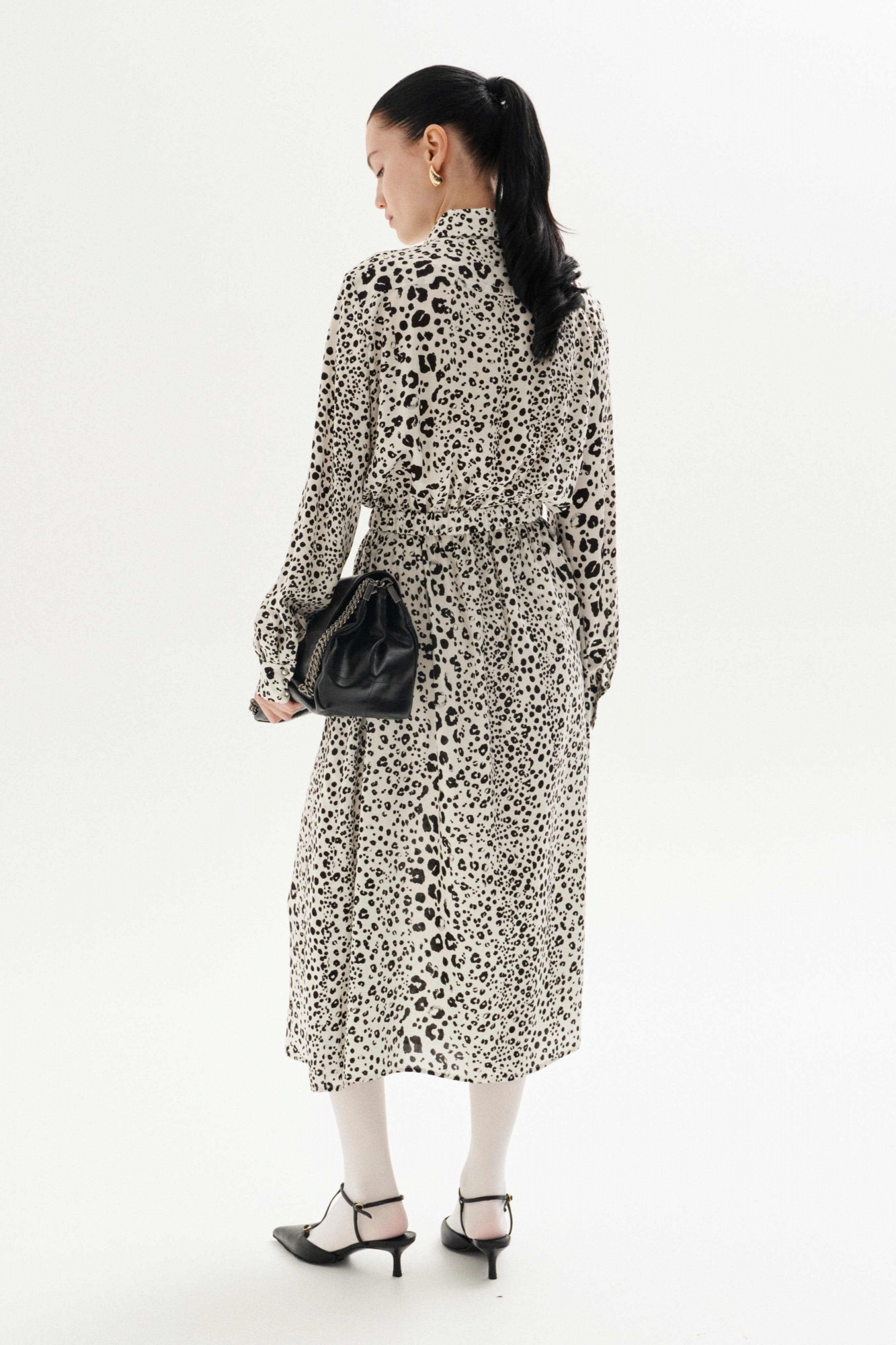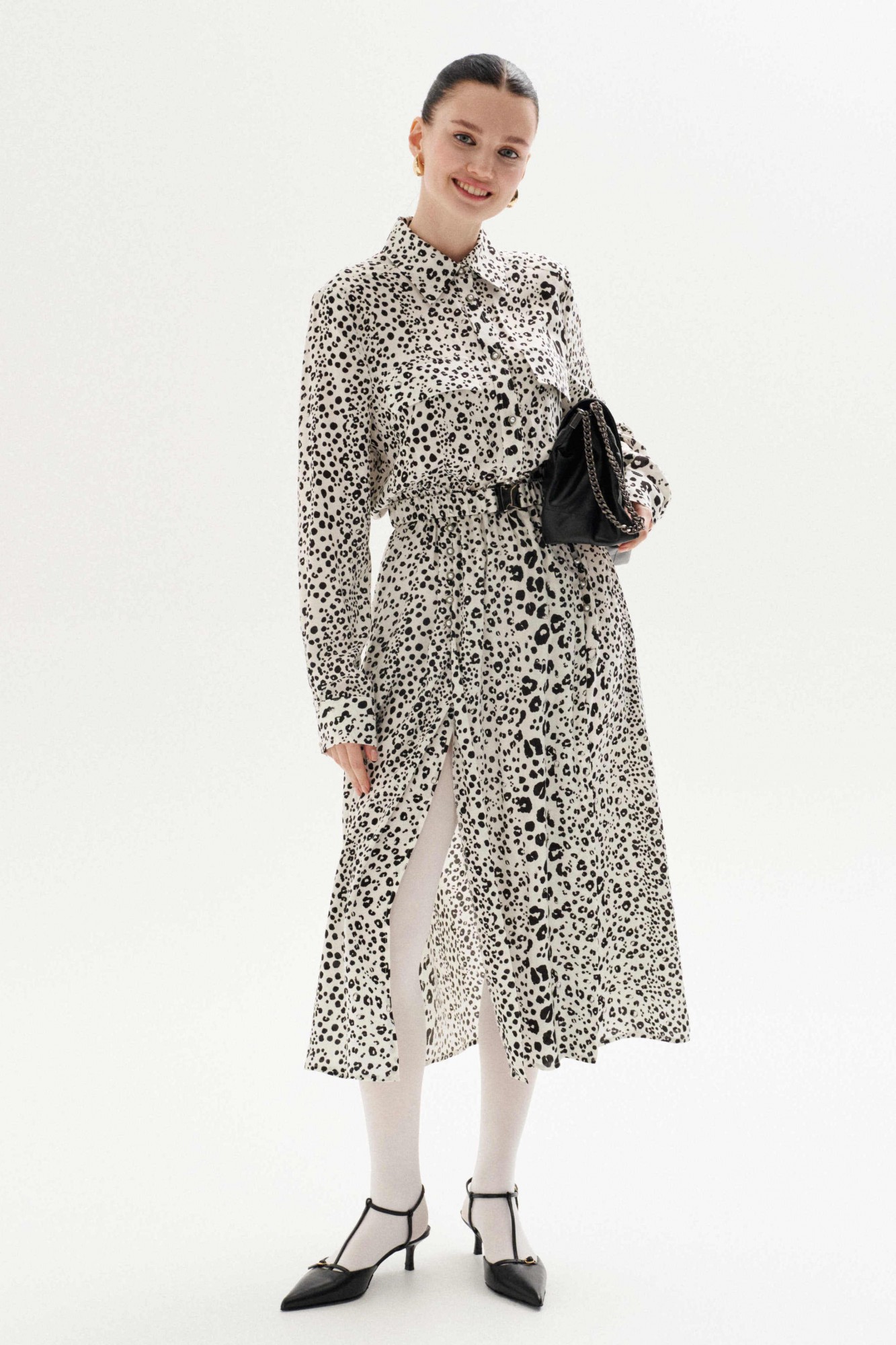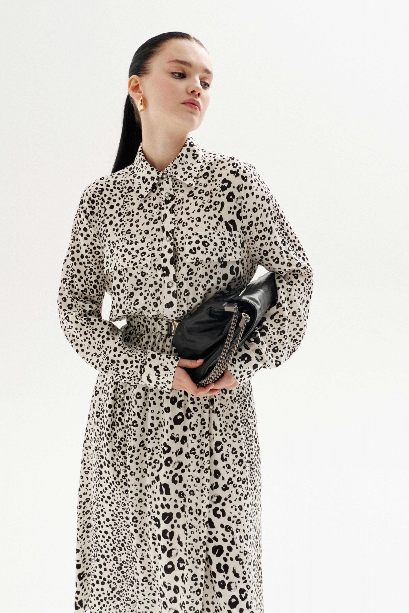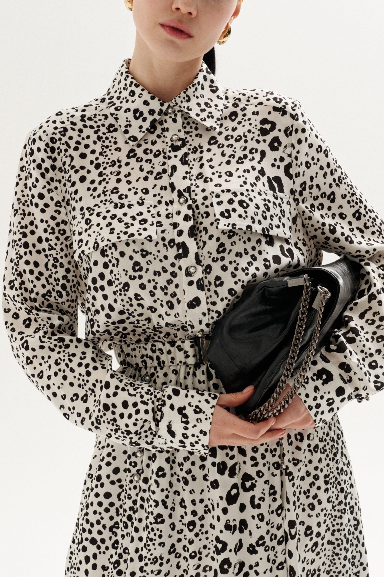 Платье свободного силуэта выполнено из плательной ткани с анималистическим принтом "леопард". Рукав втачной, по низу рукава манжеты на застёжку петлю и пуговицу. Воротник рубашечного кроя, застёжка до линии талии на петли и пуговицы, по лифу клапаны выше линии груди клапаны. Линия талии отрезная на резинке. По переду юбки два глубоких запаха, которые фиксируются навесными петли и пуговицами. По лифу спинки кокетка и отрезная линия талии. К платью прилагается съёмный пояс из основной ткани, на резинке, с металлической пряжкой.