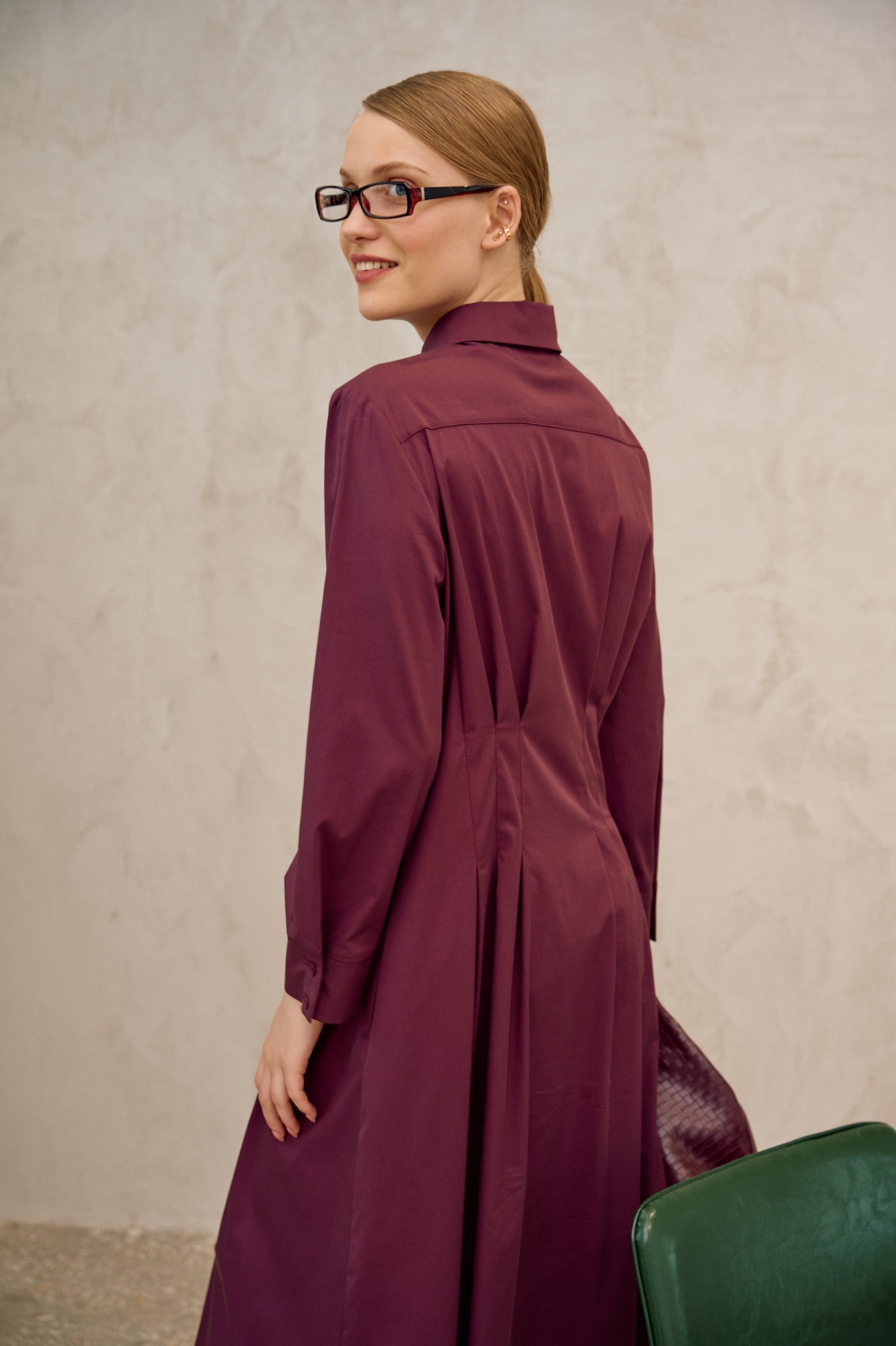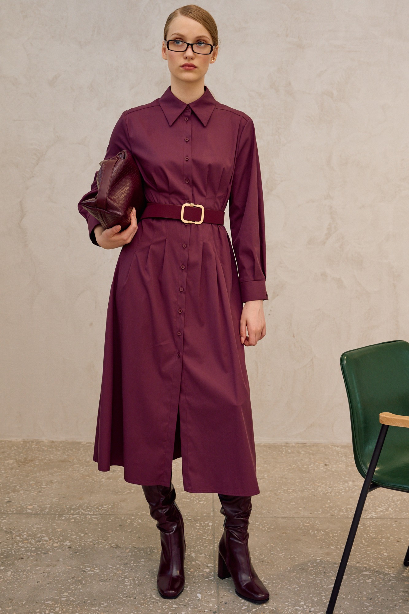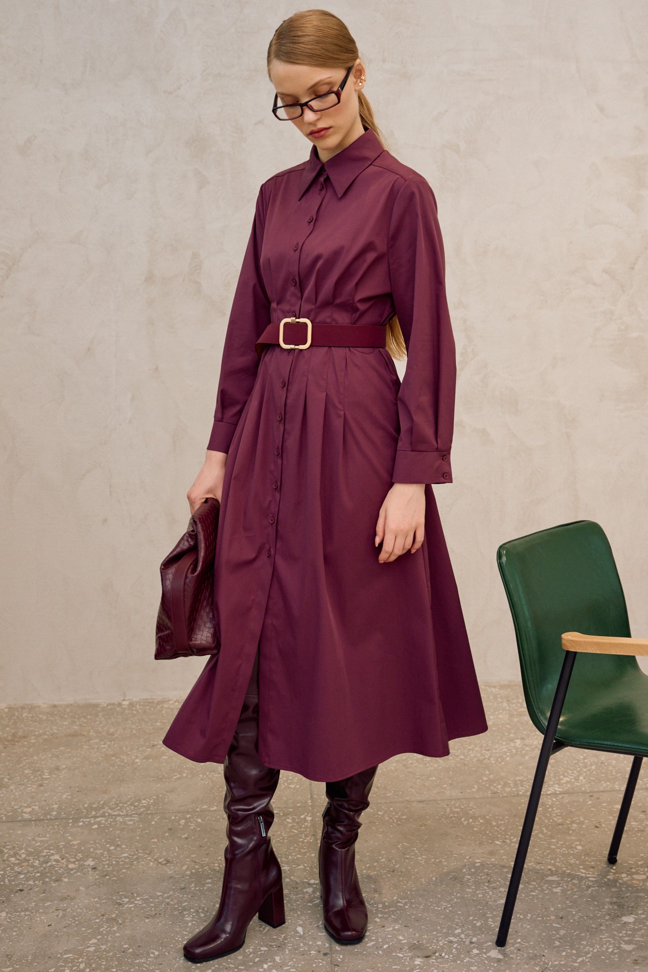 Платье полуприлегающего силуэта, выполнено из хлопковой ткани. Рукав втачной, по низу рукава манжета с застежкой на петли и пуговицы. Воротник рубашечного кроя, застежка на петли и пуговицы, в боковых швах карманы. По переду и спинке в области талии складки, по спинке кокетка. К платью прилагается пояс.