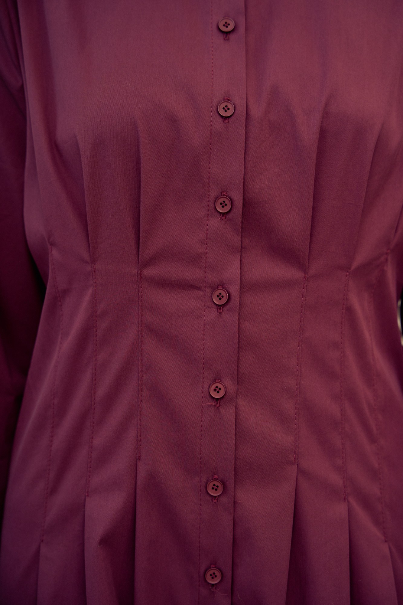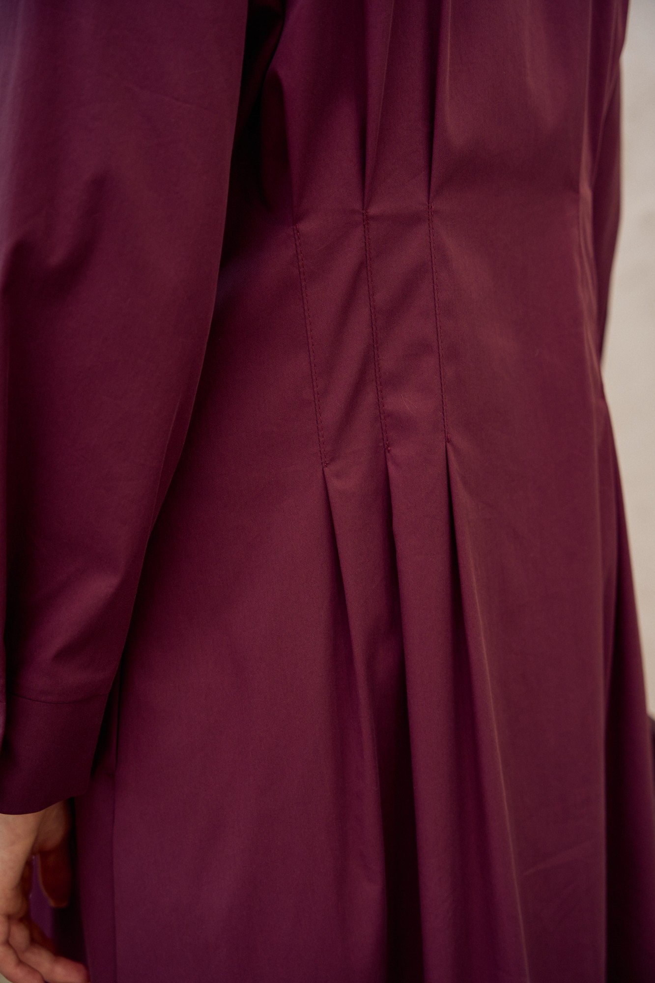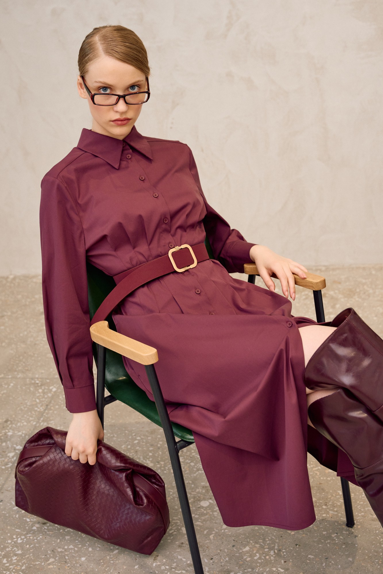 Платье полуприлегающего силуэта, выполнено из хлопковой ткани. Рукав втачной, по низу рукава манжета с застежкой на петли и пуговицы. Воротник рубашечного кроя, застежка на петли и пуговицы, в боковых швах карманы. По переду и спинке в области талии складки, по спинке кокетка. К платью прилагается пояс.
