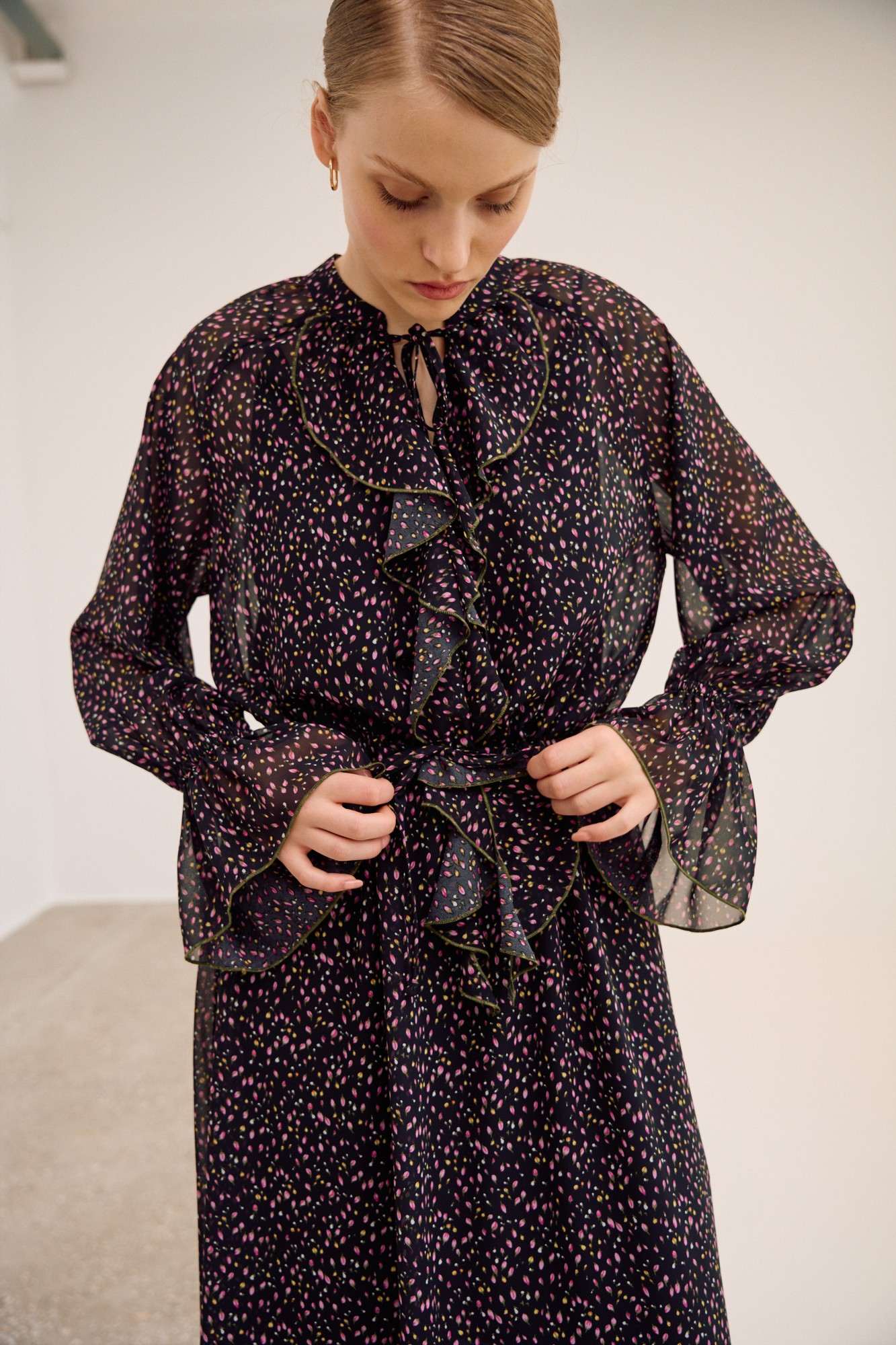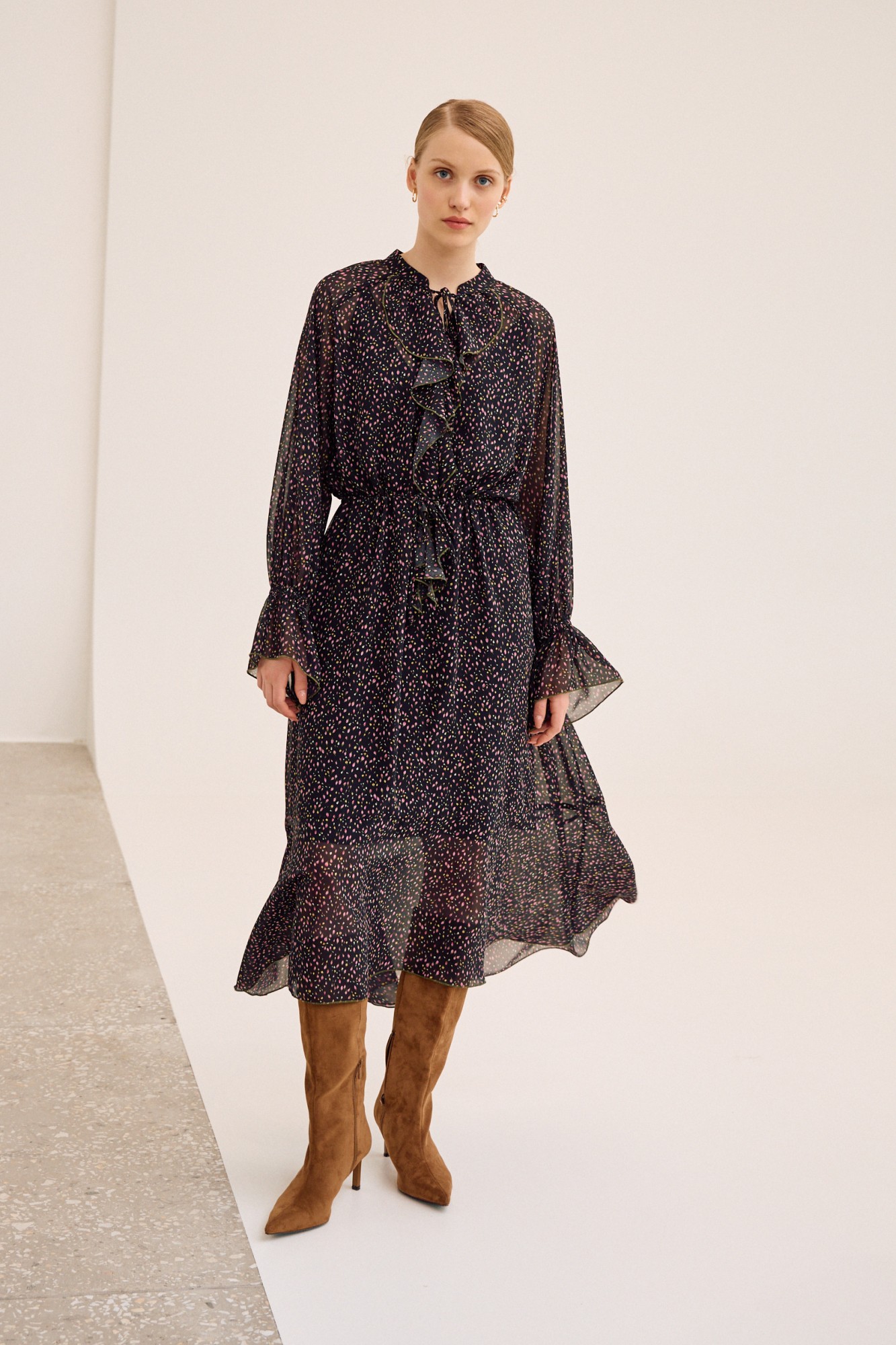 Платье свободного кроя, выполнено из шифона, дизайн мелкий цветочек. Рукав длинный реглан, по низу рукава резинка. Глубокий V-образный вырез горловины, в который вставлена рюша, по горловине стойка на завязку, по середине выреза застежка на навесной потайной крючок. По линии талии по переду и спинке кулиса на завязку, по низу платья притачной волан. В комплект входит платье-комбинация из трикотажной подкладки на бретелях.