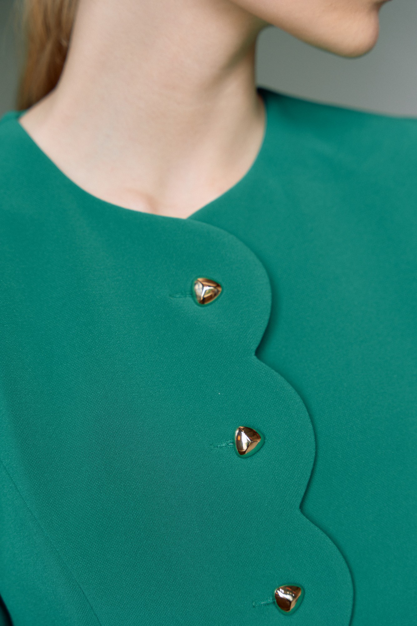 Платье полуприлегающего силуэта, по переду и спинке на подкладке. Рукав втачной ¾, по низу фигурный. Округлый вырез горловины, застежка центральная на петли и пуговицы, борт фигурной формы. По вертикальный рельефы и прорезные карманы. По спинке средний шов и вертикальные рельефы.