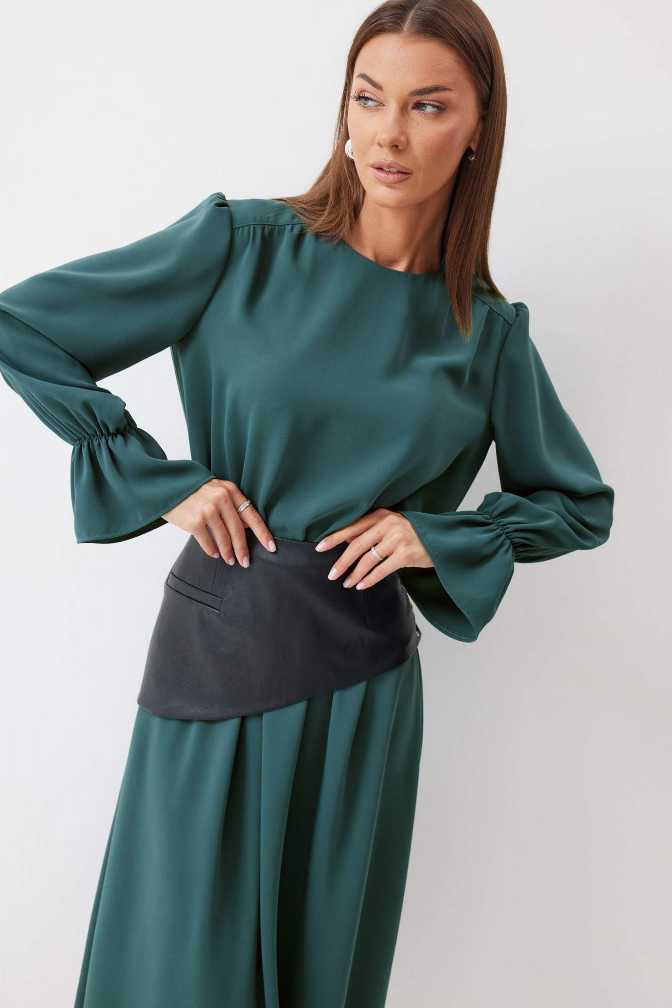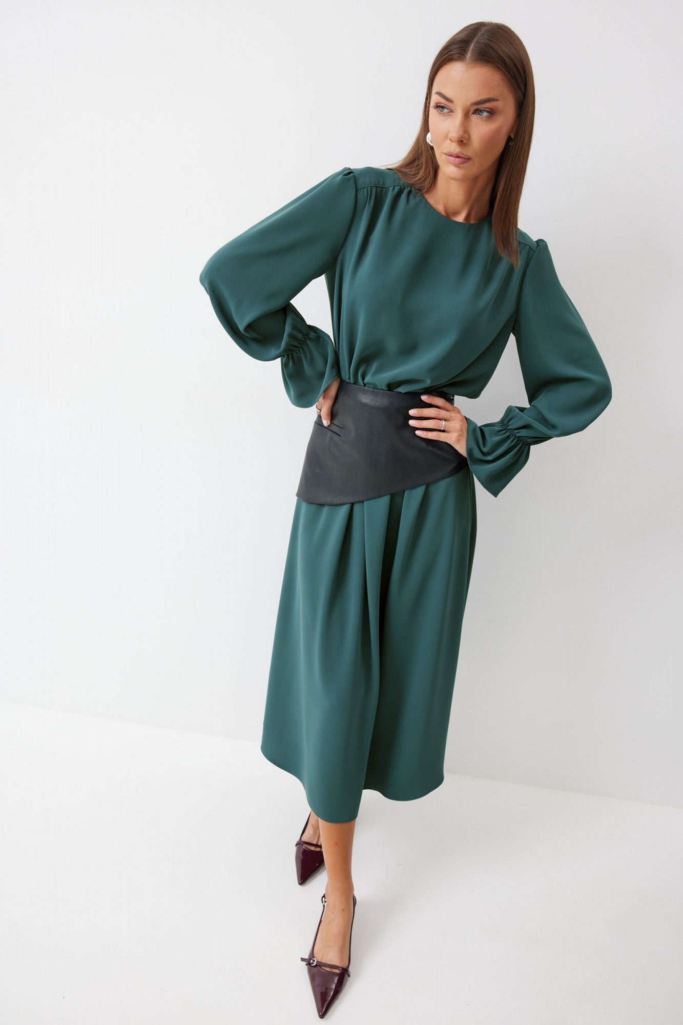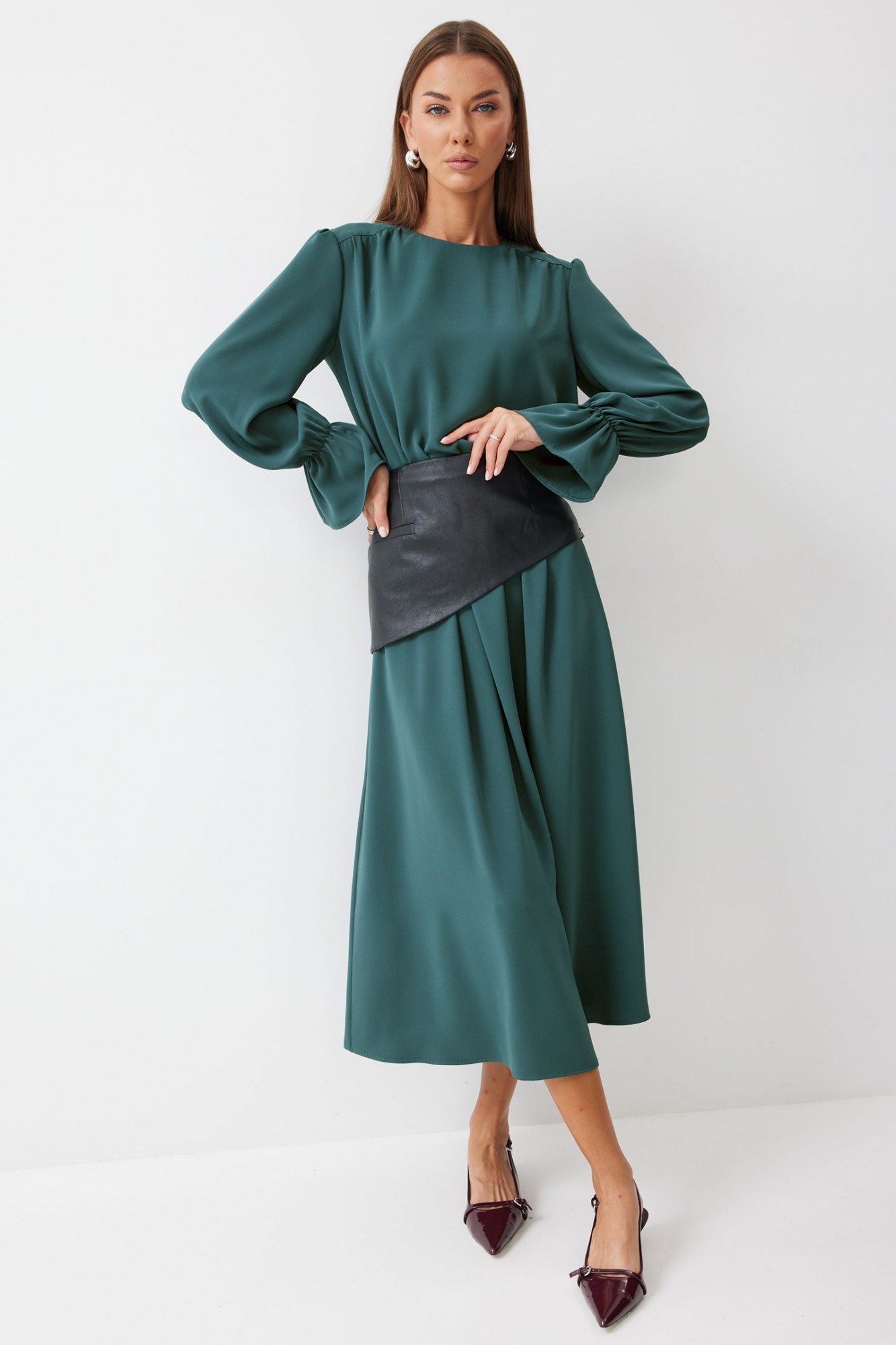 Платье полуприлегающего силуэта из струящейся ткани. В области талии расположен подрез, с эластичной тесьмой. Рукав втачной, со сборкой по плечу, по низу волан, собранный на резинку. Юбка А-силуэта. Платье дополняет съёмная деталь в виде баски из эко кожи, с шнуровкой в боковом шве.