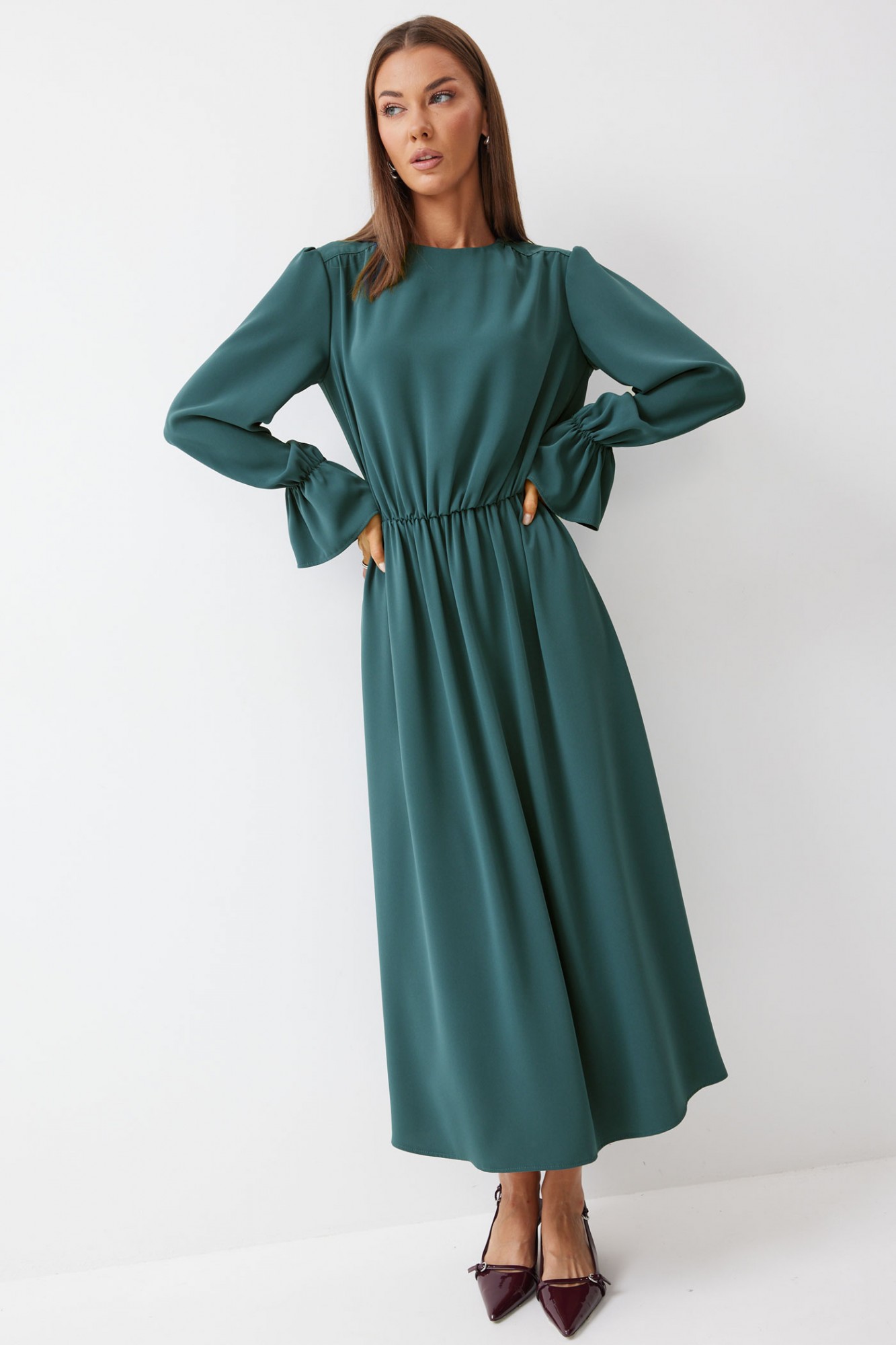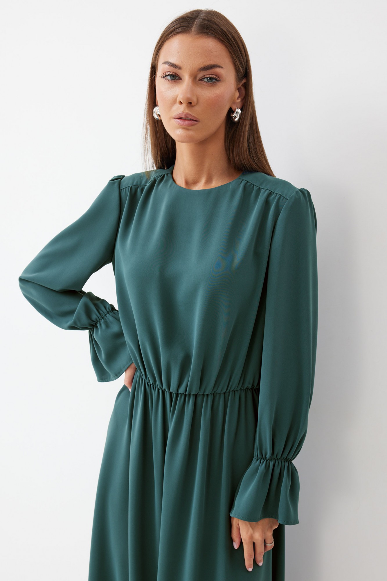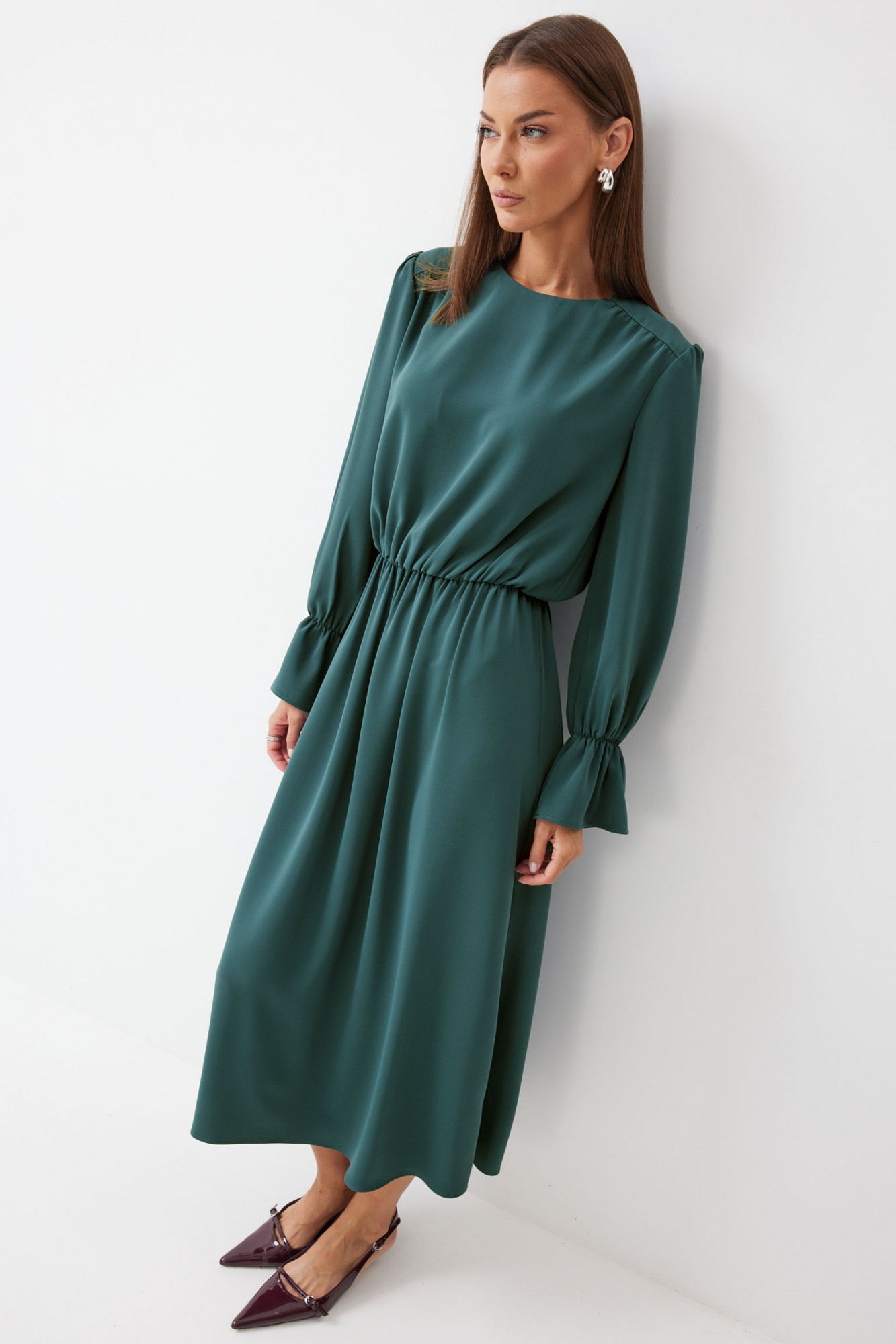 Платье полуприлегающего силуэта из струящейся ткани. В области талии расположен подрез, с эластичной тесьмой. Рукав втачной, со сборкой по плечу, по низу волан, собранный на резинку. Юбка А-силуэта. Платье дополняет съёмная деталь в виде баски из эко кожи, с шнуровкой в боковом шве.