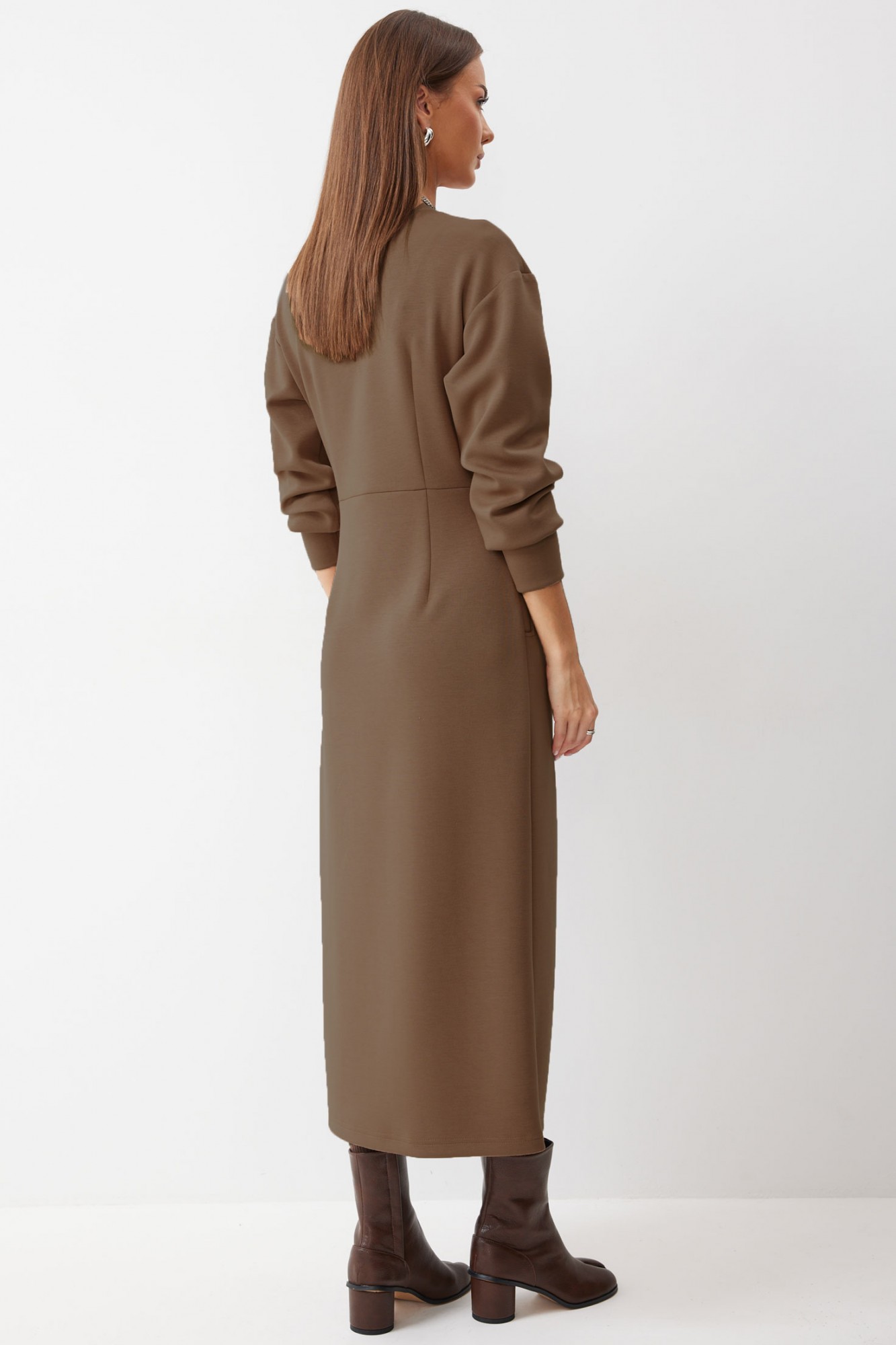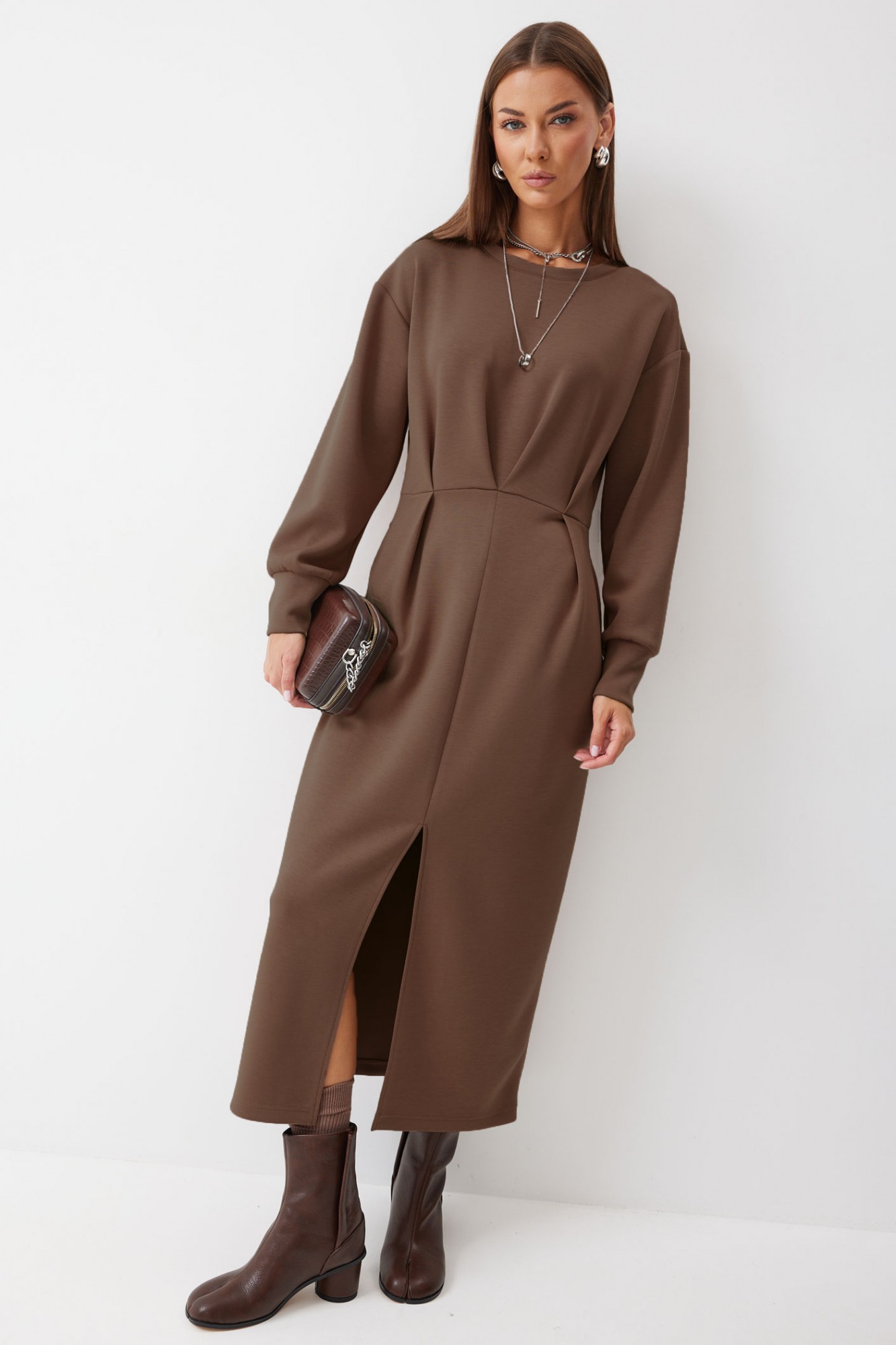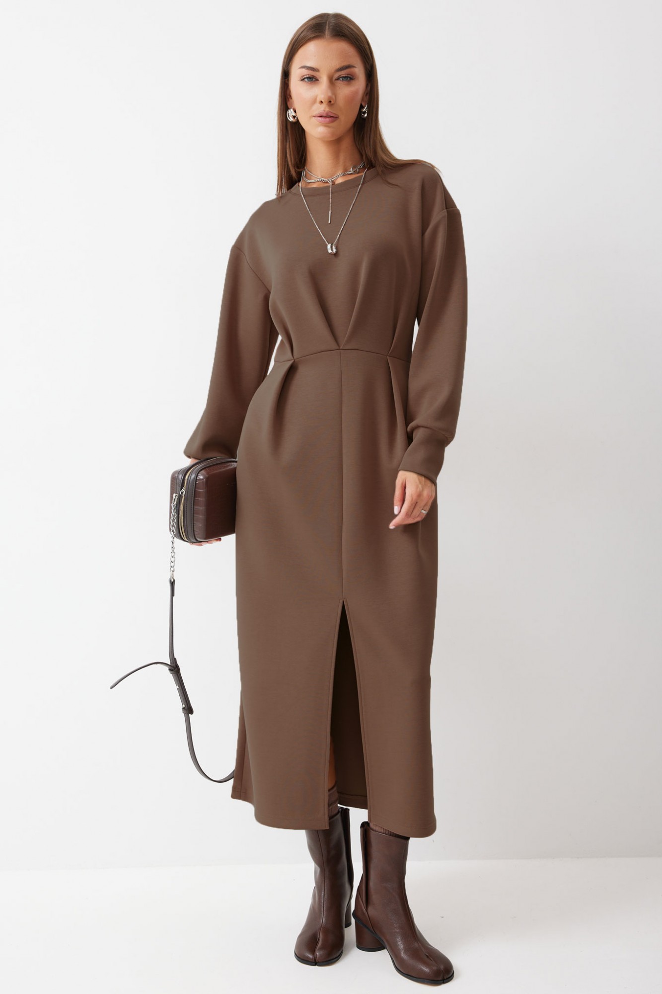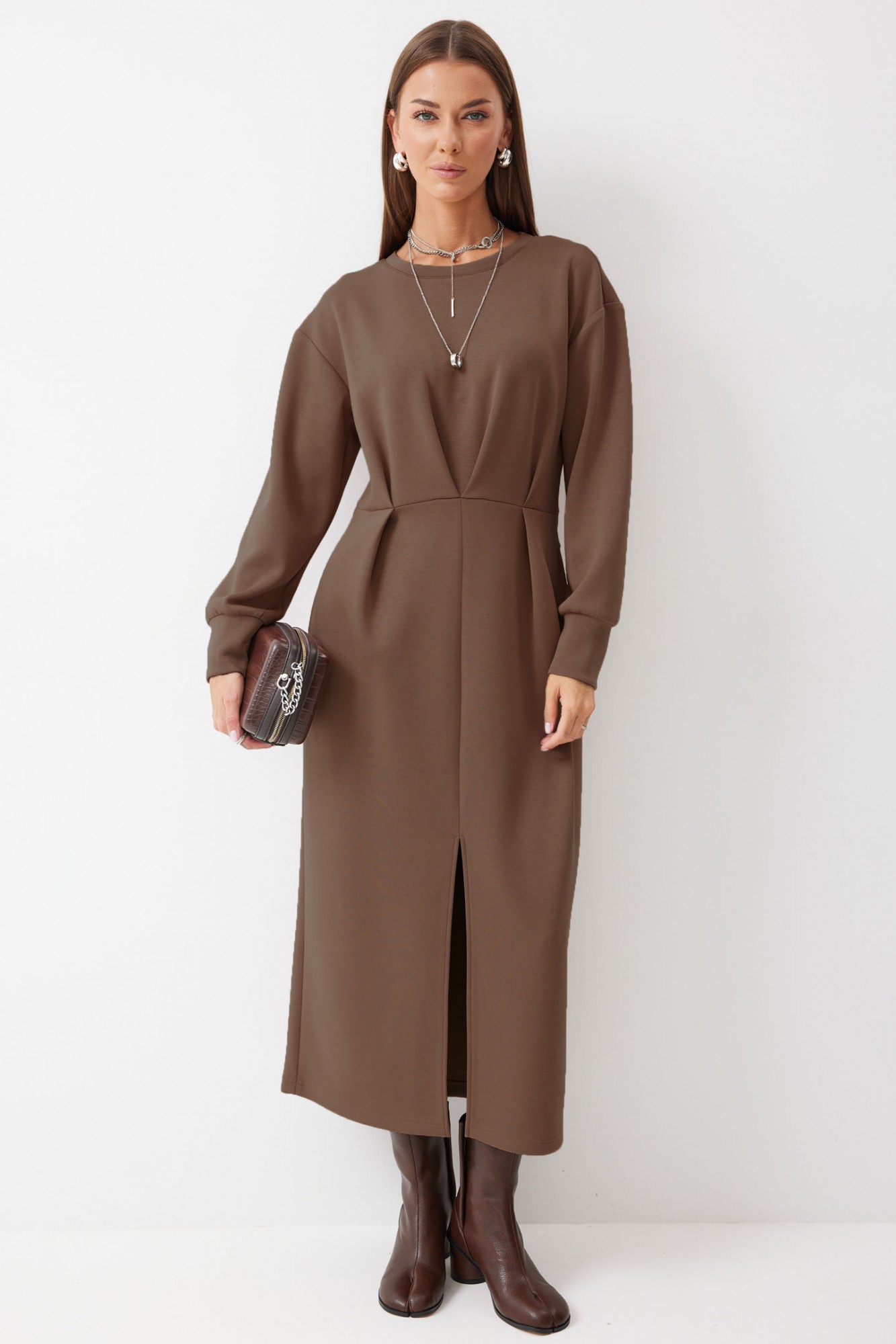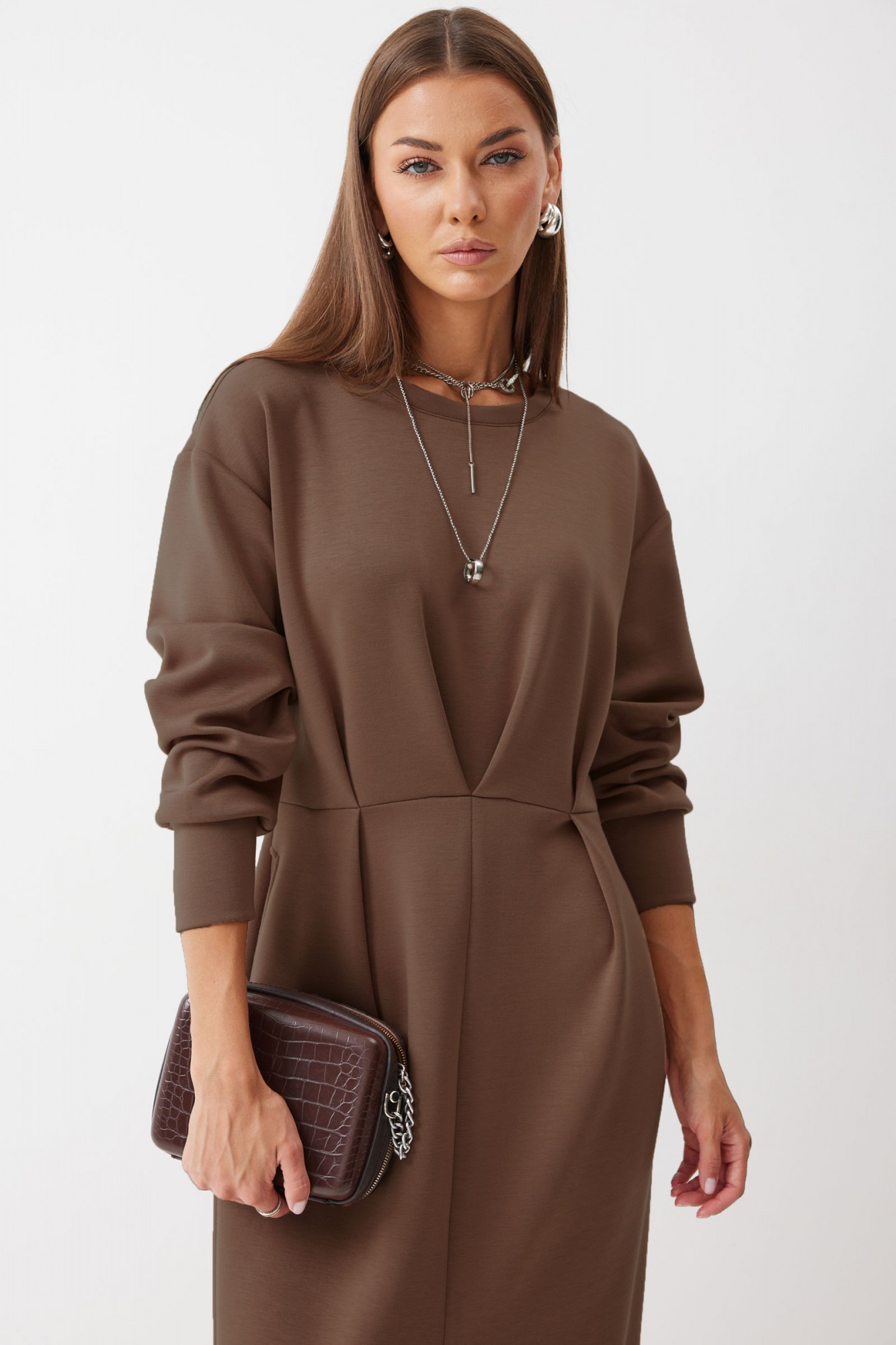 Платье полуприлегающего силуэта из трикотажного полотна. Горловина округлая. Рукав со спущенной линией плеча по низу манжета. Платье отрезное по линии талии. По переду на талии складки. В боковом шве функциональные карманы. В центральном шве юбки разрез.
