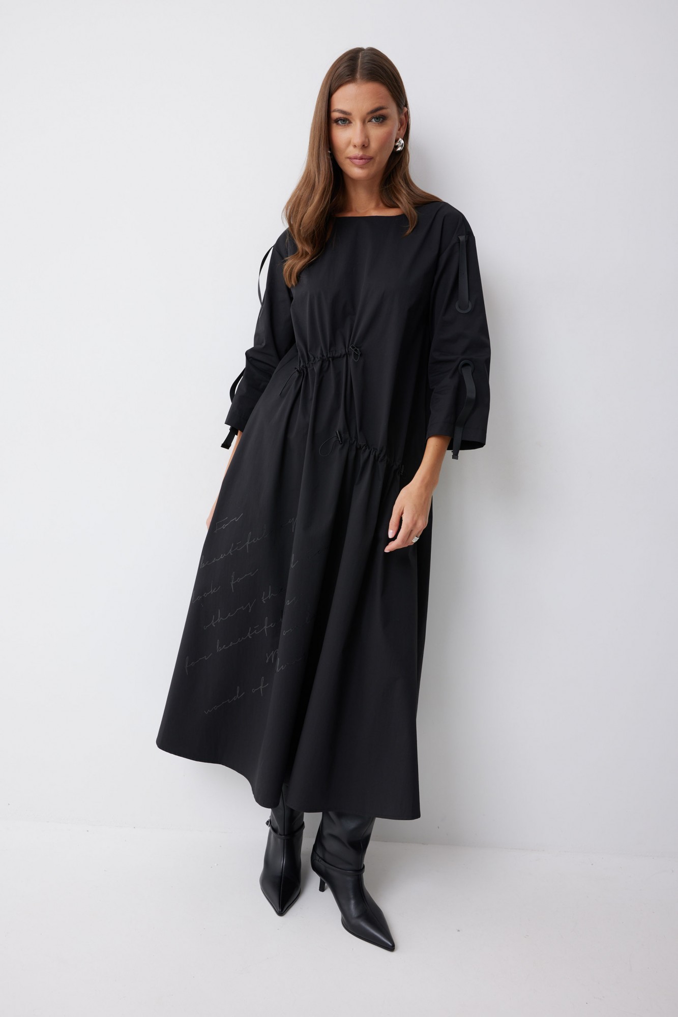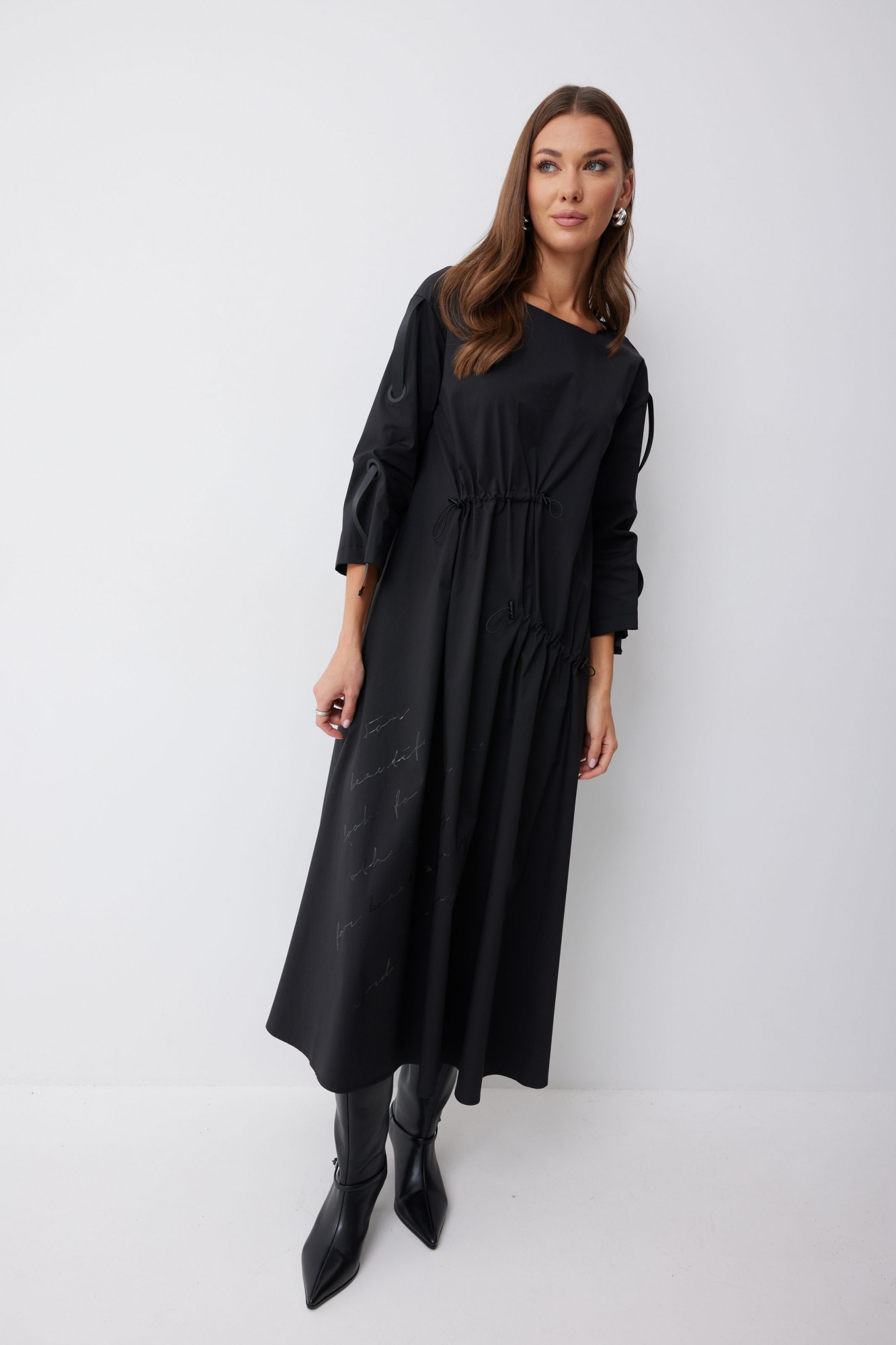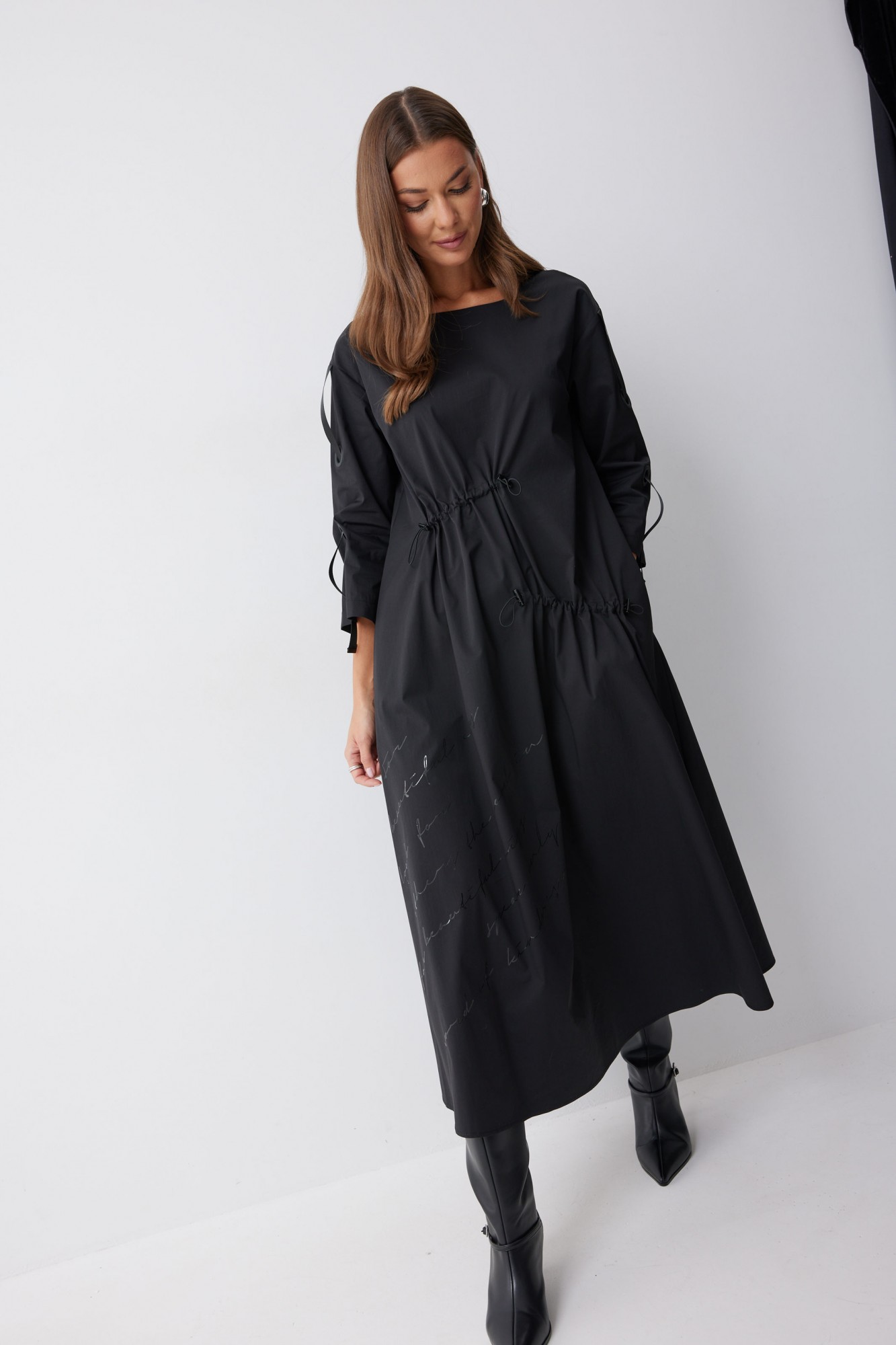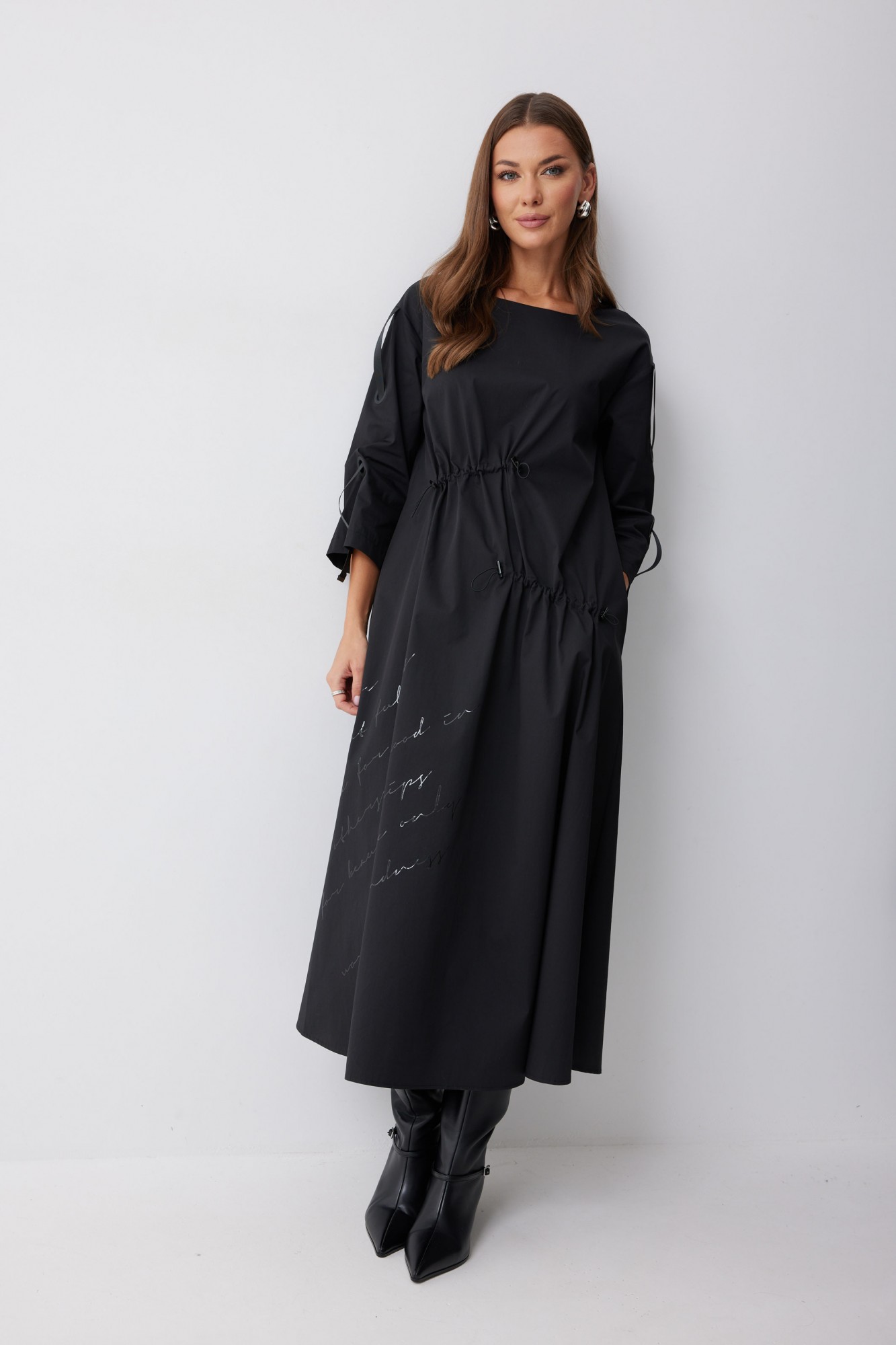 Платье А-силуэта из хлопковой ткани. Горловина округлая, на спинке застежка на молнию. Рукав со спущенной линией плеча длиной 7/8, с декоративными элементами и тесьмой. По переду и спинке декоративные кулисы с фиксаторами для регулирования степени прилегания изделия. По переду дизайнерская печать. Обращаем ваше внимание, что фурнитура может отличаться от фото.