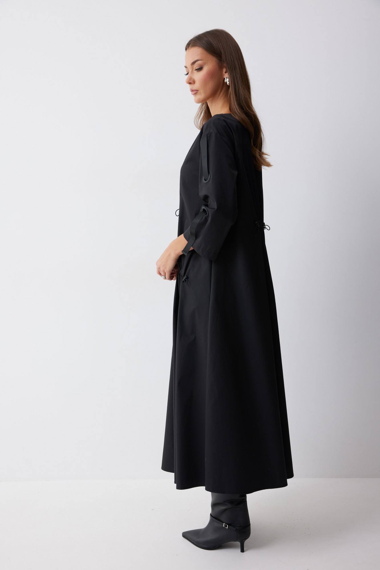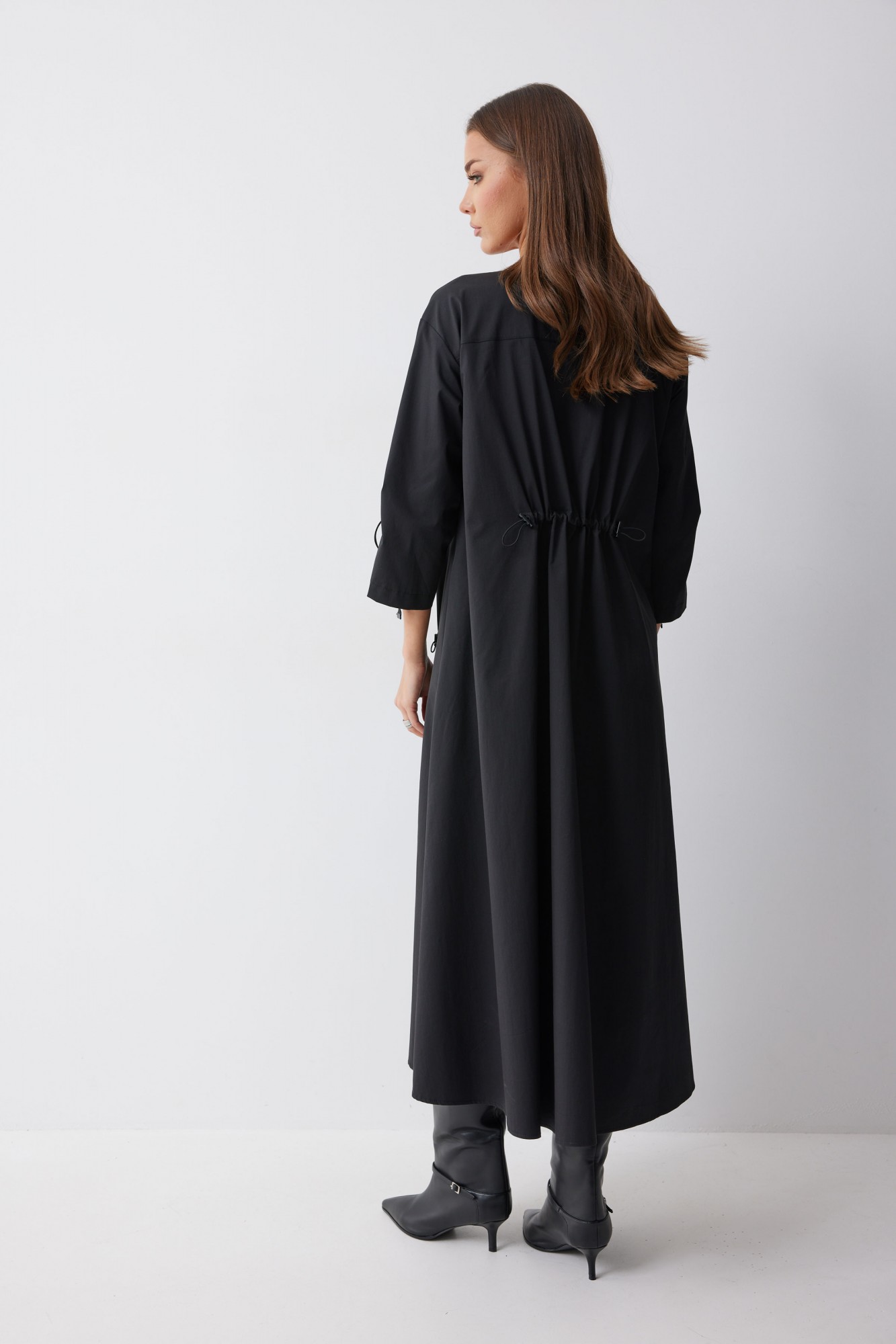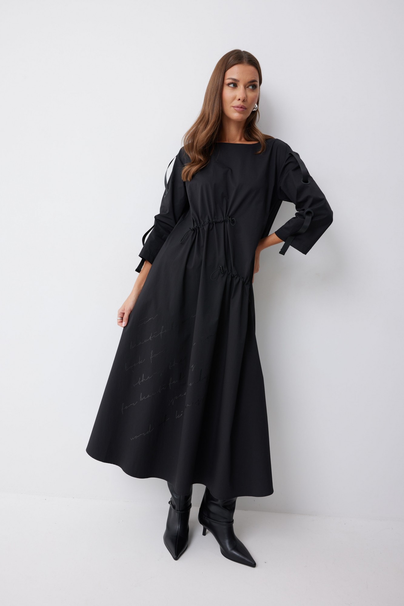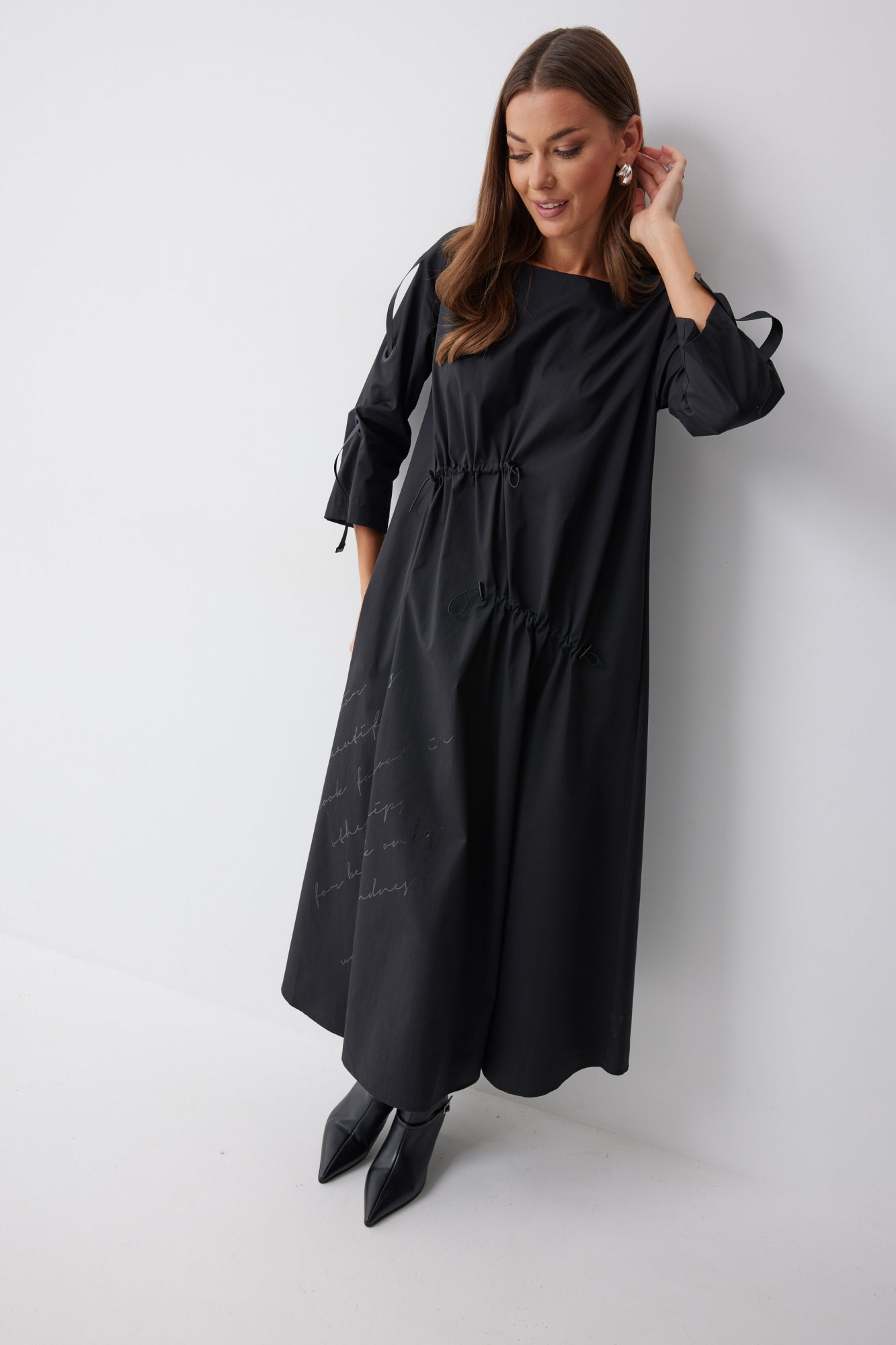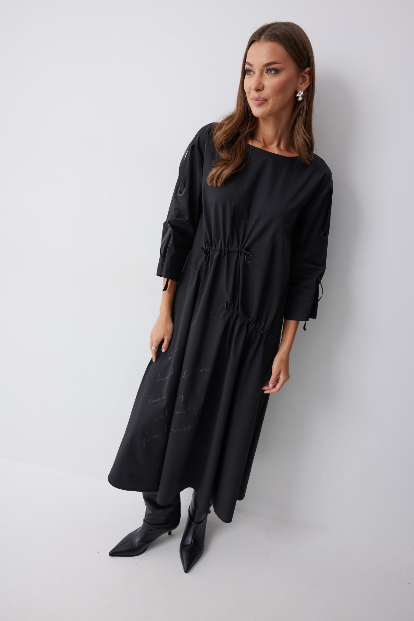 Платье А-силуэта из хлопковой ткани. Горловина округлая, на спинке застежка на молнию. Рукав со спущенной линией плеча длиной 7/8, с декоративными элементами и тесьмой. По переду и спинке декоративные кулисы с фиксаторами для регулирования степени прилегания изделия. По переду дизайнерская печать. Обращаем ваше внимание, что фурнитура может отличаться от фото.