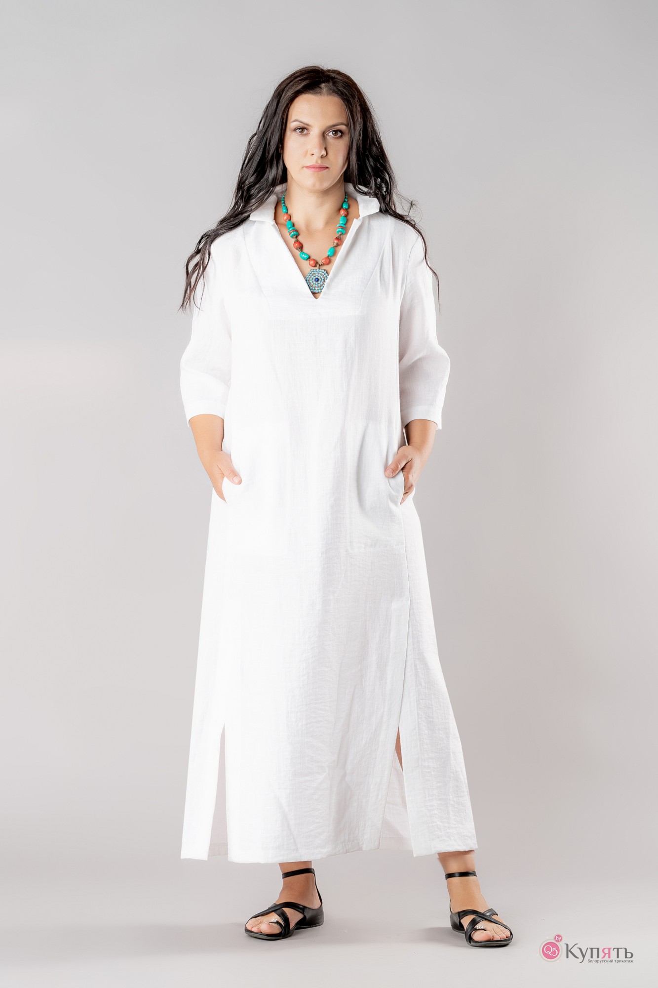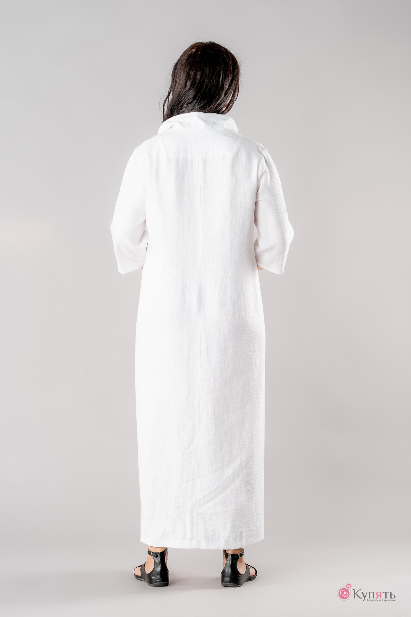Просторное платье свободной формы. Если Вы любите натуральные материалы, эклектику и "бохо" - то это изделие для Вас. Платье полуприлегающего силуэта из льняной ткани с эффектом помятости. Полочка с вертикальными рельефами, в нижней части которой расположены шлицы. В швах этих же рельефов обработаны карманы. Спинка со средним швом и декоративным втачным элементом в верхней части. В верхней части полочки - разрез. Воротник втачной. Рукав втачной из двух частей. Уход без особенностей.