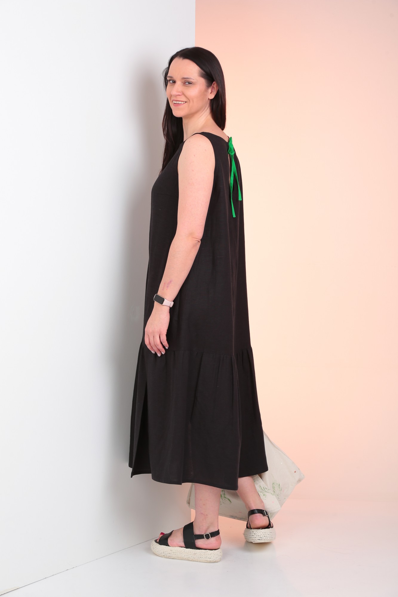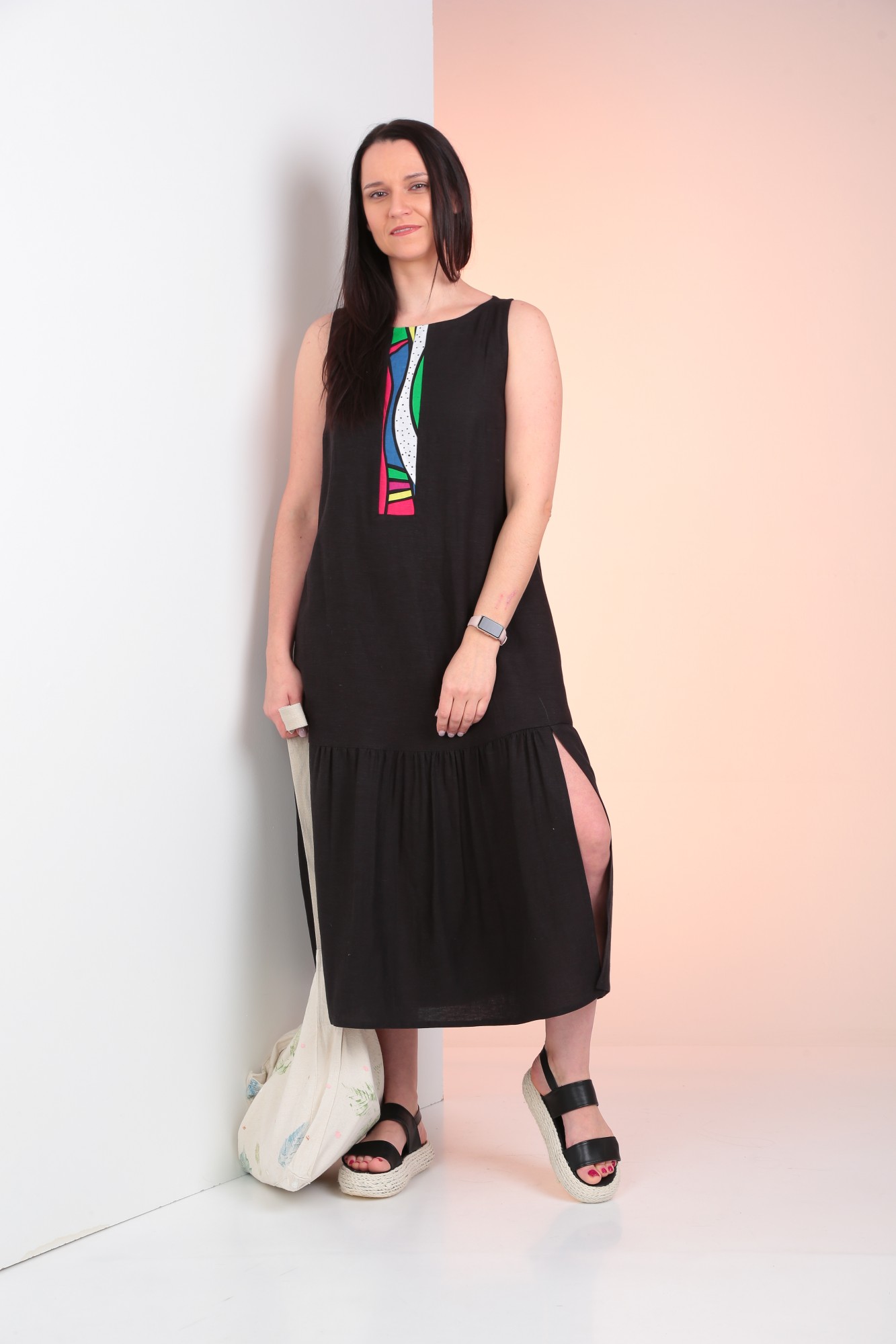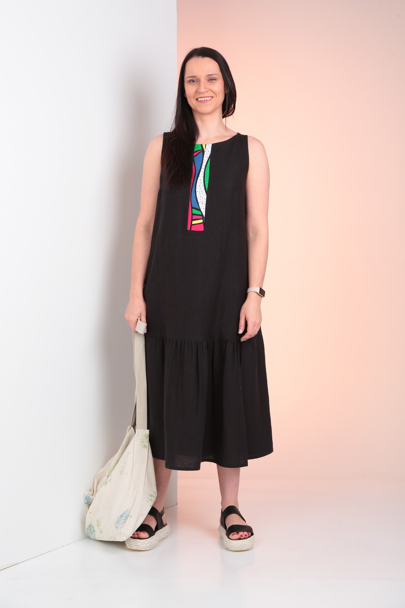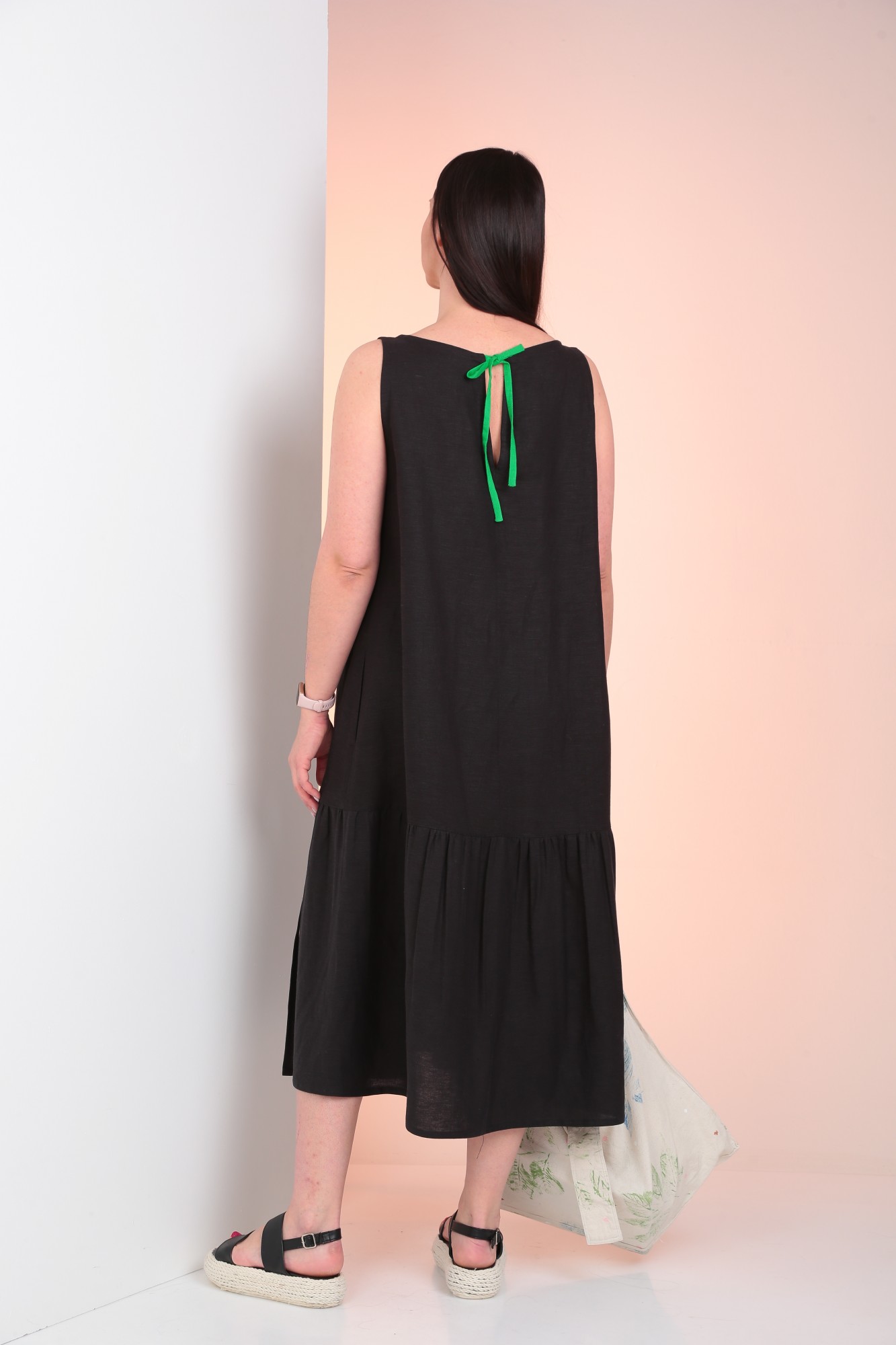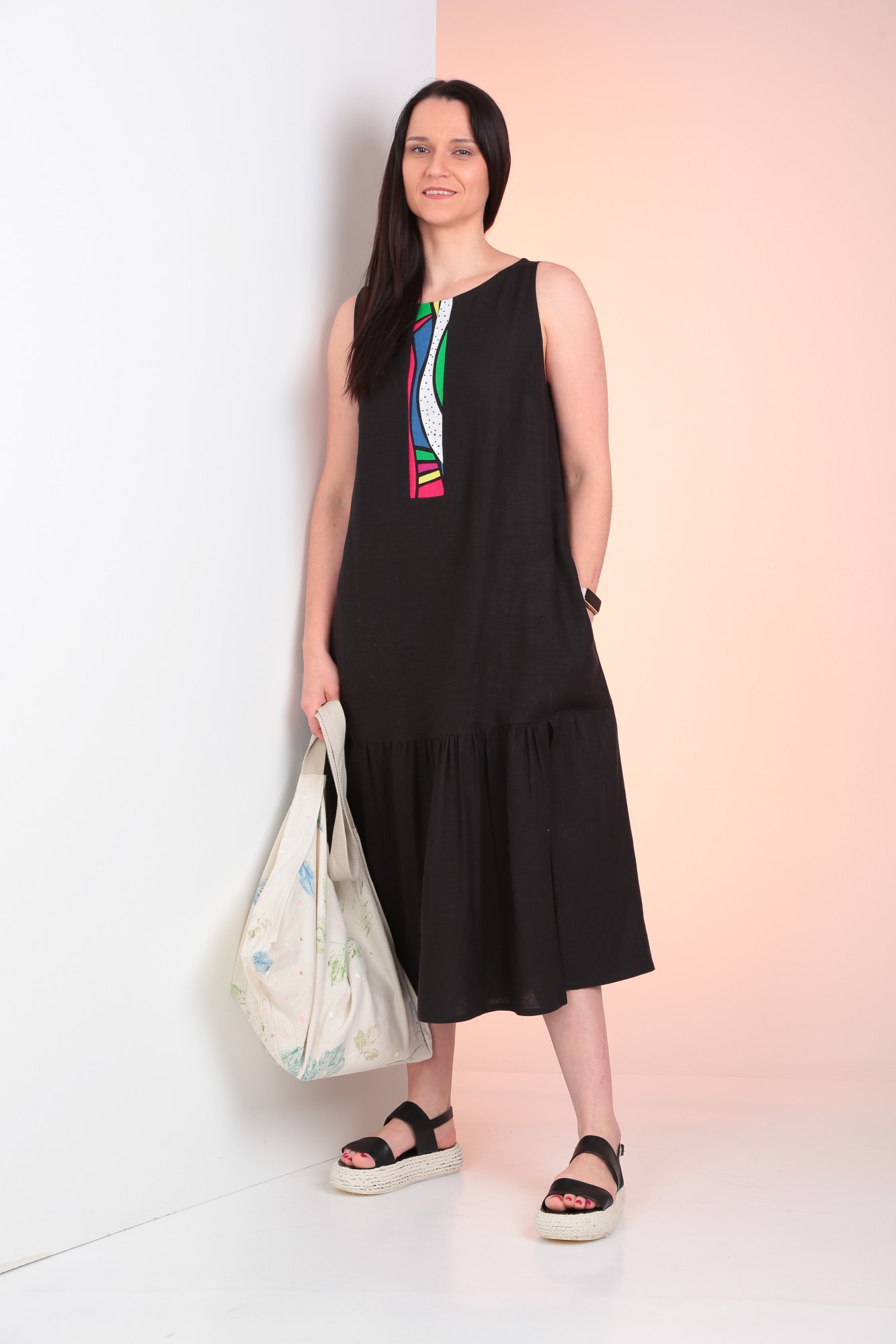 Платье А-силуэта без рукавов. По низу отрезная деталь на сборке. По переду декоративная вставка. В боковых швах обработаны карманы.
