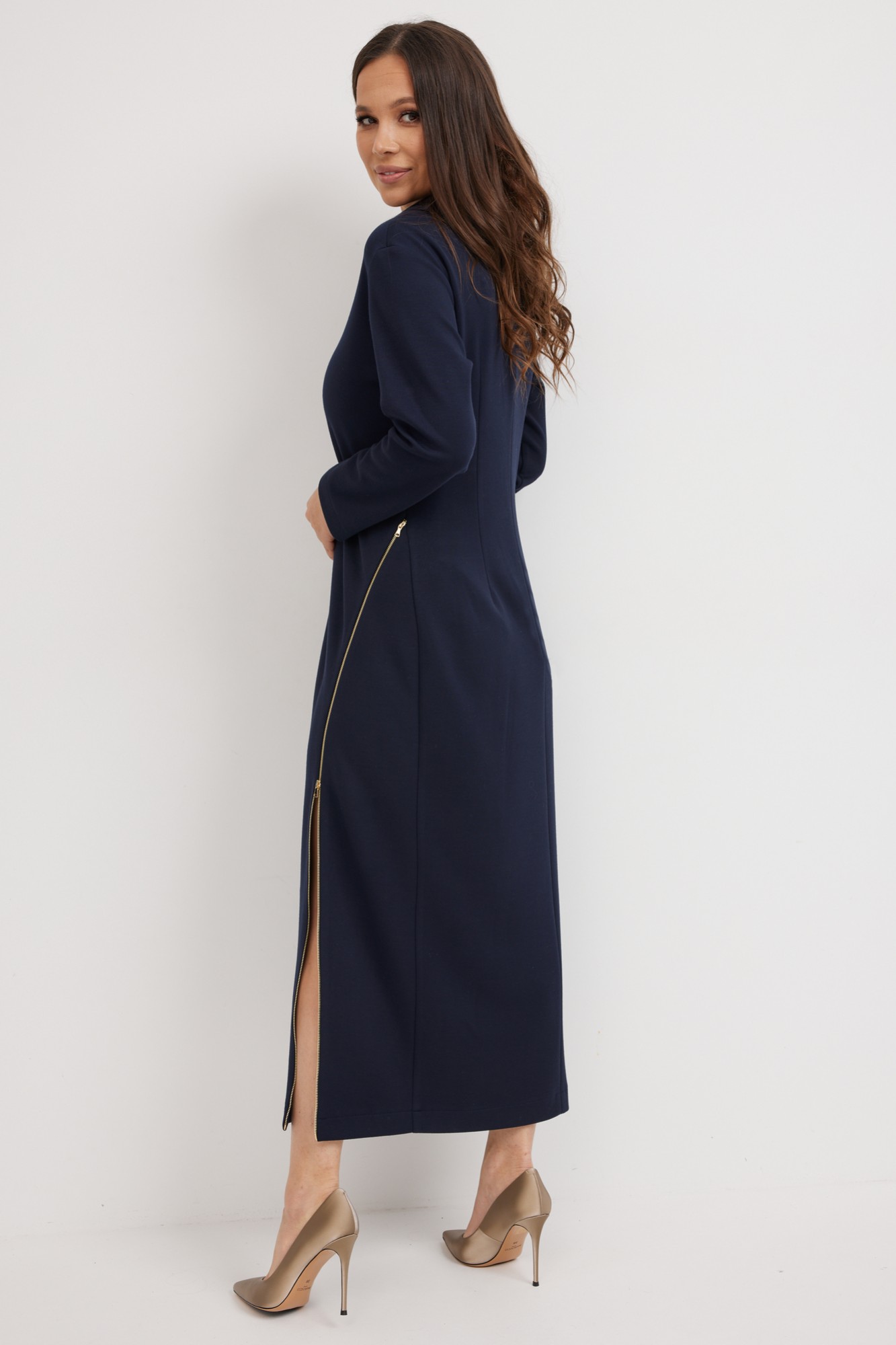Элегантное и стильное платье миди полуприлегающего силуэта. Выполнено из приятного к телу комфортного гладкого трикотажного полотна. Рукав втачной, полной длины. Украшением платья являются функциональные тесьмы молнии. С их помощью можно стильно уложить воротник и отрегулировать вырез платья. Из лаконичного базового платье легко трансформируется в стильное и сексуальное.