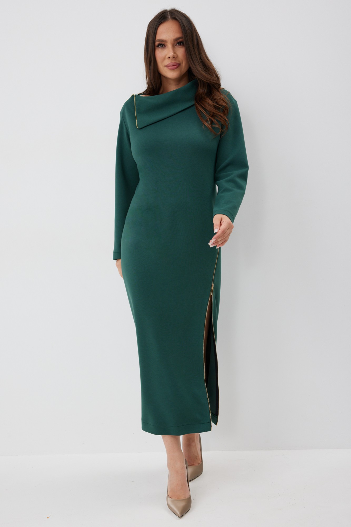 Элегантное и стильное платье миди полуприлегающего силуэта. Выполнено из приятного к телу комфортного гладкого трикотажного полотна. Рукав втачной, полной длины. Украшением платья являются функциональные тесьмы молнии. С их помощью можно стильно уложить воротник и отрегулировать вырез платья. Из лаконичного базового платье легко трансформируется в стильное и сексуальное.