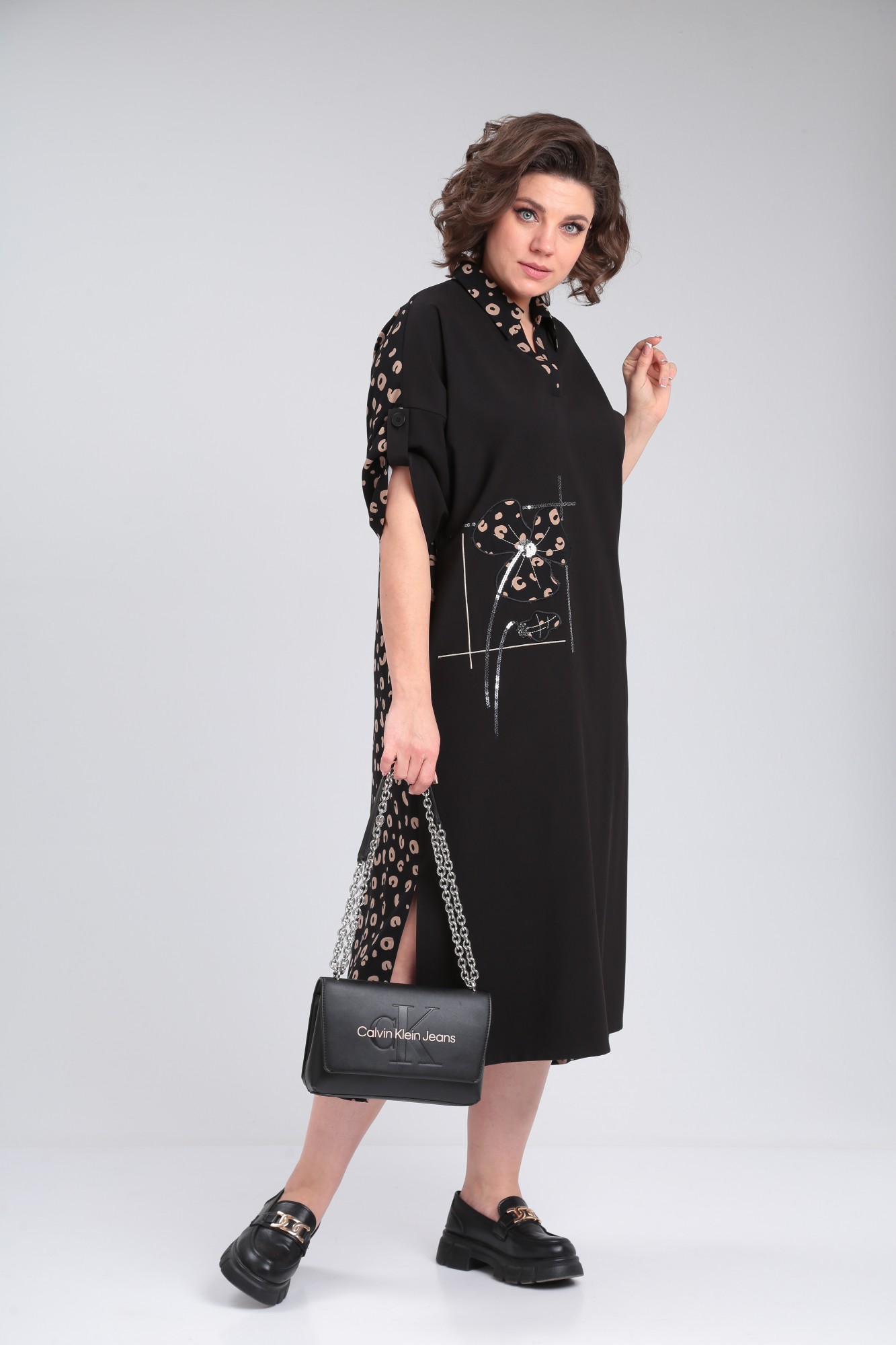 Универсальное платье в стиле «casual». Изделие выполнено из двух скомпонованных материалов — однотона и леопард. Перед и спинка цельнокроеные, спинка длиннее переда. Горловина с рубашечным воротником и V-образным вырезом. Плечо спущенное, рукав втачной длиной 3/4, застегивающийся на пату и пуговицу. По верху спинки имеется стачная встречная складка, благодаря которой имеется небольшое клешение. По переду платье украшено вышивкой из пайеток и ткани-компаньона. В боковых швах имеются карманы, а также боковые разрезы. Изделие может сочетаться как с кедами, лоферами, так и туфлями. Универсальность и практичность платья сделают его любимым в Вашем гардеробе в наступающем сезоне.