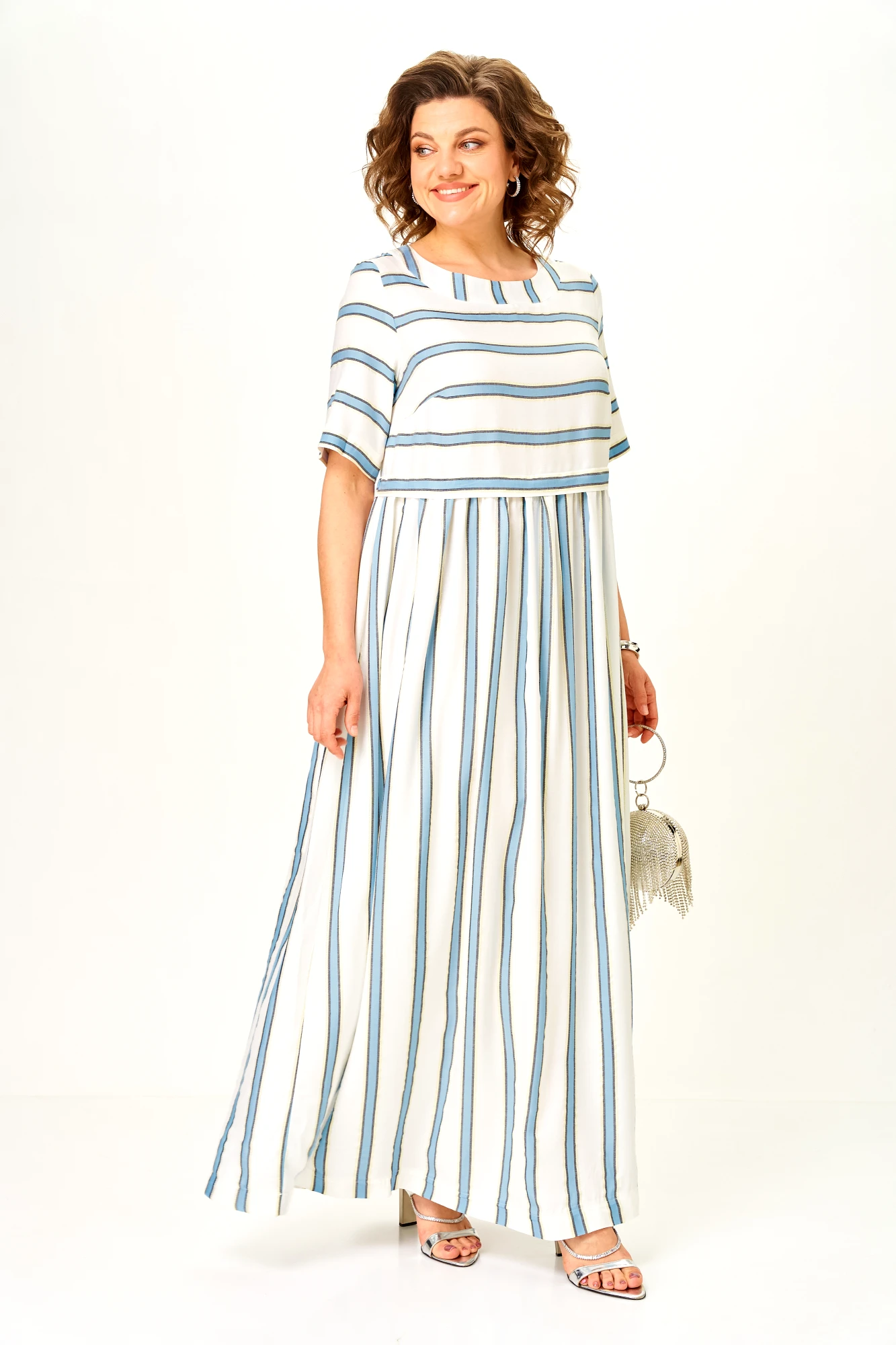 Вертикальная полоска визуально вытягивает силуэт и стройнит, а свободный крой с мягкой сборкой не утяжеляет фигуру и не акцентирует живот.