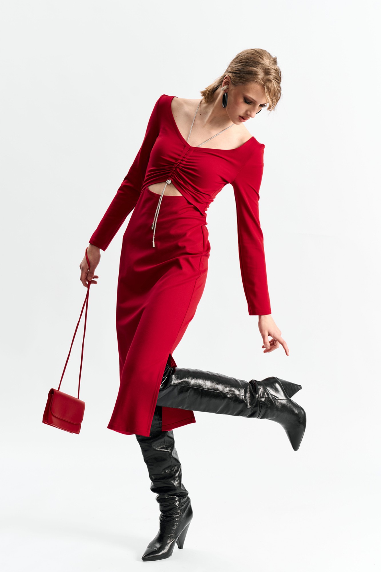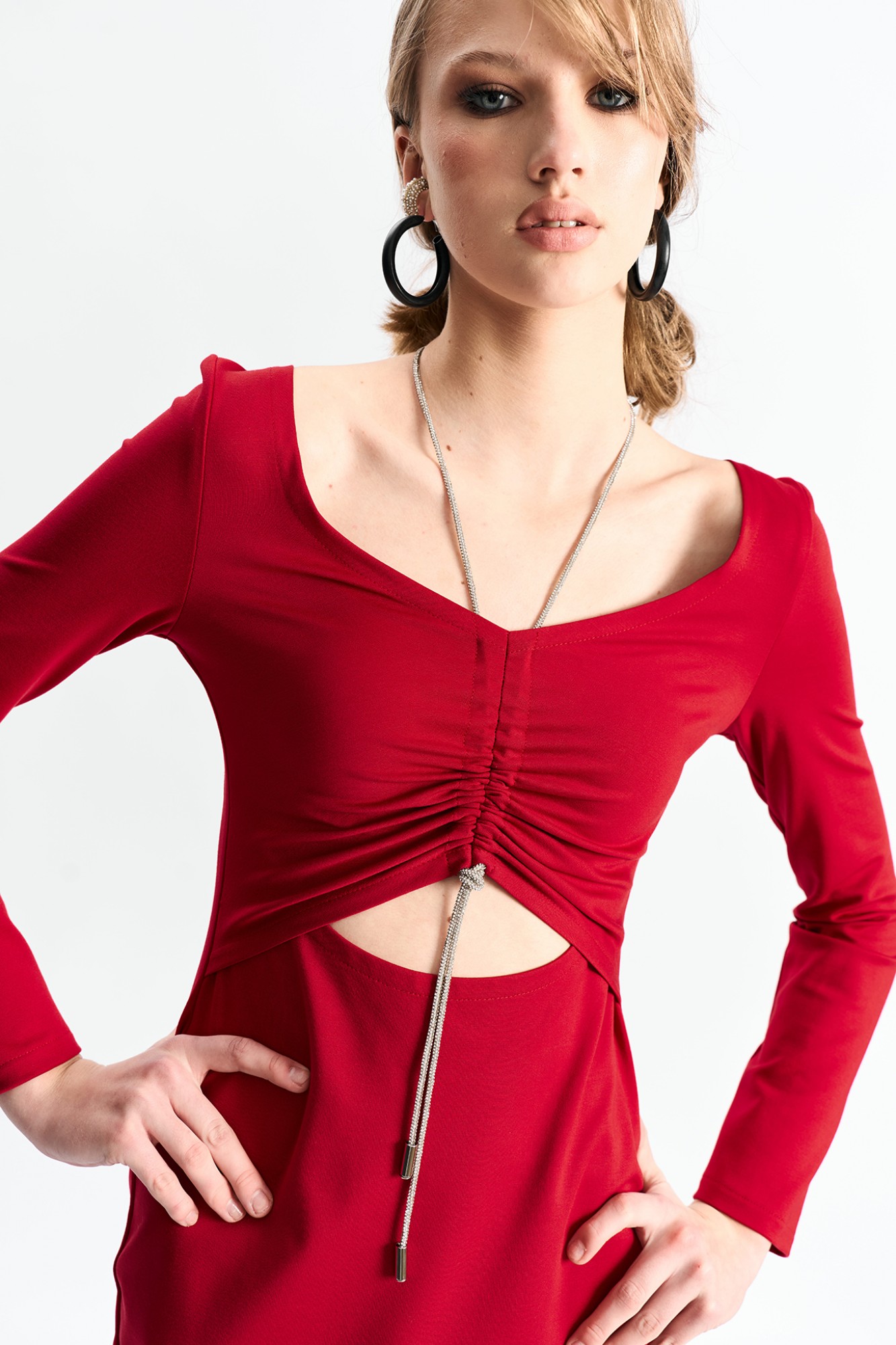 Платье прилегающего силуэта с подрезом в области талии и декоративным шнуром со стразами с затяжкой по груди.