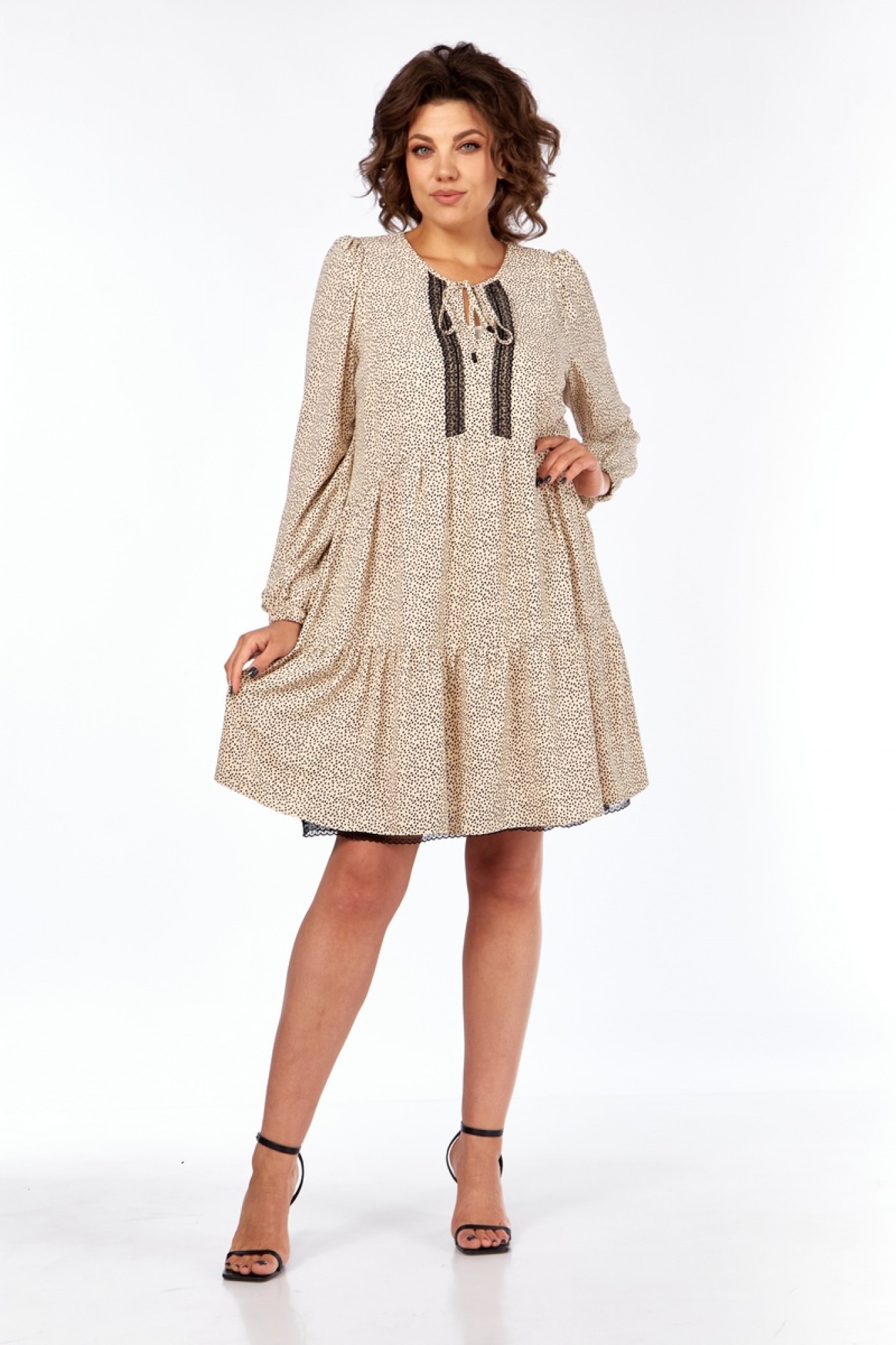 Платье женское свободного силуэта. Округлый вырез горловины, на завязках. Рукав втачной, со сборкой, по низу-на резинке. Изделие с подрезами, со сборкой. По спинке-декоративный вырез с кружевом. Нижний валан платье выполнен из сетки с кружевом. Подкладкой служит-нижнее платье на бретелях.