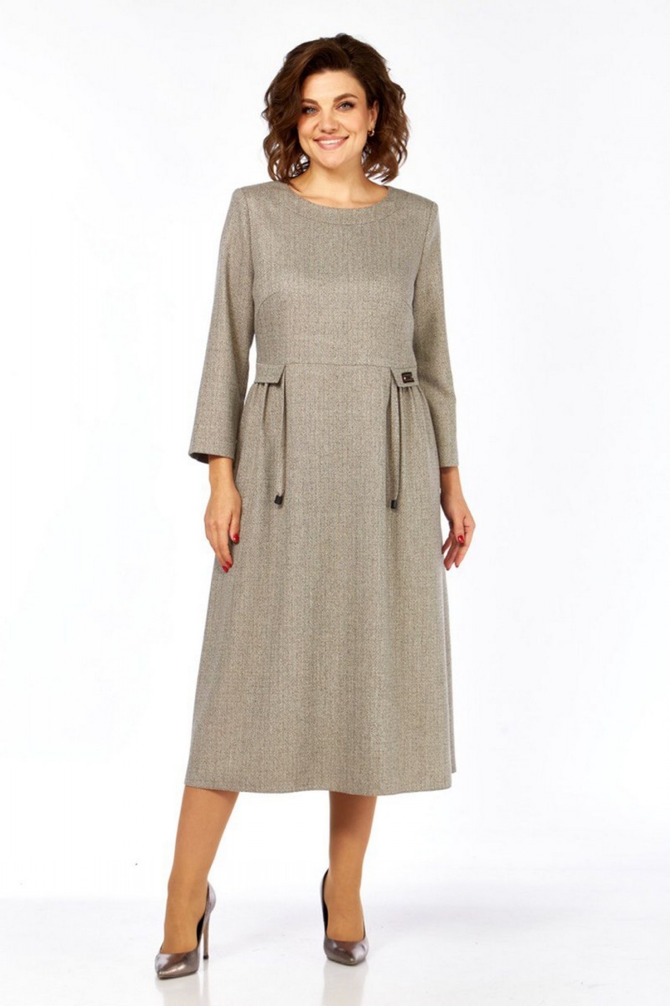 Платье свободного силуэта, длины миди, без подкладки. Горловина обработана широкой бейкой из основной ткани, по груди вытачки для лучшего прилегания. Платье отрезное по линии талии, со втачной отделочной деталью с декоративным хлястиком, юбка со сборкой на уровне отделочной детали, карманы-хулиганы в боковых швах. Рукав ¾.