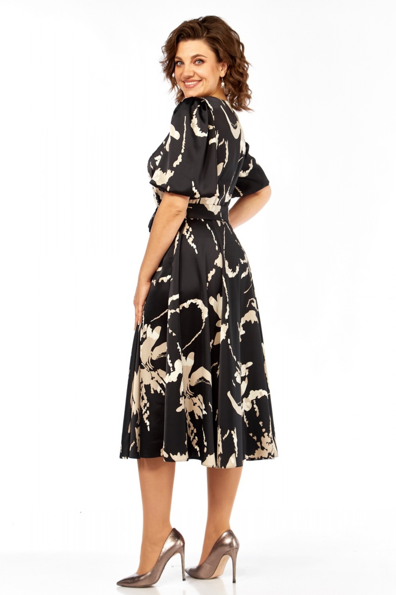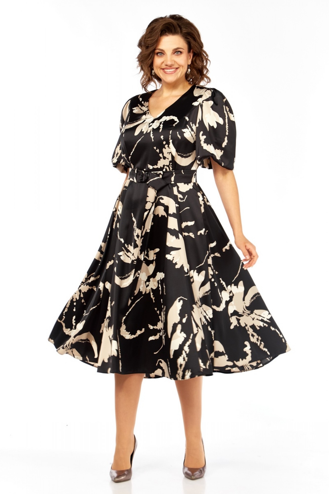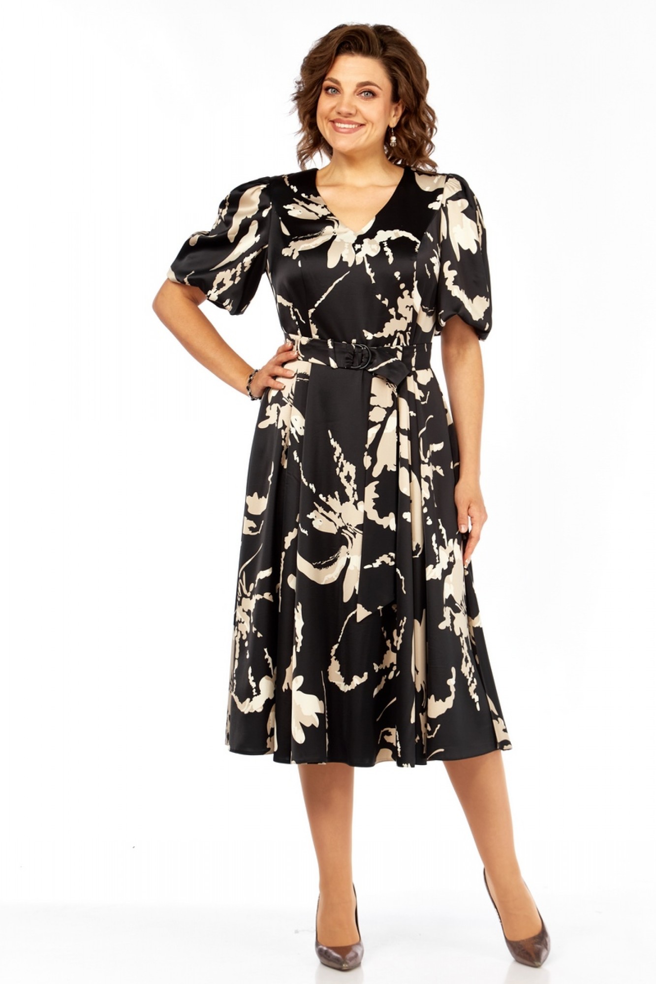 Платье полуприлегающего силуэта, без подкладки, длины миди. V-образный вырез горловины, рельефы по груди. Рукав-фонарик. Платье отрезное по линии талии, юбка-шестиклинка. Сбоку застежка на молнию. В комплекте идет пояс с пряжкой из основной ткани.